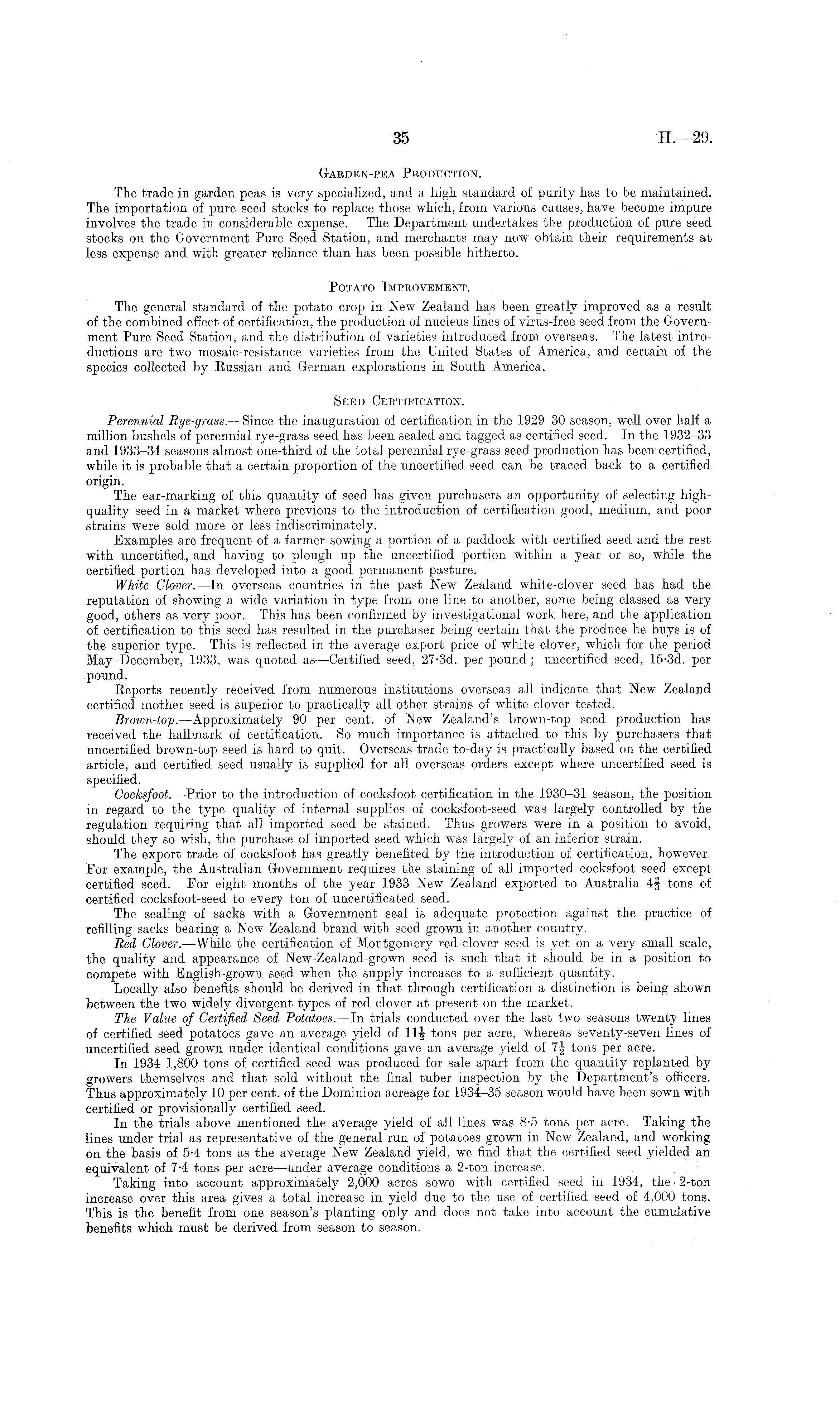 Garden-pea Production. The trade in garden peas is very specialized, and a high, standard of purity has to be maintained. The importation of pure seed stocks to replace those which, from various causes, have become impure involves the trade in considerable expense. The Department undertakes the production of pure seed stocks on the Government Pure Seed Station, and merchants may now obtain their requirements at less expense and with greater reliance than has been possible hitherto. Potato Improvement. The general standard of the potato crop in New Zealand has been greatly improved as a result of the combined effect of certification, the production of nucleus lines of virus-free seed from the Government Pure Seed Station, and the distribution of varieties introduced from overseas. The latest introductions are two mosaic-resistance varieties from the United States of America, and certain of the species collected by Russian and German explorations in South America. Seed Certification. Perennial Rye-grass. —Since the inauguration of certification in the 1929-30 season, well over half a million bushels of perennial rye-grass seed has been sealed and tagged as certified seed. In the 1932-33 and 1933-34 seasons almost one-third of the total perennial rye-grass seed production has been certified, while it is probable that a certain proportion of the uncertified seed can be traced back to a certified origin. The ear-marking of this quantity of seed has given purchasers an opportunity of selecting highquality seed in a market where previous to the introduction of certification good, medium, and poor strains were sold more or less indiscriminately. Examples are frequent of a farmer sowing a portion of a paddock with certified seed and the rest with uncertified, and having to plough up the uncertified portion within a year or so, while the certified portion has into a good permanent pasture. White Clover. —In overseas countries in the past New Zealand white-clover seed has had the reputation of showing a wide variation in type from one line to another, some being classed as very good, others as very poor. This has been confirmed by investigational work here, and the application of certification to this seed has resulted in the purchaser being certain that the produce he buys is of the superior type. This is reflected in the average export price of white clover, which for the period May-December, 1933, was quoted as —Certified seed, 27-3 d. per pound ; uncertified seed, 15-3 d. per pound. Reports recently received from numerous institutions overseas all indicate that New Zealand certified mother seed is superior to practically all other strains of white clover tested. Brown-top. —Approximately 90 per cent, of New Zealand's brown-top seed production has received the hallmark of certification. So much importance is attached to this by purchasers that uncertified brown-top seed is hard to quit. Overseas trade to-day is practically based on the certified article, and certified seed usually is supplied for all overseas orders except where uncertified seed is specified. Cocksfoot. —Prior to the introduction of cocksfoot certification in the 1930-31 season, the position in regard to the type quality of internal supplies of cocksfoot-seed was largely controlled by the regulation requiring that all imported seed be stained. Thus growers were in a position to avoid, should they so wish, the purchase of imported seed which was largely of an inferior strain. The export trade of cocksfoot has greatly benefited by the introduction of certification, however, For example, the Australian Government requires the staining of all imported cocksfoot seed except certified seed. For eight months of the year 1933 New Zealand exported to Australia 4§ tons of certified cocksfoot-seed to every ton of uncertificated seed. The sealing of sacks with a Government seal is adequate protection against the practice of refilling sacks bearing a New Zealand brand with seed grown in another country. Red Clover. —While the certification of Montgomery red-clover seed is yet on a very small scale, the quality and appearance of New-Zealand-grown seed is such that it should be in a position to compete with English-grown seed when the supply increases to a sufficient quantity. Locally also benefits should be derived in that through certification a distinction is being shown between the two widely divergent types of red clover at present on the market. The Value of Certified Seed Potatoes. —In trials conducted over the last two seasons twenty lines of certified seed potatoes gave an average yield of 11| tons per acre, whereas seventy-seven lines of uncertified seed grown under identical conditions gave an average yield of 1\ tons per acre. In 1934 1,800 tons of certified seed was produced for sale apart from the quantity replanted by growers themselves and that sold without the final tuber inspection by the Department's officers. Thus approximately 10 per cent, of the Dominion acreage for 1934-35 season would have been sown with certified or provisionally certified seed. In the trials above mentioned the average yield of all lines was 8-5 tons per acre. Taking the lines under trial as representative of the general run of potatoes grown in New Zealand, and working on the basis of 5-4 tons as the average New Zealand yield, we find that the certified seed yielded an equivalent of 74 tons per acre —under average conditions a 2-ton increase. Taking into account approximately 2,000 acres sown with certified seed in 1934, the 2-ton increase over this area gives a total increase in yield due to the use of certified seed of 4,000 tons. This is the benefit from one season's planting only and does not take into account the cumulative benefits which must be derived from season to season.