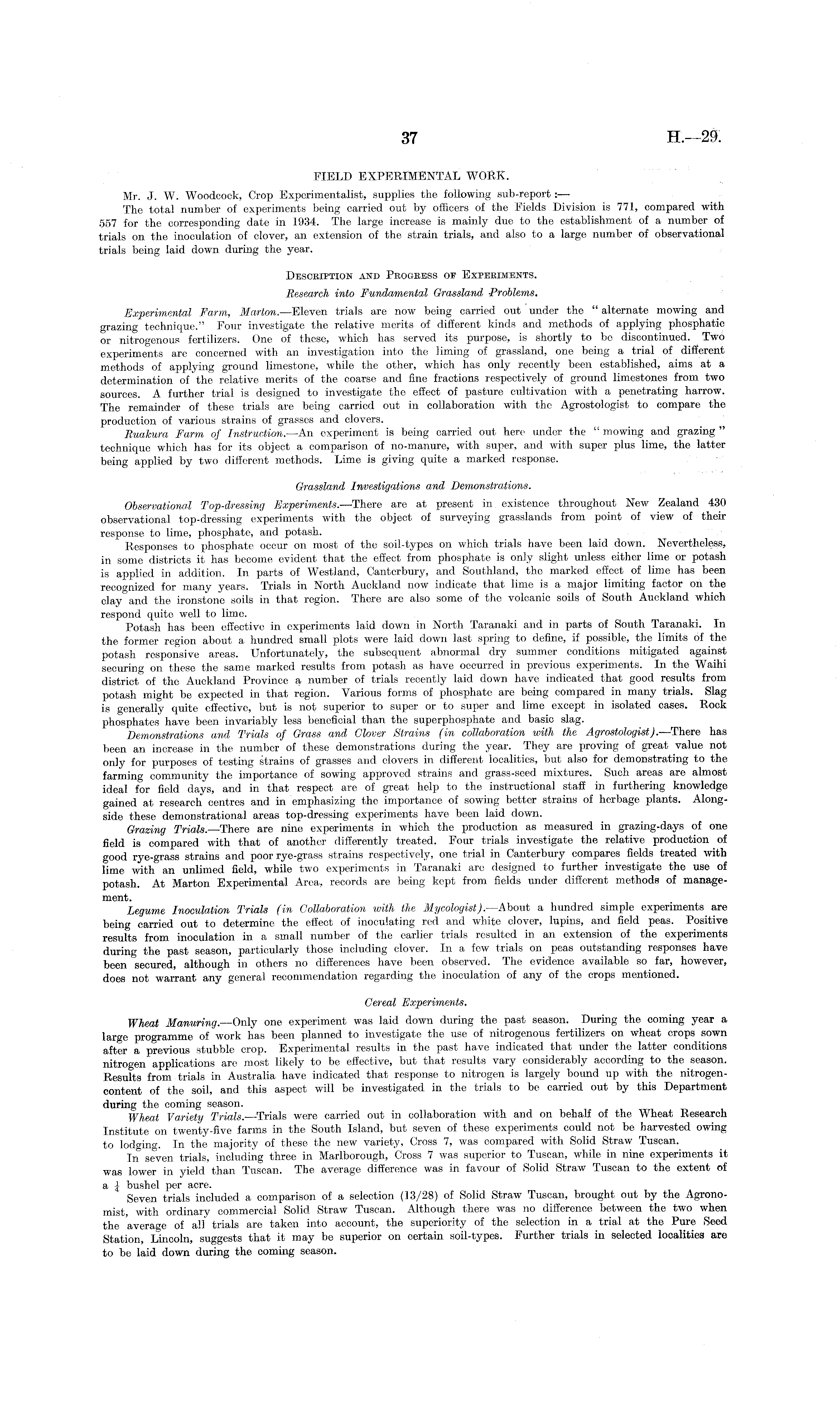 FIELD EXPERIMENTAL WORK. Mr. J. W. Woodcock, Crop Experimentalist, supplies tlie following sub-report:— The total number of experiments being carried out by officers of the Fields Division is 771, compared with 557 for the corresponding date in 1934. The large increase is mainly due to the establishment of a number of trials on the inoculation of clover, an extension of the strain trials, and also to a large number of observational trials being laid down during the year. Description and Progress of Experiments. Research into Fundamental Grassland Problems. Experimental Farm, Marton.—Eleven trials are now being carried out under the " alternate mowing and grazing technique." Four investigate the relative merits of different kinds and methods of applying phosphatic or nitrogenous fertilizers. One of these, which has served its purpose, is shortly to be discontinued. Two experiments are concerned with an investigation into the liming of grassland, one being a trial of different methods of applying ground limestone, while the other, which has only recently been established, aims at a determination of the relative merits of the coarse and fine fractions respectively of ground limestones from two sources. A further trial is designed to investigate the effect of pasture cultivation with a penetrating harrow. The remainder of these trials are being carried out in collaboration with the Agrostologist to compare the production of various strains of grasses and clovers. Ruakura Farm of Instruction. —An experiment is being carried out here under the " mowing and grazing " technique which has for its object a comparison of no-manure, with super, and with super plus lime, the latter being applied by two different methods. Lime is giving quite a marked response. Grassland Investigations and Demonstrations. Observational Top-dressing Experiments.—There are at present in. existence throughout New Zealand 430 observational top-dressing experiments with the object of surveying grasslands from point of view of their response to lime, phosphate, and potash. Responses to phosphate occur on most of the soil-types on which trials have been laid down. Nevertheless, in some districts it has become evident that the effect from phosphate is only slight unless either lime or potash is applied in addition. In parts of Westland, Canterbury, and Southland, the marked effect of lime has been recognized for many years. Trials in North Auckland now indicate that lime is a major limiting factor on the clay and the ironstone soils in that region. There are also some of the volcanic soils of South Auckland which respond quite well to lime. Potash has been effective in experiments laid down in North Taranaki. and in parts of South Taranaki. In the former region about a hundred small plots were laid down last spring to define, if possible, the limits of the potash responsive areas. Unfortunately, the subsequent abnormal dry summer conditions mitigated against securing on these the same marked results from potash as have occurred in previous experiments. In the Waihi district of the Auckland Province a number of trials recently laid down have indicated that good results from potash might be expected in that region. Various forms of phosphate are being compared in many trials. Slag is generally quite effective, but is not superior to super or to super and lime except in isolated cases. Rook phosphates have been invariably less beneficial than the superphosphate and basic slag. Demonstrations and Trials of Grass and Glover Strains (in collaboration with the Agrostologist).—There has been an increase in the number of these demonstrations during the year. They are proving of great value not only for purposes of testing strains of grasses and clovers in different localities, but also for demonstrating to the farming community the importance of sowing approved strains and grass-seed mixtures. Such areas are almost ideal for field days, and in that respect are of great help to the instructional staff in furthering knowledge gained at research centres and in emphasizing the importance of sowing better strains of herbage plants. Alongside these demonstrational areas top-dressing experiments have been laid down. Grazing Trials.—There are nine experiments in which the production as measured in grazing-days of one field is compared with that of another differently treated. Four trials investigate the relative production of good rye-grass strains and poor rye-grass strains respectively, one trial in Canterbury compares fields treated with lime with an unlimed field, while two experiments in Taranaki are designed to further investigate the use of potash. At Marton Experimental Area, records are being kept from fields under different methods of management. Legume Inoculation Trials (in Collaboration with the Mycologist).—About a hundred simple experiments are being carried out to determine the effect of inoculating red and white clover, lupins, and field peas. Positive results from inoculation in a small number of the earlier trials resulted in an extension of the experiments during the past season, particularly those including clover. In a few trials on peas outstanding responses have been secured, although in others no differences have been observed. The evidence available so far, however, does not warrant any general recommendation regarding the inoculation of any of the crops mentioned. Cereal Experiments. Wheat Manuring.—Only one experiment was laid down during the past season. During the coming year a large programme of work has been planned to investigate the use of nitrogenous fertilizers on wheat crops sown after a previous stubble crop. Experimental results in the past have indicated that under the latter conditions nitrogen applications are most likely to be effective, but that results vary considerably according to the season. Results from trials in Australia have indicated that response to nitrogen is largely boun