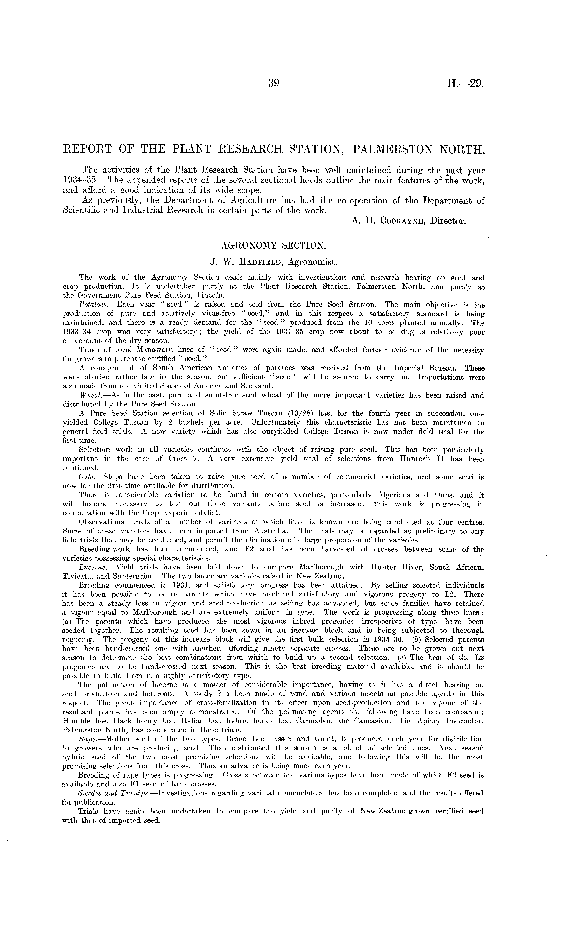 REPORT OF THE PLANT RESEARCH STATION, PALMERSTON NORTH. The activities of the Plant Research Station have been well maintained during the past year 1934-35. The appended reports of the several sectional heads outline the main features of the work, and afford a good indication of its wide scope. As previously, the Department of Agriculture has had the co-operation of the Department of Scientific and Industrial Research in certain parts of the work. A. H. Cockayne, Director. AGRONOMY SECTION. J. W. Hadfield, Agronomist. The work of the Agronomy Section deals mainly with investigations and research bearing on seed and crop production. It is undertaken partly at the Plant Research Station, Palmerston North, and partly at the Government Pure Peed Station, Lincoln. Potatoes. —Each year " seed" is raised and sold from the Pure Seed Station. The main objective is the production of pure and relatively virus-free " seed," and in this respect a satisfactory standard is being maintained, and there is a ready demand for the "seed" produced from the 10 acres planted annually. The 1933-34 crop was very satisfactory; the yield of the 1934-35 crop now about to be dug is relatively poor on account of the dry season. Trials of local Manawatu lines of "seed" were again made, and afforded further evidence of the necessity for growers to purchase certified " seed." A consignment of South American varieties of potatoes was received from the Imperial Bureau. These were planted rather late in the season, but sufficient " seed" will be secured to carry on. Importations were also made from the United States of America and Scotland. Wheat. —As in the past, pure and smut-free seed wheat of the more important varieties has been raised and distributed by the Pure Seed Station. A Pure Seed Station selection of Solid Straw Tuscan (13/28) has, for the fourth year in succession, outyielded College Tuscan by 2 bushels per acre. Unfortunately this characteristic has not been maintained in general field trials. A new variety which has also outyielded College Tuscan is now under field trial for the first time. Selection work in all varieties continues with the object of raising pure seed. This has been particularly important in the case of Cross 7. A very extensive yield trial of selections from Hunter's II has been continued. Oats.—Steps have been taken to raise pure seed of a number of commercial varieties, and some seed is now for the first time available for distribution. There is considerable variation to be found in certain varieties, particularly Algerians and Duns, and it will become necessary to test out these variants before seed is increased. This work is progressing in co-operation with the Crop Experimentalist. Observational trials of a number of varieties of which little is known are being conducted at four centres. Some of these varieties have been imported from Australia. The trials may be regarded as preliminary to any field trials that may be conducted, and permit the elimination of a large proportion of the varieties. Breeding-work has been commenced, and E2 seed has been harvested of crosses between some of the varieties possessing special characteristics. Lucerne. —Yield trials have been laid down to compare Marlborough with Hunter River, South African, Tivicata, and Subtergrim. The two latter are varieties raised in New Zealand. Breeding commenced in 1931, and satisfactory progress has been attained. By selfing selected individuals it has been possible to locate parents which have produced satisfactory and vigorous progeny to L2. There has been a steady loss in vigour and seed-production as selfing has advanced, but some families have retained a vigour equal to Marlborough and are extremely uniform in type. The work is progressing along three lines : (a) The parents which have produced the most vigorous inbred progenies—irrespective of type —have been seeded together. The resulting seed has been sown in an increase block and is being subjected to thorough rogueing. The progeny of this increase block will give the first bulk selection in 1935-36. (6) Selected parents have been hand-crossed one with another, affording ninety separate crosses. These are to be grown out next season to determine the best combinations from which to build up a second selection, (c) The best of the L2 progenies are to be hand-crossed next season. This is the best breeding material available, and it should be possible to build from it a highly satisfactory type. The pollination of lucerne is a matter of considerable importance, having as it has a direct bearing on seed production and heterosis. A study has been made of wind and various insects as possible agents in this respect. The great importance of cross-fertilization in its effect upon seed-produetion and the vigour of the resultant plants has been amply demonstrated. Of the pollinating agents the following have been compared : Humble bee, black honey bee, Italian bee, hybrid honey bee, Carneolan, and Caucasian. The Apiary Instructor, Palmerston North, has co-operated in these trials. Rape.—Mother seed of the two types, Broad Leaf Essex and Giant, is produced each year for distribution to growers who are producing seed. That distributed this season is a blend of selected lines. Next season hybrid seed of the two most promising selections will be available, and following this will be the most promising selections from this cross. Thus an advance is being made each year. Breeding of rape types is progressing. Crosses between the various types have been made of which F2 seed is available and also El seed of back crosses. Swedes and Turnips.—lnvestigations regarding varietal nomenclature has been completed and the results offered for publication. Trials have again been undertaken to compare the yield and purity of New-Zealand-grown certified seed with that of imported seed.