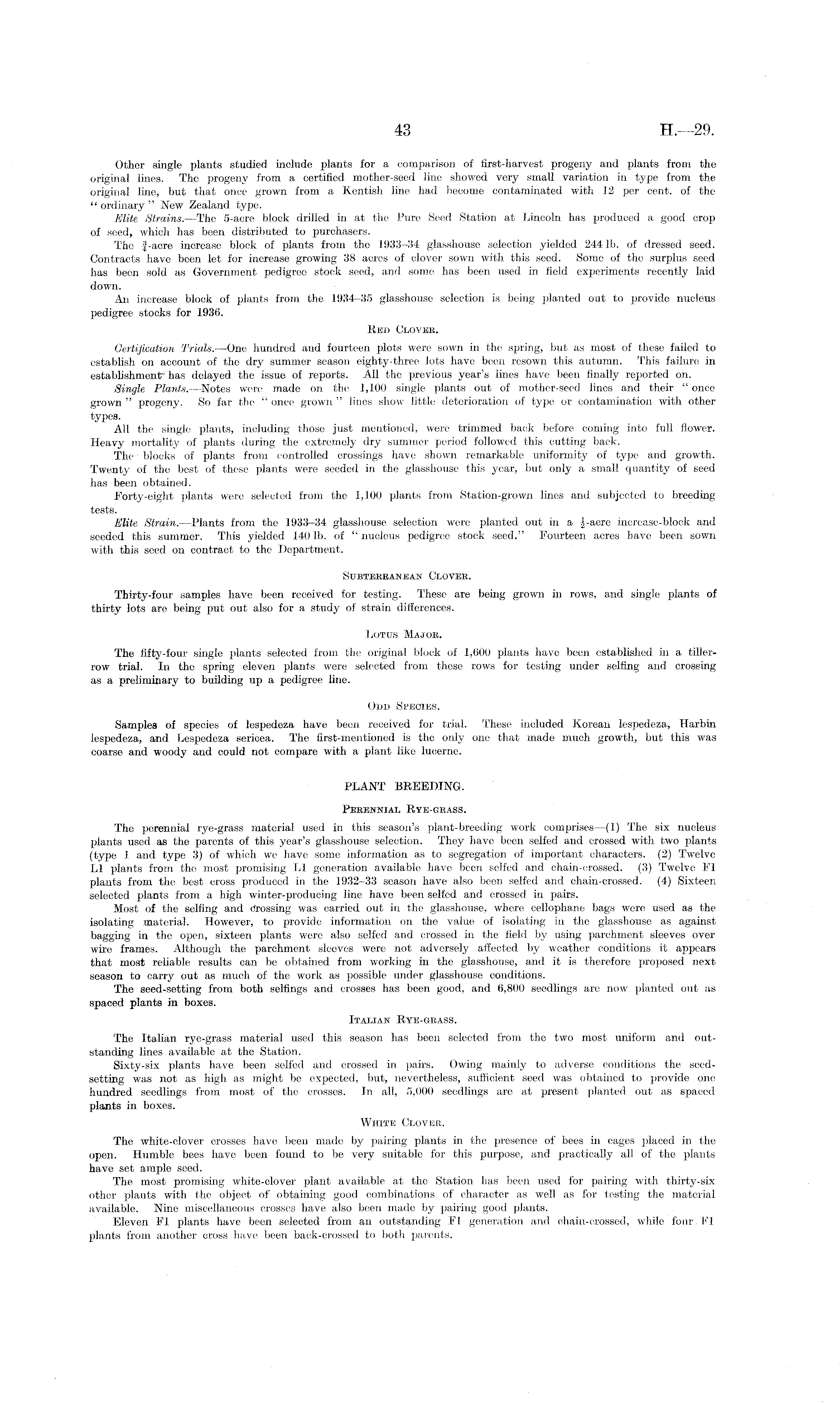 Other single plants studied include plants for a comparison of first-harvest progeny and plants from the original lines. The progeny from a certified mother-seed line showed very small variation in type from the original line, but that once grown from a Kentish line had become contaminated with 12 per cent, of the " ordinary " New Zealand type. Elite Strains. —The 5-acre block drilled in at the Pure Seed Station at Lincoln has produced a good crop of seed, which has been distributed to purchasers. The J-acre increase block of plants from the 1933-34 glasshouse selection yielded 244 lb. of dressed seed. Contracts have been let for increase growing 38 acres of clover sown with this seed. Some of the surplus seed has been sold as Government pedigree stock seed, and some has been used in field experiments recently laid down. An increase block of plants from the 1934-35 glasshouse selection is being planted out to provide nucleus pedigree stocks for 1936. Red Clover. Certification Trials. —One hundred and fourteen plots were sown in the spring, but as most of these failed to establish on account of the dry summer season eighty-three lots have been resown this autumn. This failure in establishment*has delayed the issue of reports. All the previous year's lines have been finally reported on. Single Plants.—Notes were made on the 1,100 single plants out of mother-seed lines and their " once grown " progeny. So far the " once grown " lines show little deterioration of type or contamination with other types. All the single plants, including those just mentioned, were trimmed back before coming into full flower. Heavy mortality of plants during the extremely dry summer period followed this cutting back. The blocks of plants from controlled crossings have shown remarkable uniformity of type and growth. Twenty of the best of these plants were seeded in the glasshouse this year, but only a small quantity of seed has been obtained. Forty-eight plants were selected from the 1,100 plants from Station-grown lines and subjected to breeding tests. Elite Strain. —Plants from the 1933-34 glasshouse selection were planted out in a J-acre increase-block and seeded this summer. This yielded 140 lb. of " nucleus pedigree stock seed." Fourteen acres have been sown with this seed on contract to the Department. SUBTERRANEAN CLOVER. Thirty-four samples have been received for testing. These are being grown in rows, and single plants of thirty lots are being put out also for a study of strain differences. Lotus Major. The fifty-foul' single plants selected from the original block of 1,600 plants have been established in a tillerrow trial. In the spring eleven plants were selected from these rows for testing under selfing and crossing as a preliminary to building up a pedigree line. Odd Species. Samples of species of lespedeza have been received for trial. These included Korean lespedeza, Harbin lespedeza, and Lespedeza sericea. The first-mentioned is the only one that made much growth, but this was coarse and woody and could not compare with a plant like lucerne. PLANT BREEDING. Perennial Rye-grass. The perennial rye-grass material used in this season's plant-breeding work comprises—(1) The six nucleus plants used as the parents of this year's glasshouse selection. They have been selfed and crossed with two plants (type 1 and type 3) of which we have some information as to segregation of important characters. (2) Twelve LI plants from the most promising LI generation available have been selfed and chain-crossed. (3) Twelve El plants from the best cross produced in the 1932-33 season have also been selfed and chain-crossed. (4) Sixteen selected plants from a high winter-producing line have been selfed and crossed in pairs. Most of the selfing and (Jrossing was carried out in the glasshouse, where cellophane bags were used as the isolating .material. However, to provide information on the value of isolating in the glasshouse as against bagging in the open, sixteen plants were also selfed and crossed iu the field by using parchment sleeves over wire frames. Although the parchment sleeves were not adversely affected by weather conditions it appears that most reliable results can be obtained from working in the glasshouse, and it is therefore proposed next season to carry out as much of the work as possible under glasshouse conditions. The seed-setting from both selfings and crosses has been good, and 6,800 seedlings are now planted out as spaced plants in boxes. Italian Rye-grass. The Italian rye-grass material used this season has been selected from the two most uniform and outstanding lines available at the Station. Sixty-six plants have been selfed and crossed in pairs. Owing mainly to adverse conditions the seedsetting was not as high as might be expected, but, nevertheless, sufficient seed was obtained to provide one hundred seedlings from most of the crosses. In all, 5,000 seedlings are at present planted out as spaced plants in boxes. White Clover. The white-clover crosses have been made by pairing plants in the presence of bees in cages placed in the open. Humble bees have been found to be very suitable for this purpose, and practically all of the plants have set ample seed. The most promising white-clover plant available at the Station has been used for pairing with thirty-six other plants with the object of obtaining good combinations of character as well as for testing the material available. Nine miscellaneous crosses have also been made by pairing good plants. Eleven El plants have been selected from an outstanding El generation and chain-crossed, while, four .El plants from another cross have been back-crossed to both parents.