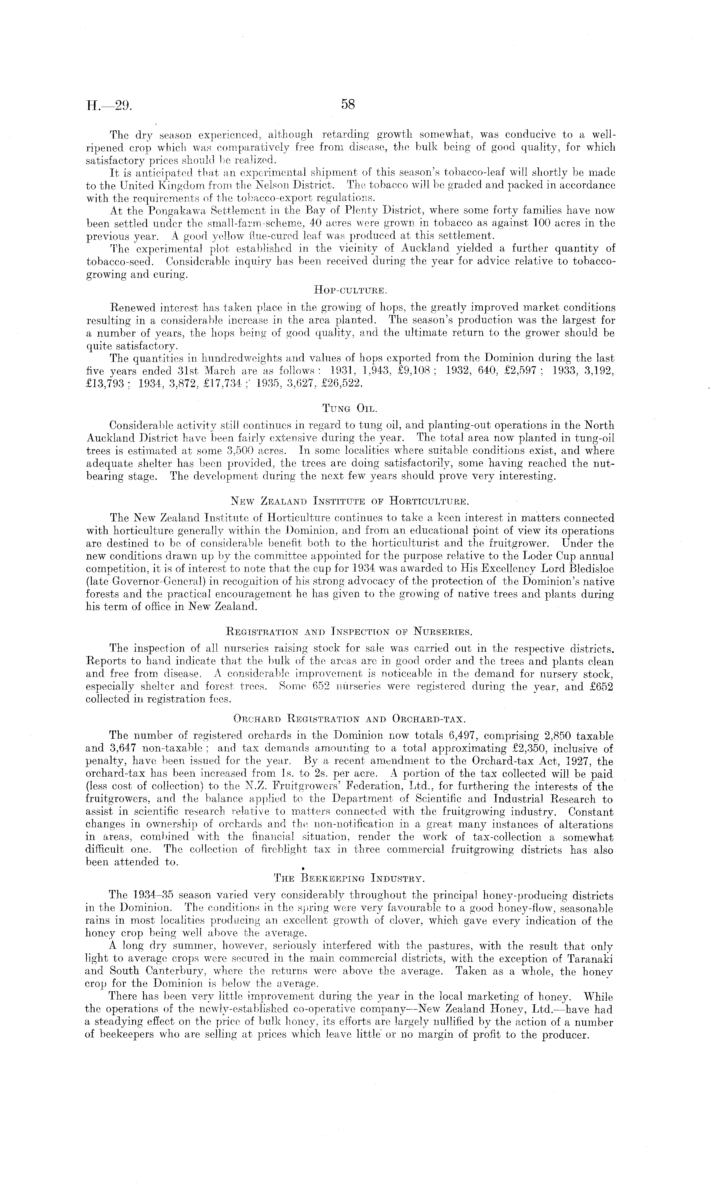 The dry season experienced, although retarding growth somewhat, was conducive to a wellripened crop which was comparatively free from disease, the bulk being of good quality, for which satisfactory prices should be realized. It is anticipated that an experimental shipment of this season's tobacco-leaf will shortly be made to the United Kingdom from the Nelson District. The tobacco will be graded and packed in accordance with the requirements of the tobacco-export, regulations. At the Pongakawa Settlement in the Bay of Plenty District, where some forty families have now been settled under the small-farm-scheme, 40 acres were grown in tobacco as against 100 acres in the previous year. A good yellow flue-cured leaf was produced at this settlement. The experimental plot established in the vicinity of Auckland yielded a further quantity of tobacco-seed. Considerable inquiry has been received during the year for advice relative to tobaccogrowing and curing. Hop-culture. Renewed interest has taken place in the growing of hops, the greatly improved market conditions resulting in a considerable increase in the area planted. The season's production was the largest for a number of years, the hops being of good quality, and the ultimate return to the grower should be quite satisfactory. The quantities in hundredweights and values of hops exported from the Dominion during the last five years ended 31st March are as follows: 1931, 1,943, £9,108; 1932, 640, £2,597 ; 1933, 3,192, £13,793 ; 1934, 3,872, £17,734 1935, 3,627, £26,522. Tung Oil. Considerable activity still continues in regard to tung oil, and planting-out operations in the North Auckland District have been fairly extensive during the year. The total area now planted in tung-oil trees is estimated at some 3,500 acres. In some localities where suitable conditions exist, and where adequate shelter has been provided, the trees are doing satisfactorily, some having reached the nutbearing stage. The development during the next few years should prove very interesting. New Zealand Institute of Horticulture. The New Zealand Institute of Horticulture continues to take a keen interest in matters connected with horticulture generally within the Dominion, and from an educational point of view its operations are destined to be of considerable benefit both to the horticulturist and the fruitgrower. Under the new conditions drawn up by the committee appointed for the purpose relative to the Loder Cup annual competition, it is of interest to note that the cup for 1934 was awarded to His Excellency Lord Bledisloe (late Governor-General) in recognition of his strong advocacy of the protection of the Dominion's native forests and the practical encouragement he has given to the growing of native trees and plants during his term of office in New Zealand. Registration and Inspection of Nurseries. The inspection of all nurseries raising stock for sale was carried out in the respective districts. Reports to hand indicate that the bulk of the areas are in good order and the trees and plants clean and free from, disease. A considerable improvement is noticeable in the demand for nursery stock, especially shelter and forest trees. Some 652 nurseries were registered during the year, and £652 collected in registration fees. Orchard Registration and Orchard-tax. The number of registered orchards in the Dominion now totals 6,497, comprising 2,850 taxable and 3,647 non-taxable ; and tax demands amounting to a total approximating £2,350, inclusive of penalty, have been issued for the year. By a recent amendment to the Orchard-tax Act, 1927, the orchard-tax has been increased from Is. to 2s. per acre. A portion of the tax collected will be paid (less cost of collection) to the N.Z. Fruitgrowers' Federation, Ltd., for furthering the interests of the fruitgrowers, and the balance applied to the Department of Scientific and Industrial Research to assist in scientific research relative to matters connected with the fruitgrowing industry. Constant changes in ownership of orchards and the non-notification in a great many instances of alterations in areas, combined with the financial situation, render the work of tax-collection a somewhat difficult one. The collection of fireblight tax in three commercial fruitgrowing districts has also been attended to. The Beekeeping Industry. The 1934-35 season varied very considerably throughout the principal honey-producing districts in the Dominion. The conditions in the spring were very favourable to a good honey-flow, seasonable rains in most localities producing an excellent growth of clover, which gave every indication of the honey crop being well above the average. A long dry summer, however, seriously interfered with the pastures, with the result that only light to average crops were secured in the main commercial districts, with the exception of Taranaki and South Canterbury, where the returns were above the average. Taken as a whole, the honey crop for the Dominion is below the averageThere has been very little improvement during the year in the local marketing of honey. While the operations of the newly-established co-operative company —New Zealand Honey, Ltd. —have had a steadying effect on the price of bulk honey, its efforts are largely nullified by the action of a number of beekeepers who are selling at prices which leave little or no margin of profit to the producer.
