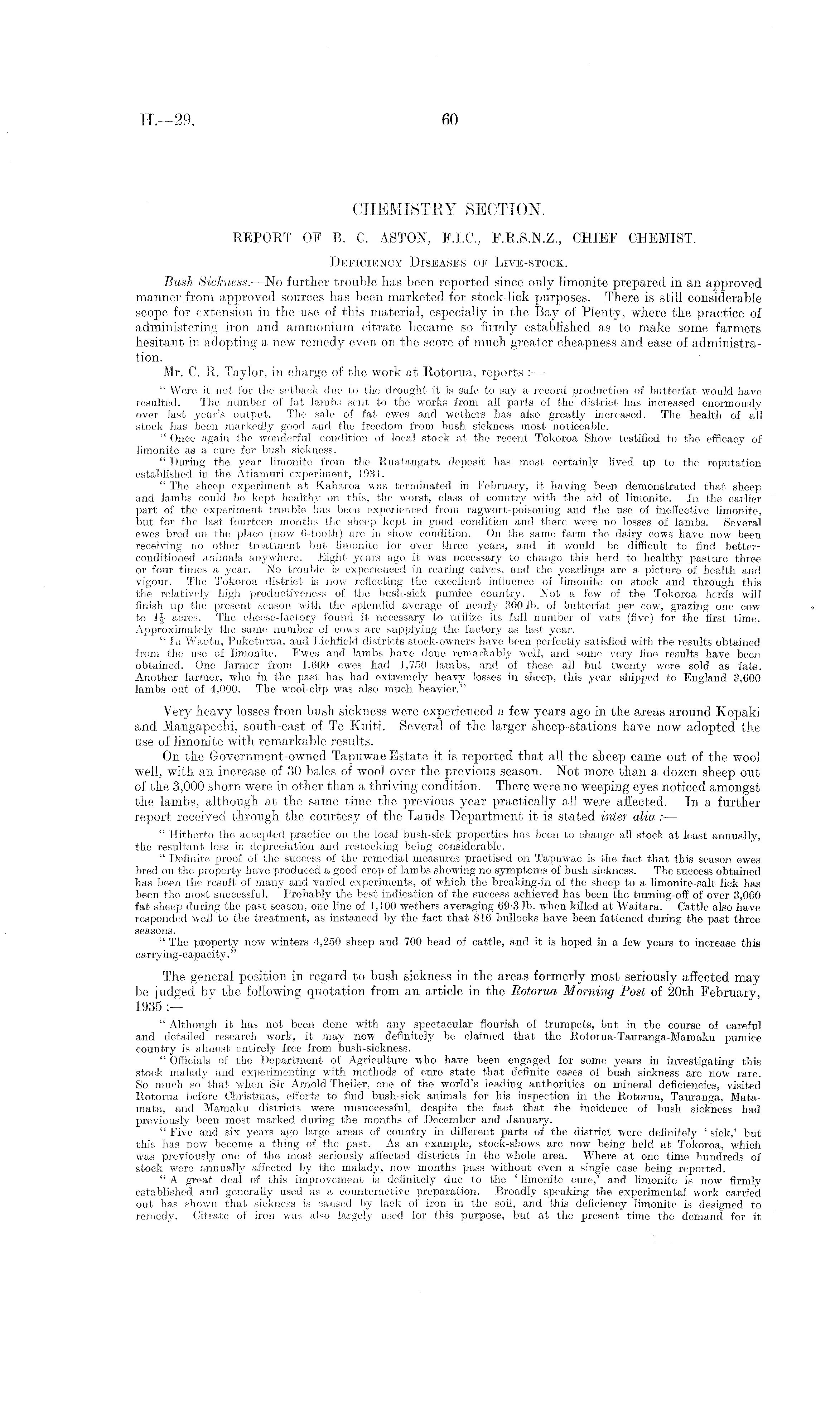 CHEMISTRY SECTION. REPORT OF B. C. ASTON, F.1.C., F.R.S.N.Z., CHIEF CHEMIST. Deficiency Diseases of Live-stock. Bush Sickness. —No further trouble has been reported since only limonite prepared in an approved manner from approved sources has been marketed for stock-lick purposes. There is still considerable scope for extension in the use of this material, especially in the Bay of Plenty, where the practice of administering iron and ammonium citrate became so firmly established as to make some farmers hesitant in adopting a new remedy even on the score of much greater cheapness and ease of administration. Mr. C. R. Taylor, in charge of the work at Rotorua, reports : — " Were it not for the setback due to the drought it is safe to say a record production of butterfat would have resulted. The number of fat lambs sent to the works from all parts of the district has increased enormously over last year's output. The sale of fat ewes and wethers has also greatly increased. The health of all stock has been markedly good and the freedom from bush sickness most noticeable. " Once again the wonderful condition of local stock at the recent Tokoroa Show testified to the efficacy of limonite as a cure for bush sickness. " During the year limonite from the Ruatangata deposit has most certainly lived up to the reputation established in the Atiamuri experiment, 1931. " The sheep experiment at Kaharoa was terminated in February, it having been demonstrated that sheep and lambs could be kept healthy on this, the worst, class of country with the aid of limonite. In the earlier part of the experiment trouble has been experienced from ragwort-poisoning and the use of ineffective limonite, but for the last fourteen months the sheep kept in good condition and there were no losses of lambs. Several ewes bred on the place (now 6-tooth) are in show condition. On the same farm the dairy cows have now been receiving no other treatment but limonite for over three years, and it would be difficult to find betterconditioned animals anywhere. Eight years ago it was necessary to change this herd to healthy pasture three or four times a year. No trouble is experienced in rearing calves, and the yearlings are a picture of health and vigour. The Tokoroa district is now reflecting the excellent influence of limonite on stock and through this the relatively high productiveness of the bush-sick pumice country. Not a few of the Tokoroa herds will finish up the present season with the splendid average of nearly 300 lb. of butterfat per cow, grazing one cow to 1J acres. The cheese-factory found it necessary to utilize its full number of vats (five) for the first time. Approximately the same number of cows are supplying the factory as last year. " In Waotu, Puketurua, and Lichfield districts stock-owners have been perfectly satisfied with the results obtained from the use of limonite. Ewes and lambs have done remarkably well, and some very fine results have been obtained. One farmer from 1,600 ewes had 1,750 lambs, and of these all but twenty were sold as fats. Another farmer, who in the past has had extremely heavy losses in sheep, this year shipped to England 3,600 lambs out of 4,000. The wool-clip was also much heavier." Very heavy losses from bush sickness were experienced a few years ago in the areas around Kopaki and Mangapeehi, south-east of Te Kuiti. Several of the larger sheep-stations have now adopted the use of limonite with remarkable results. On the Government-owned Tapuwae Estate it is reported that all the sheep came out of the wool well, with an increase of 30 bales of wool over the previous season. Not more than a dozen sheep out of the 3,000 shorn were in other than a thriving condition. There were no weeping eyes noticed amongst the lambs, although at the same time the previous year practically all were affected. In a further report received through the courtesy of the Lands Department it is stated inter alia:— " Hitherto the accepted practice on the local bush-sick properties has been to change all stock at least annually, the resultant loss in depreciation and restocking being considerable. " Definite proof of the success of the remedial measures practised on Tapuwae is the fact that this season ewes bred on the property have produced a good crop of lambs showing no symptoms of bush sickness. The success obtained has been the result of many and varied experiments, of which the breaking-in of the sheep to a limonite-salt lick has been the most successful. Probably the best- indication of the success achieved has been the turning-off of over 3,000 fat sheep during the past season, one line of 1,100 wethers averaging 69-3 lb. when killed at Waitara. Cattle also have responded well to the treatment, as instanced by the fact that 816 bullocks have been fattened during the past three seasons. " The property now winters 4,250 sheep arid 700 head of cattle, and it is hoped in a few years to increase this carrying-capacity.'' The general position in regard to bush sickness in the areas formerly most seriously affected may be judged bv the following quotation from an article in the Rotorua Morning Post of 20th February, 1935 " Although it has not been done with any spectacular flourish of trumpets, but in the course of careful and detailed research work, it may now definitely be claimed that the Rotorua-Tauranga-Mamaku pumice country is almost entirely free from bush-sickness. " Officials of the Department of Agriculture who have been engaged for some years in investigating this stock malady and experimenting with methods of cure state that definite eases of bush sickness are now rare. So much so that when Sir Arnold Theiler, one of the world's leading authorities on mineral deficiencies, visited Rotorua before Christmas, efforts to find bush-sick animals for his inspection in the Rotorua, Tauranga, Matamata, and Mamaku districts were unsuccessful, despite the fact that the incidence of bush sickness had previously