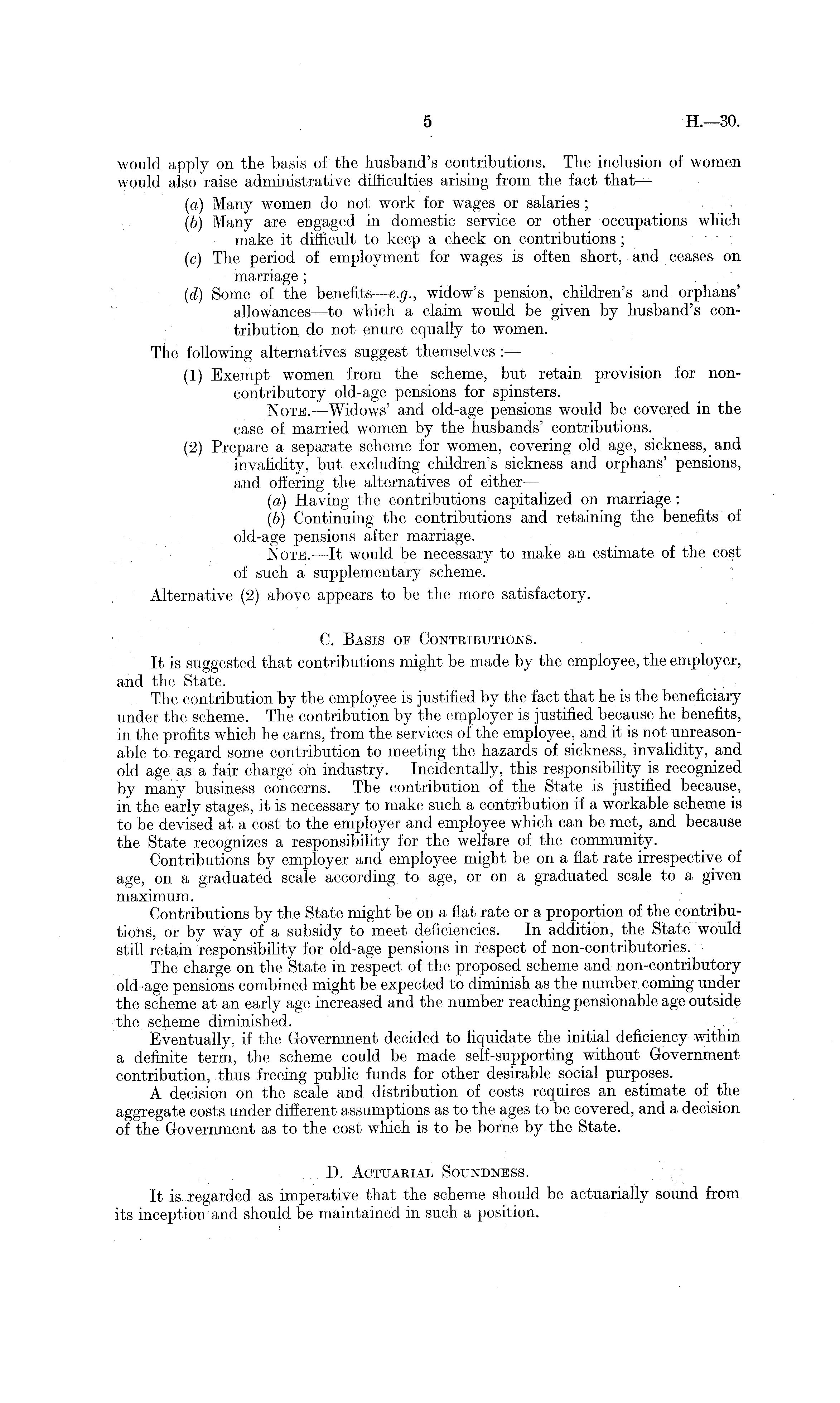 would apply on the basis of the husband's contributions. The inclusion of women would also raise administrative difficulties arising from the fact that — {a) Many women do not work for wages or salaries ; (b) Many are engaged in domestic service or other occupations which make it difficult to keep a check on contributions; (c) The period of employment for wages is often short, and ceases on marriage ; (d) Some of the benefits —e.g., widow's pension, children's and orphans' allowances —to which a claim would be given by husband's contribution do not enure equally to women. The following alternatives suggest themselves :— (1) Exempt women from the scheme, but retain provision for noncontributory old-age pensions for spinsters. Note. —Widows' and old-age pensions would be covered in the case of married women by the husbands' contributions. (2) Prepare a separate scheme for women, covering old age, sickness, and invalidity, but excluding children's sickness and orphans' pensions, and offering the alternatives of either — (a) Having the contributions capitalized on marriage : (b) Continuing the contributions and retaining the benefits of old-age pensions after marriage. would be necessary to make an estimate of the cost of such a supplementary scheme. Alternative (2) above appears to be the more satisfactory. C. Basis op Contributions. It is suggested that contributions might be made by the employee, the employer, and the State. . The contribution by the employee is justified by the fact that he is the beneficiary under the scheme. The contribution by the employer is justified because he benefits, in the profits which he earns, from the services of the employee, and it is not unreasonable to regard some contribution to meeting the hazards of sickness, invalidity, and old age as, a fair charge on industry. Incidentally, this responsibility is recognized by many business concerns. The contribution of the State is justified because, in the early stages, it is necessary to make such a contribution if a workable scheme is to be devised at a cost to the employer and employee which can be met, and because the State recognizes a responsibility for the welfare of the community. Contributions by employer and employee might be on a flat rate irrespective of age, on a graduated scale according to age, or on a graduated scale to a given maximum. Contributions by the State might be on a flat rate or a proportion of the contributions, or by way of a subsidy to meet deficiencies. In addition, the State would still retain responsibility for old-age pensions in respect of non-contributories. The charge on the State in respect of the proposed scheme and non-contributory old-age pensions combined might be expected to diminish as the number coming under the scheme at an early age increased and the number reaching pensionable age outside the scheme diminished. Eventually, if the Government decided to liquidate the initial deficiency within a definite term, the scheme could be made self-supporting without Government contribution, thus freeing public funds for other desirable social purposes. A decision on the scale and distribution of costs requires an estimate of the aggregate costs under different assumptions as to the ages to be covered, and a decision of the Government as to the cost which is to be borne by the State. D. Actuarial Soundness. It is regarded as imperative that the scheme should be actuarially sound from its inception and should be maintained in such a position.
