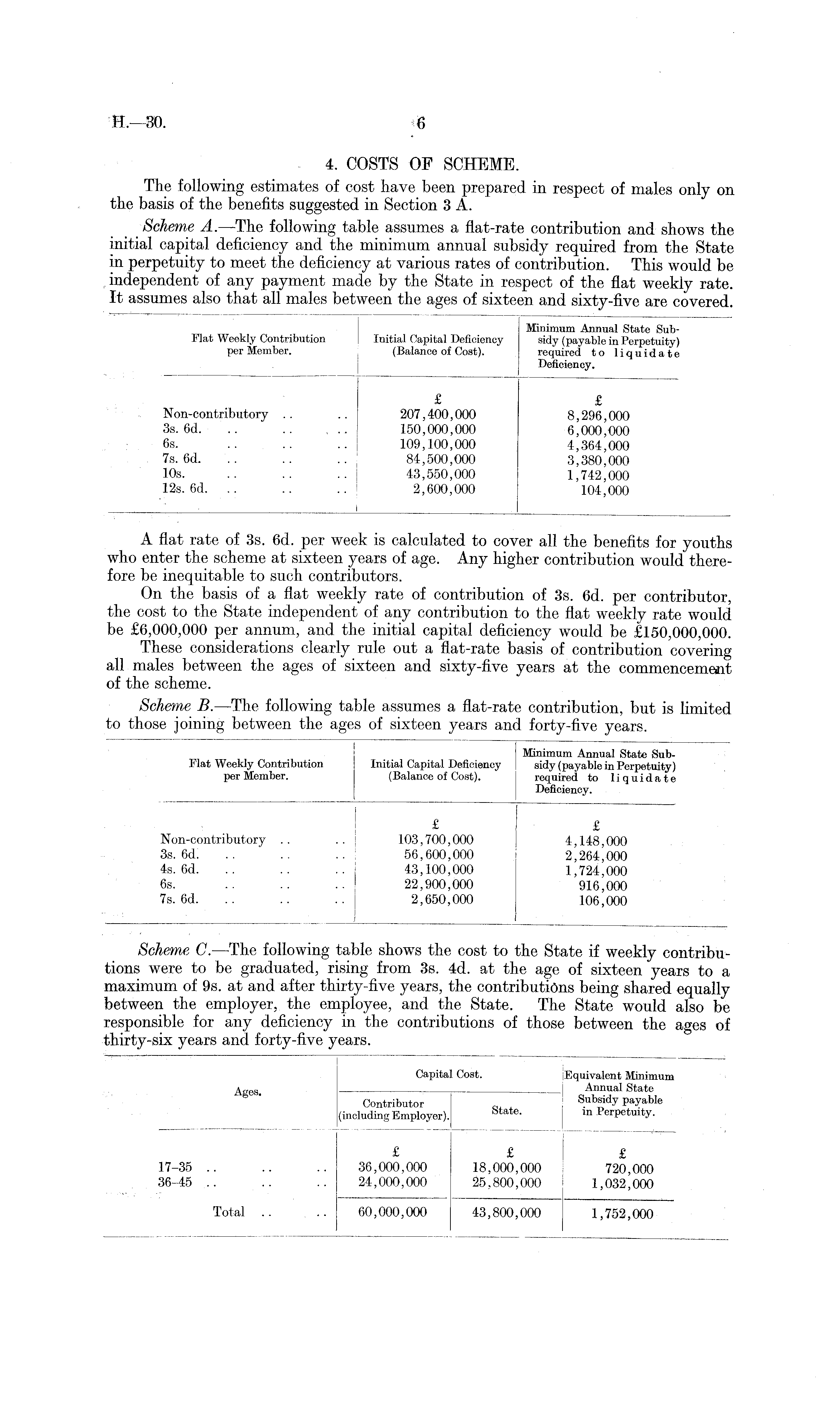 Scheme A—The following table assumes a flat-rate contribution and shows the initial capital deficiency and the minimum annual subsidy required from the State in perpetuity to meet the deficiency at various rates of contribution. This would be independent of any payment made by the State in respect of the flat weekly rate. It assumes also that all males between the ages of sixteen and sixty-five are covered.
