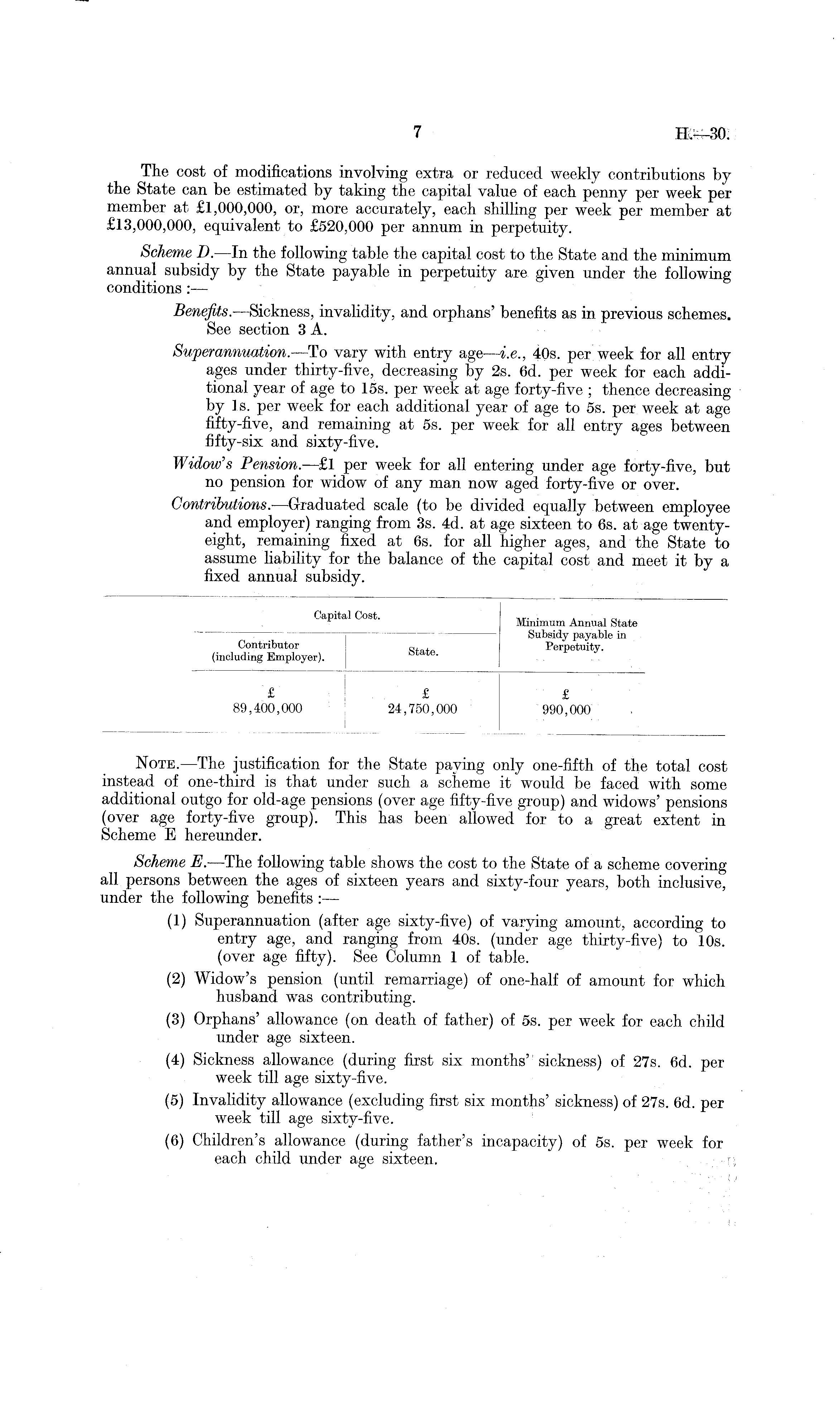 The cost of modifications involving extra or reduced weekly contributions by the State can be estimated by taking the capital value of each penny per week per member at £1,000,000, or, more accurately, each shilling per week per member at £13,000,000, equivalent to £520,000 per annum in perpetuity. Scheme D.—ln the following table the capital cost to the State and the minimum annual subsidy by the State payable in perpetuity are given under the following conditions : — Benefits. —Sickness, invalidity, and orphans' benefits as in previous schemes. See section 3 A. Superannuation.—To vary with entry age —i.e., 40s. per week for all entry ages under thirty-five, decreasing by 2s. 6d. per week for each additional year of age to 15s. per week at age forty-five ; thence decreasing by Is. per week for each additional year of age to ss. per week at age fifty-five, and remaining at ss. per week for all entry ages between fifty-six and sixty-five. Widow's Pension. —£l per week for all entering under age forty-five, but no pension for widow of any man now aged forty-five or over. Contributions. —Graduated scale (to be divided equally between employee and employer) ranging from 3s. 4d. at age sixteen to 6s. at age twentyeight, remaining fixed at 6s. for all higher ages, and the State to assume liability for the balance of the capital cost and meet it by a fixed annual subsidy.