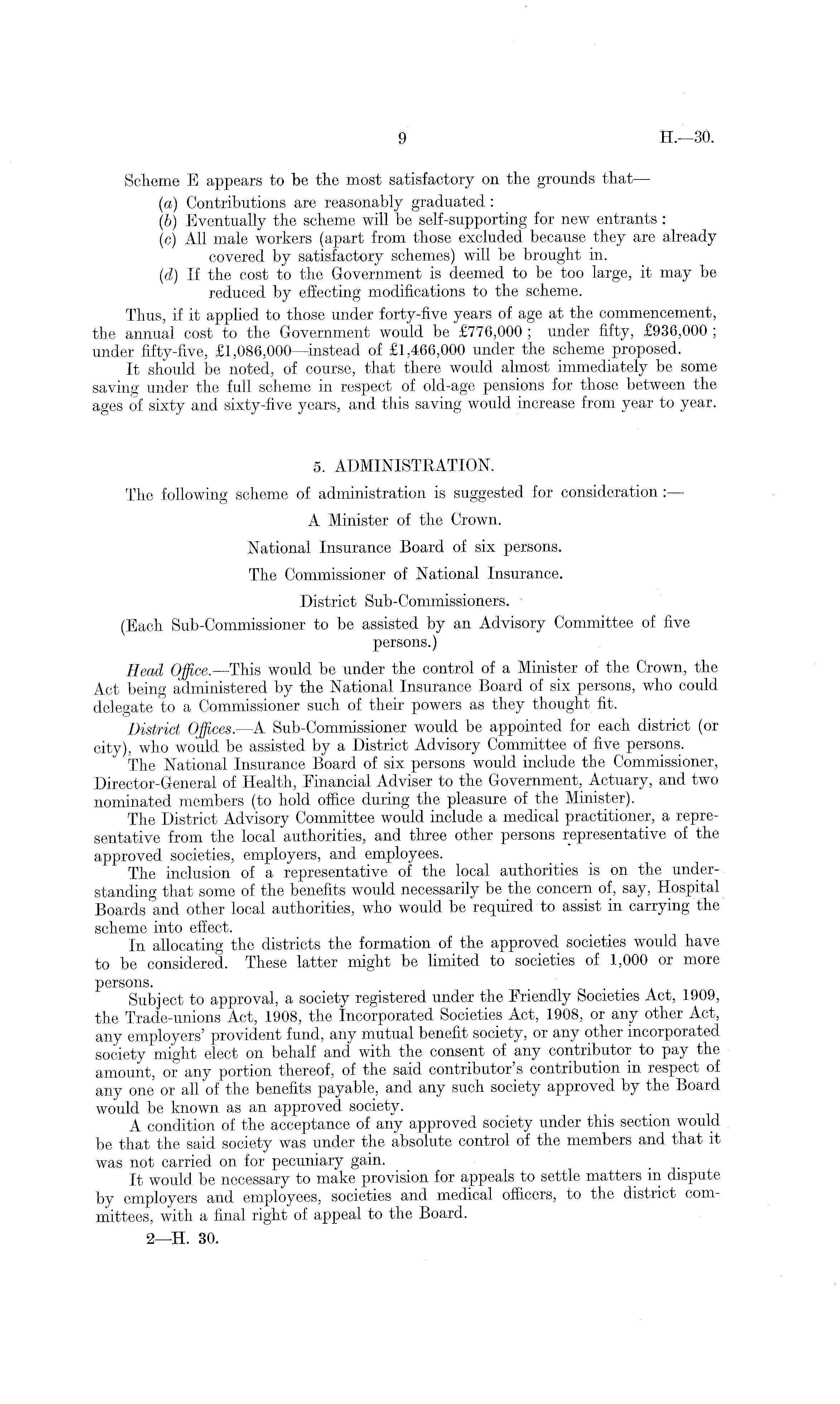 Scheme E appears to be the most satisfactory on the grounds that— (а) Contributions are reasonably graduated : (б) Eventually the scheme will be self-supporting for new entrants : (c) All male workers (apart from those excluded because they are already covered by satisfactory schemes) will be brought in. (d) If the cost to the Government is deemed to be too large, it may be reduced by effecting modifications to the scheme. Thus, if it applied to those under forty-five years of age at the commencement, the annual cost to the Government would be £776,000 ; under fifty, £936,000 ; under fifty-five, £I,oB6,ooo—instead of £1,466,000 under the scheme proposed. It should be noted, of course, that there would almost immediately be some saving under the full scheme in respect of old-age pensions for those between the ages of sixty and sixty-five years, and this saving would increase from year to year. 5. ADMINISTRATION. The following scheme of administration is suggested for consideration : — A Minister of the Crown. National Insurance Board of six persons. The Commissioner of National Insurance. District Sub-Commissioners. (Each Sub-Commissioner to be assisted by an Advisory Committee of five persons.) Head Office. —This would be under the control of a Minister of the Crown, the Act being administered by the National Insurance Board of six persons, who could delegate to a Commissioner such of their powers as they thought fit. District Offices. —A Sub-Commissioner would be appointed for each district (or city), who would be assisted by a District Advisory Committee of five persons. The National Insurance Board of six persons would include the Commissioner, Director-General of Health, Financial Adviser to the Government, Actuary, and two nominated members (to hold office during the pleasure of the Minister). The District Advisory Committee would include a medical practitioner, a representative from the local authorities, and three other persons representative of the approved societies, employers, and employees. The inclusion of a representative of the local authorities is on the understanding that some of the benefits would necessarily be the concern of, say, Hospital Boards and other local authorities, who would be required to assist in carrying the scheme into effect. In allocating the districts the formation of the approved societies would have to be considered. These latter might be limited to societies of 1,000 or more persons. Subject to approval, a society registered under the Friendly Societies Act, 1909, the Trade-unions Act, 1908, the Incorporated Societies Act, 1908, or any other Act, any employers' provident fund, any mutual benefit society, or any other incorporated society might elect on behalf and with the consent of any contributor to pay the amount, or any portion thereof, of the said contributor's contribution in respect of any one or all of the benefits payable, and any such society approved by the Board would be known as an approved society. A condition of the acceptance of any approved society under this section would be that the said society was under the absolute control of the members and that it was not carried on for pecuniary gain. It would be necessary to make provision for appeals to settle matters in dispute by employers and employees, societies and medical officers, to the district committees, with a final right of appeal to the Board. 2—H. 30.