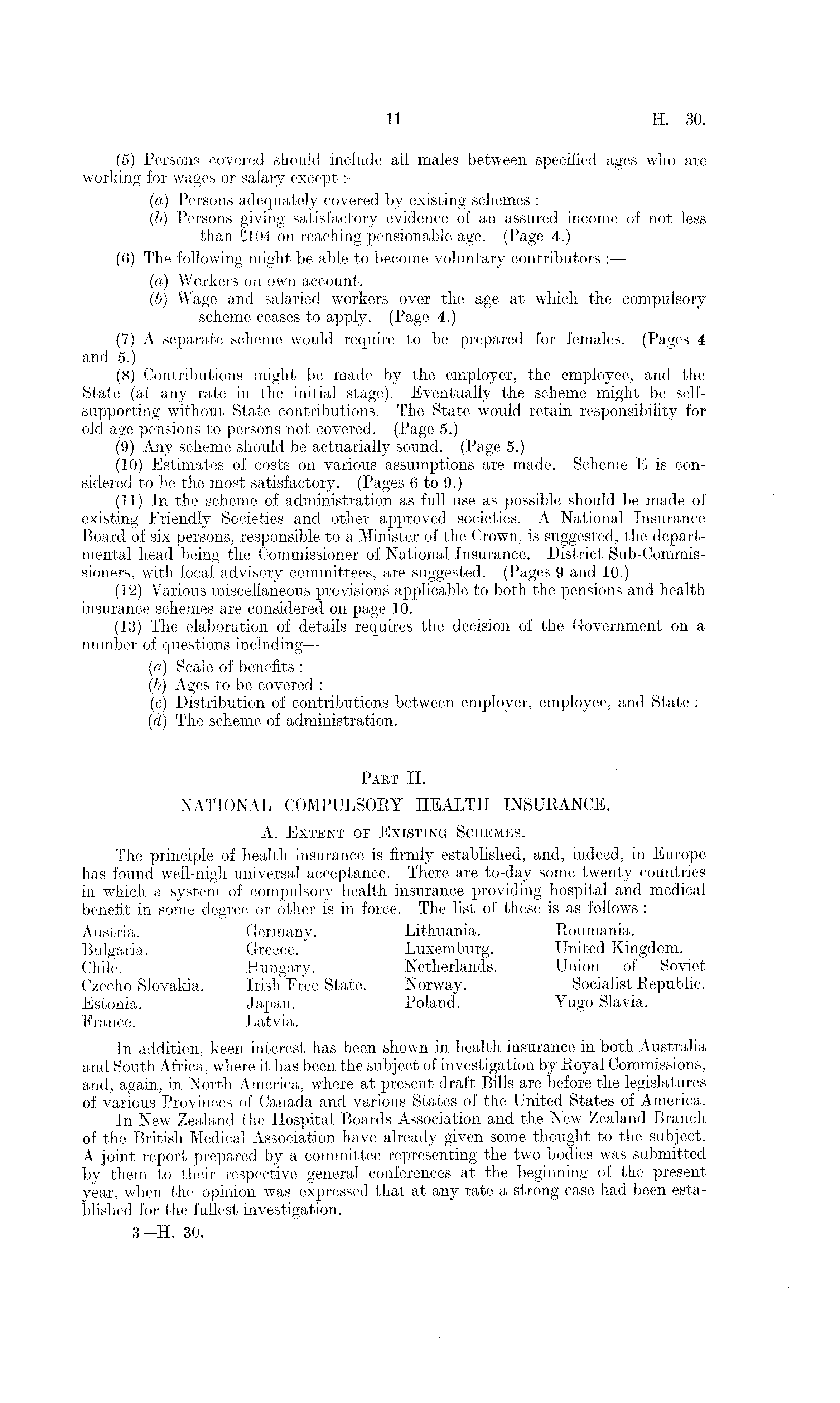 (5) Persons covered should include all males between specified ages who are working for wages or salary except:— (a) Persons adequately covered by existing schemes : (b) Persons giving satisfactory evidence of an assured income of not less than £104 on reaching pensionable age. (Page 4.) (6) The following might be able to become voluntary contributors : — (a) Workers on own account. (b) Wage and salaried workers over the age at which the compulsory scheme ceases to apply. (Page 4.) (7) A separate scheme would require to be prepared for females. (Pages 4 and 5.) (8) Contributions might be made by the employer, the employee, and the State (at any rate in the initial stage). Eventually the scheme might be selfsupporting without State contributions. The State would retain responsibility for old-age pensions to persons not covered. (Page 5.) (9) Any scheme should be actuarially sound. (Page 5.) (10) Estimates of costs on various assumptions are made. Scheme E is considered to be the most satisfactory. (Pages 6to 9.) (11) In the scheme of administration as full use as possible should be made of existing Friendly Societies and other approved societies. A National Insurance Board of six persons, responsible to a Minister of the Crown, is suggested, the departmental head being the Commissioner of National Insurance. District Sub-Commis-sioners, with local advisory committees, are suggested. (Pages 9 and 10.) (12) Various miscellaneous provisions applicable to both the pensions and health insurance schemes are considered on page 10. (13) The elaboration of details requires the decision of the Government on a number of questions including— (a) Scale of benefits : (b) Ages to be covered : (c) Distribution of contributions between employer, employee, and State : (d) The scheme of administration. Part 11. NATIONAL COMPULSORY HEALTH INSURANCE. A. Extent or Existing Schemes. The principle of health insurance is firmly established, and, indeed, in Europe has found well-nigh universal acceptance. There are to-day some twenty countries in which a system of compulsory health insurance providing hospital and medical benefit in some degree or other is in force. The list of these is as follows : — Austria. Germany. Lithuania. Roumania. Bulgaria. Greece. Luxemburg. United Kingdom. Chile. Hungary. Netherlands. Union of Soviet Czecho-Slovakia. Irish Free State. Norway. Socialist Republic. Estonia. Japan. Poland. Yugo Slavia. France. Latvia. In addition, keen interest has been shown in health insurance in both Australia and South Africa, where it has been the subject of investigation by Royal Commissions, and, again, in North America, where at present draft Bills are before the legislatures of various Provinces of Canada and various States of the United States of America. In New Zealand the Hospital Boards Association and the New Zealand Branch of the British Medical Association have already given some thought to the subject. A joint report prepared by a committee representing the two bodies was submitted by them to their respective general conferences at the beginning of the present year, when the opinion was expressed that at any rate a strong case had been established for the fullest investigation. 3—H. 30.