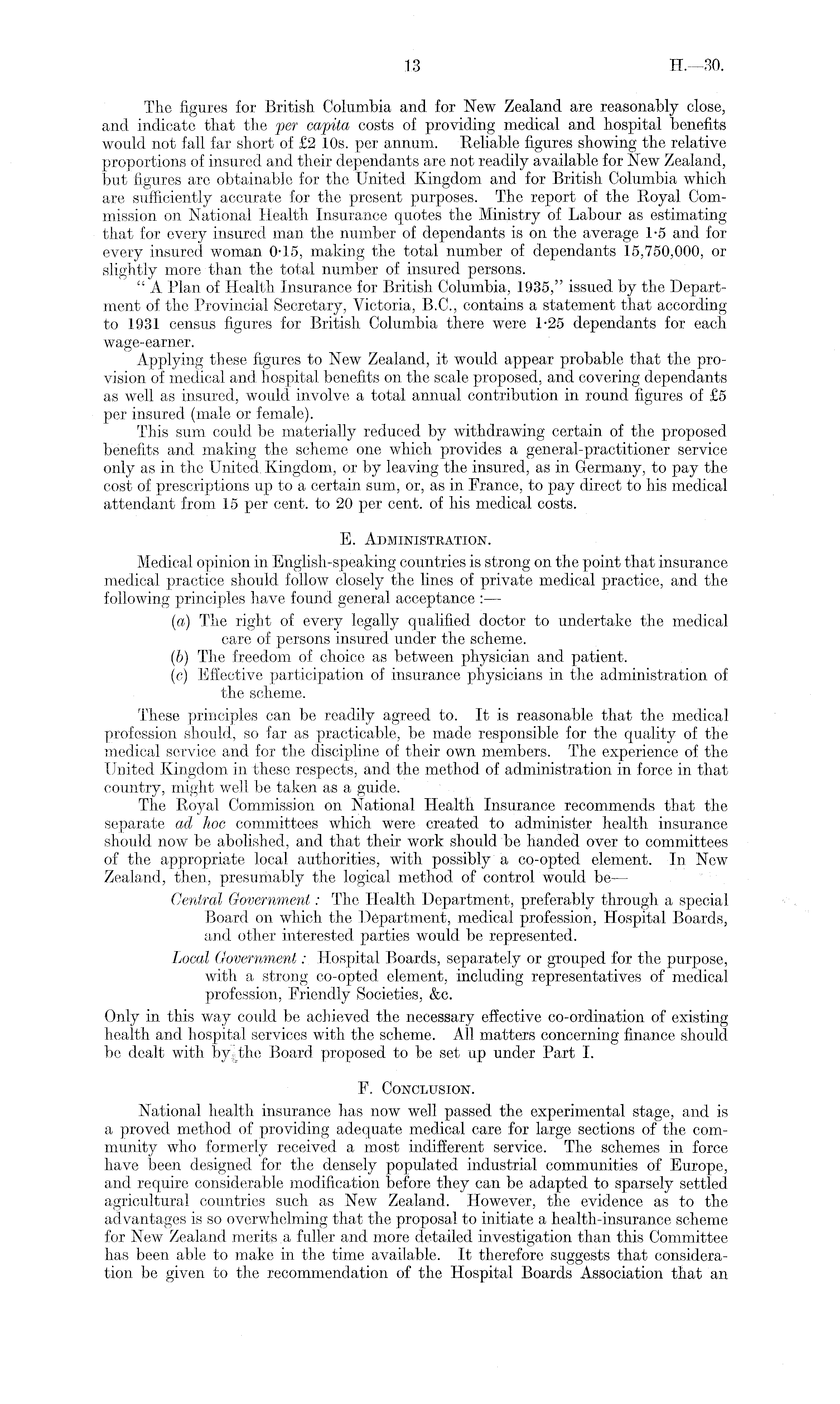 The figures for British Columbia and for New Zealand are reasonably close, and indicate that the per capita costs of providing medical and hospital benefits would not fall far short of £2 10s. per annum. Reliable figures showing the relative proportions of insured and their dependants are not readily available for New Zealand, but figures are obtainable for the United Kingdom and for British Columbia which are sufficiently accurate for the present purposes. The report of the Royal Commission on National Health Insurance quotes the Ministry of Labour as estimating that for every insured man the number of dependants is on the average 1-5 and for every insured woman 0-15, making the total number of dependants 15,750,000, or slightly more than the total number of insured persons. " A Plan of Health Insurance for British Columbia, 1935," issued by the Department of the Provincial Secretary, Victoria, 8.C., contains a statement that according to 1931 census figures for British Columbia there were 1-25 dependants for each wage-earner. Applying these figures to New Zealand, it would appear probable that the provision of medical and hospital benefits on the scale proposed, and covering dependants as well as insured, would involve a total annual contribution in round figures of £5 per insured (male or female). This sum could be materially reduced by withdrawing certain of the proposed benefits and making the scheme one which provides a general-practitioner service only as in the United. Kingdom, or by leaving the insured, as in Germany, to pay the cost of prescriptions up to a certain sum, or, as in France, to pay direct to his medical attendant from 15 per cent, to 20 per cent, of his medical costs. E. Administration. Medical opinion in English-speaking countries is strong on the point that insurance medical practice should follow closely the lines of private medical practice, and the following principles have found general acceptance : — (a) The right of every legally qualified doctor to undertake the medical care of persons insured under the scheme. (b) The freedom of choice as between physician and patient. (c) Effective participation of insurance physicians in the administration of the scheme. These principles can be readily agreed to. It is reasonable that the medical profession should, so far as practicable, be made responsible for the quality of the medical service and for the discipline of their own members. The experience of the United Kingdom in these respects, and the method of administration in force in that country, might well be taken as a guide. The Royal Commission on National Health Insurance recommends that the separate ad hoc committees which were created to administer health insurance should now be abolished, and that their work should be handed over to committees of the appropriate local authorities, with possibly a co-opted element. In New Zealand, then, presumably the logical method of control would be— Central Government: The Health Department, preferably through a special Board on which the Department, medical profession, Hospital Boards, and other interested parties would be represented. Local Government: Hospital Boards, separately or grouped for the purpose, with a strong co-opted element, including representatives of medical profession, Friendly Societies, &c. Only in this way could be achieved the necessary effective co-ordination of existing health and hospital services with the scheme. All matters concerning finance should be dealt with Board proposed to be set up under Part I. F. Conclusion. National health insurance has now well passed the experimental stage, and is a proved method of providing adequate medical care for large sections of the community who formerly received a most indifferent service. The schemes in force have been designed for the densely populated industrial communities of Europe, and require considerable modification before they can be adapted to sparsely settled agricultural countries such as New Zealand. However, the evidence as to the advantages is so overwhelming that the proposal to initiate a health-insurance scheme for New Zealand merits a fuller and more detailed investigation than this Committee has been able to make in the time available. It therefore suggests that consideration be given to the recommendation of the Hospital Boards Association that an