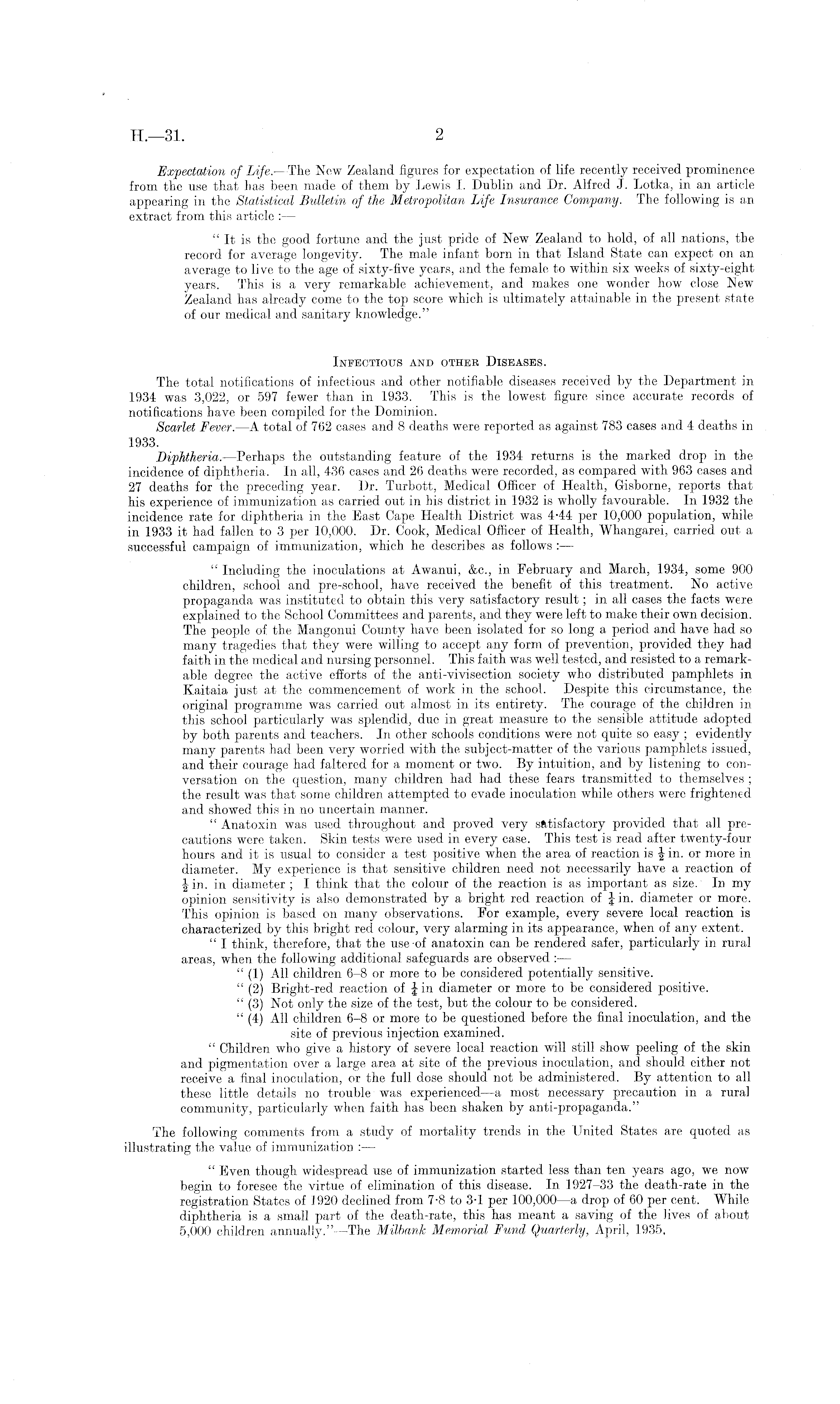 Expectation of Life. —The New Zealand figures for expectation of life recently received prominence from the use that has been made of them by Lewis I. Dublin and Dr. Alfred J. Lotka, in an article appearing in the Statistical Bulletin of the Metropolitan Life Insurance Company. The following is an extract from this article : — " It is the good fortune and the just pride of New Zealand to hold, of all nations, the record for average longevity. The male infant born in that Island State can expect on an average to live to the age of sixty-five years, and the female to within six weeks of sixty-eight years. This is a very remarkable achievement, and makes one wonder how close New Zealand has already come to the top score which is ultimately attainable in the present state of our medical and sanitary knowledge." Infectious and other Diseases. The total notifications of infectious and other notifiable diseases received by the Department in 1934 was 3,022, or 597 fewer than in 1933. This is the lowest figure since accurate records of notifications have been compiled for the Dominion. Scarlet Fever. —A total of 762 cases and 8 deaths were reported as against 783 cases and 4 deaths in 1933. Diphtheria. —Perhaps the outstanding feature of the 1934 returns is the marked drop in the incidence of diphtheria. In all, 436 cases and 26 deaths were recorded, as compared with 963 cases and 27 deaths for the preceding year. Dr. Turbott, Medical Officer of Health, Gisborne, reports that his experience of immunization as carried out in his district in 1932 is wholly favourable. In 1932 the incidence rate for diphtheria in the East Cape Health District was 4-44 per 10,000 population, while in 1933 it had fallen to 3 per 10,000. Dr. Cook, Medical Officer of Health, Whangarei, carried out a successful campaign of immunization, which he describes as follows :— " Including the inoculations at Awanui, &c., in February and March, 1934, some 900 children, school and pre-school, have received the benefit of this treatment. No active propaganda was instituted to obtain this very satisfactory result; in all cases the facts were explained to the School Committees and parents, and they were left to make their own decision. The people of the Mangonui County have been isolated for so long a period and have had so many tragedies that they were willing to accept any form of prevention, provided they had faith in the medical and nursing personnel. This faith was well tested, and resisted to a remarkable degree the active efforts of the anti-vivisection society who distributed pamphlets in Kaitaia just at the commencement of work in the school. Despite this circumstance, the original programme was carried out almost in its entirety. The courage of the children in this school particularly was splendid, due in great measure to the sensible attitude adopted by both parents and teachers. In other schools conditions were not quite so easy ; evidently many parents had been very worried with the subject-matter of the various pamphlets issued, and their courage had faltered for a, moment or two. By intuition, and by listening to conversation on the question, many children had had these fears transmitted to themselves ; the result was that some children attempted to evade inoculation while others were frightened and showed this in no uncertain manner. " Anatoxin was used throughout and proved very satisfactory provided that all precautions were taken. Skin tests were used in every case. This test is read after twenty-four hours and it is usual to consider a test positive when the area of reaction is \ in. or more in diameter. My experience is that sensitive children need not necessarily have a reaction of \ in. in diameter ; I think that the colour of the reaction is as important as size. In my opinion sensitivity is also demonstrated by a bright red reaction of Jin. diameter or more. This opinion is based on many observations. For example, every severe local reaction is characterized by this bright red colour, very alarming in its appearance, when of any extent. " I think, therefore, that the use-of anatoxin can be rendered safer, particularly in rural areas, when the following additional safeguards are observed : — " (1) All children 6-8 or more to be considered potentially sensitive. " (2) Bright-red reaction of |in diameter or more to be considered positive. " (3) Not only the size of the test, but the colour to be considered. " (4) All children 6-8 or more to be questioned before the final inoculation, and the site of previous injection examined. " Children who give a history of severe local reaction will still show peeling of the skin and pigmentation over a large area at site of the previous inoculation, and should either not receive a final inoculation, or the full dose should not be administered. By attention to all these little details no trouble was experienced —a most necessary precaution in a rural community, particularly when faith has been shaken by anti-propaganda." The following comments from a study of mortality trends in the United States are quoted as illustrating the value of immunization : — " Even though widespread use of immunization started less than ten years ago, we now begin to foresee the virtue of elimination of this disease. In 1927-33 the death-rate in the registration States of 1920 declined from 7-8 to 3-1 per 100,000 —a drop of 60 per cent. While diphtheria is a small part of the death-rate, this has meant a saving of the lives of about 5,000 children annually." —The Milbank Memorial Fund Quarterly, April, 1935,