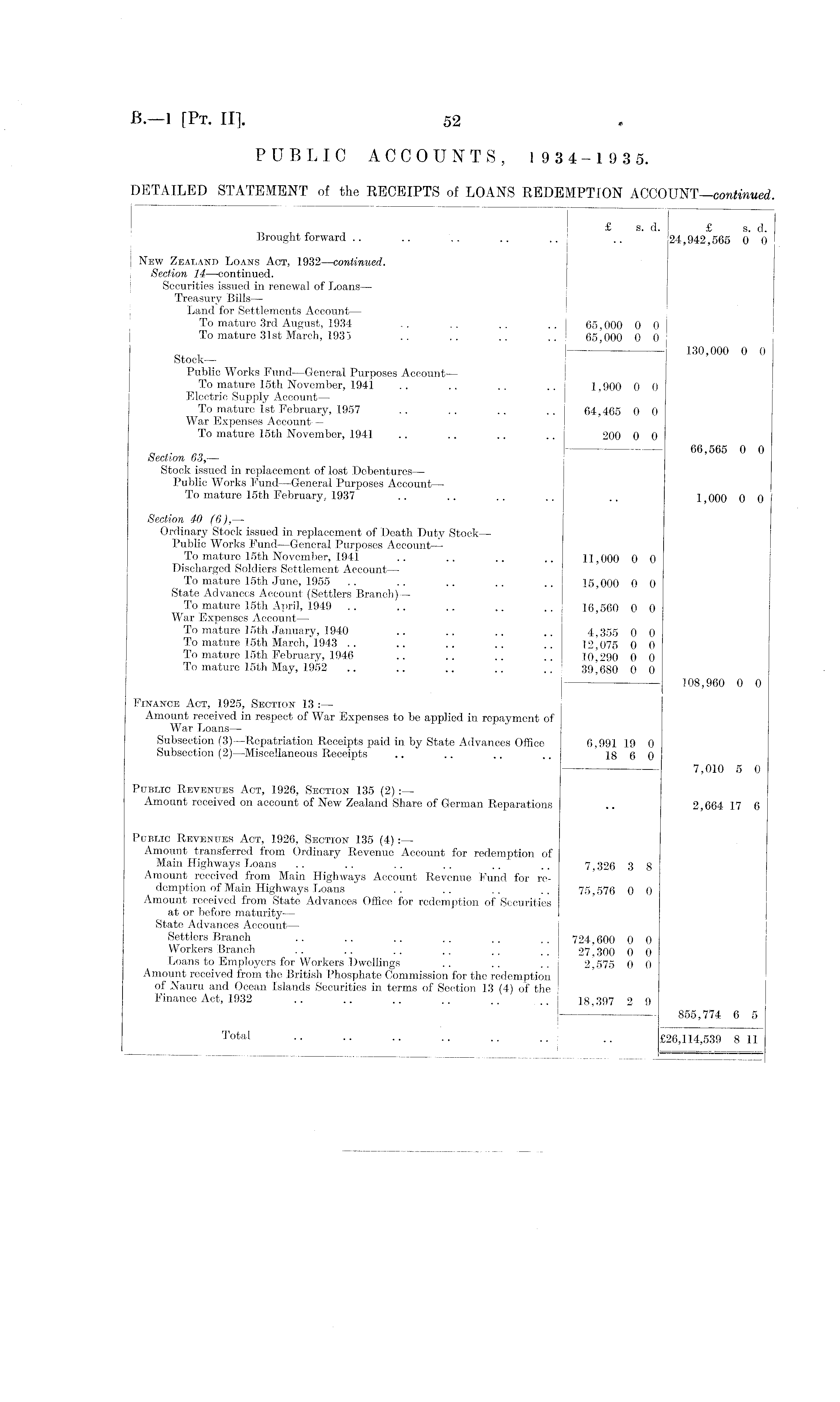 £ s. d. £ s. d. Brought forward .. .. .. .. .. .. 24,942,565 0 0 New Zealand Loans Act, 1932— continued. Section 14 —continued. Securities issued in renewal of Loans— Treasury Bills— Land for Settlements Account— To mature 3rd August, 1934 . . . . .. 65,000 0 0 To mature 31st March, 1935 .. .. .. .. 0 0 130,000 0 0 Stock — Public Works Fund —General Purposes Account — To mature 15th November, 1941 .. .. .. .. 1,900 0 0 Electric Supply Account— To mature 1st February, 1957 .. .. .. .. 64,465 0 0 War Expenses Account — To mature 15th November, 1941 .. .. .. .. 200 0 0 66,565 0 0 Section 63, — Stock issued in replacement of lost Debentures— Public Works Fund—General Purposes Account— To mature 15th February, 1937 .. .. .. .. ., 1 000 0 0 Section 40 (6)',— Ordinary Stock issued in replacement of Death Duty Stock— Public Works Fund —General Purposes AccountTo mature 15th November, 1941 .. .. .. .. 11 000 0 0 Discharged Soldiers Settlement Account— To mature 15th June, 1955 .. .. .. .. .. 15,000 0 0 State Advances Account (Settlers Branch) — To mature 15th April, 1949 .. .. .. .. .. 16,560 0 0 War Expenses Account— To mature 15th January, ]940 .. .. .. .. 4,355 0 0 To mature 15th March, 1943 .. .. .. .. .. 12,075 0 0 To mature 15th February, 1946 .. .. .. .. 10*290 0 0 To mature 15th May, 1952 .. .. .. .. .. 39*680 0 0 ]08,960 0 0 Finance Act, 1925, Section 13 :— Amount received in respect of War Expenses to be applied in repayment of War Loans— Subsection (3) —Repatriation Receipts paid in by State Advances Office 6,991 19 0 Subsection (2) —Miscellaneous Receipts .. .. .. .. 18 6 0 7,010 5 0 Public Revenues Act, 1926, Section 135 (2) :— Amount received on account of New Zealand Share of German Reparations .. 2 664 17 6 Public Revenues Act, 1926, Section 135 (4) :— Amount transferred from Ordinary Revenue Account for redemption of Main Highways Loans .. .. .. .. .. ., 7 326 3 8 Amount received from Main Highways Account Revenue Fund for redemption of Main Highways Loans .. .. .. .. 75 ; 573 0 0 Amount received from State Advances Office for redemption of Securities at or before maturity— State Advances Account— Settlers Branch .. .. .. .. ,, _ 724 600 0 0 Workers Branch .. .. .. .. .. .. 27 \ 300 0 0 Loans to Employers for Workers Dwellings .. .. .. 2,575 0 0 Amount received from the British Phosphate Commission for the redemption of Nauru and Ocean Islands Securities in terms of Section 13 (4) of the Finance Act, 1932 .. .. .. .. ., ] g 397 2 9 855,774 6 5 Total •• ■• •• •• •• ... .. £26,114,539 8 11