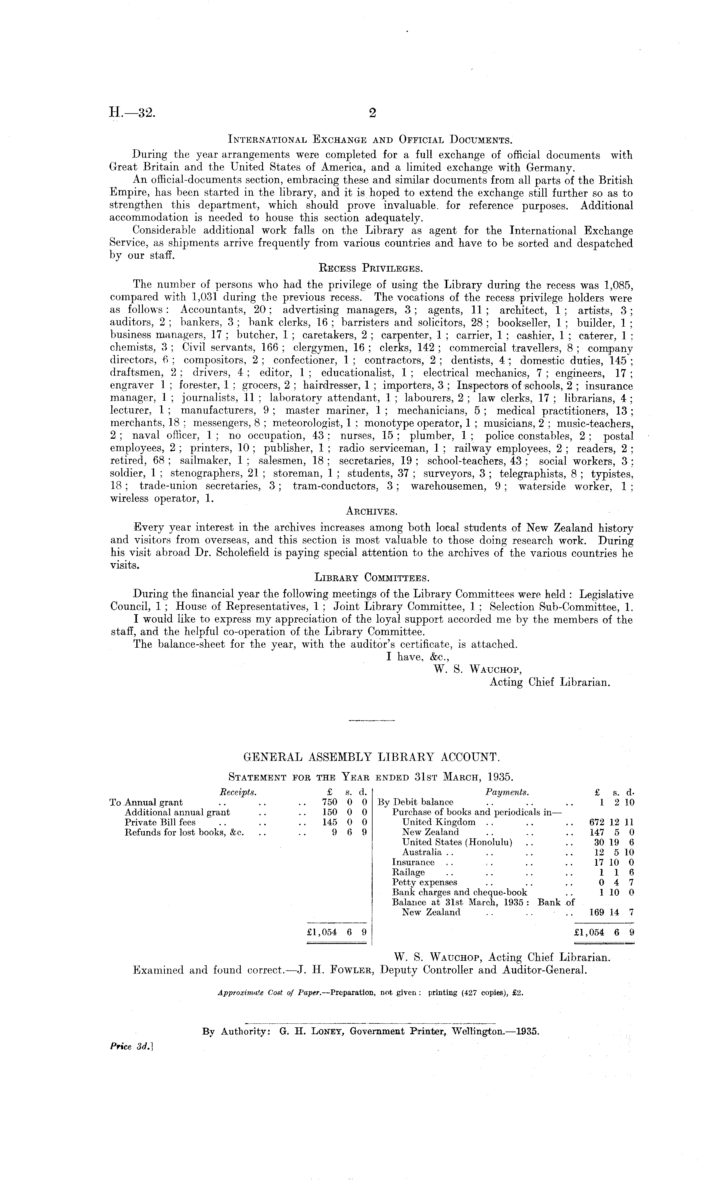 GENERAL ASSEMBLY LIBRARY ACCOUNT. Statement for the Year ended 31st March, 1935. Receipts. £ s. d. Payments. £ s. dTo Annual grant .... .. .. 750 0 0 By Debit balance ... .. .. 1 210 Additional annual grant .. .. 150 0 0 Purchase of books and periodicals in— Private Bill fees .. .. .. 145 0 0 United Kingdom .. .. .. 672 12 11 Refunds for lost books, &c. .. .. 9 6 9 New Zealand .. .. .. 147 5 0 United States (Honolulu) .... .. 30 19 6 Australia .. .. .. .. 12 5 10 Insurance . . . .. .. 17 10 0 Railage .. .. .. .. 116 Petty expenses .. .. .. 0 4 7 Bank charges and cheque-book .. 1 10 0 Balance at 31st. March, 1935 : Bank of New Zealand .. .. 169 14 7 £1,054 6 9 £1,054 6 9 W. S. Wauchop, Acting Chief Librarian. Examined and found correct. —J. H. Fowler, Deputy Controller and Auditor-General.