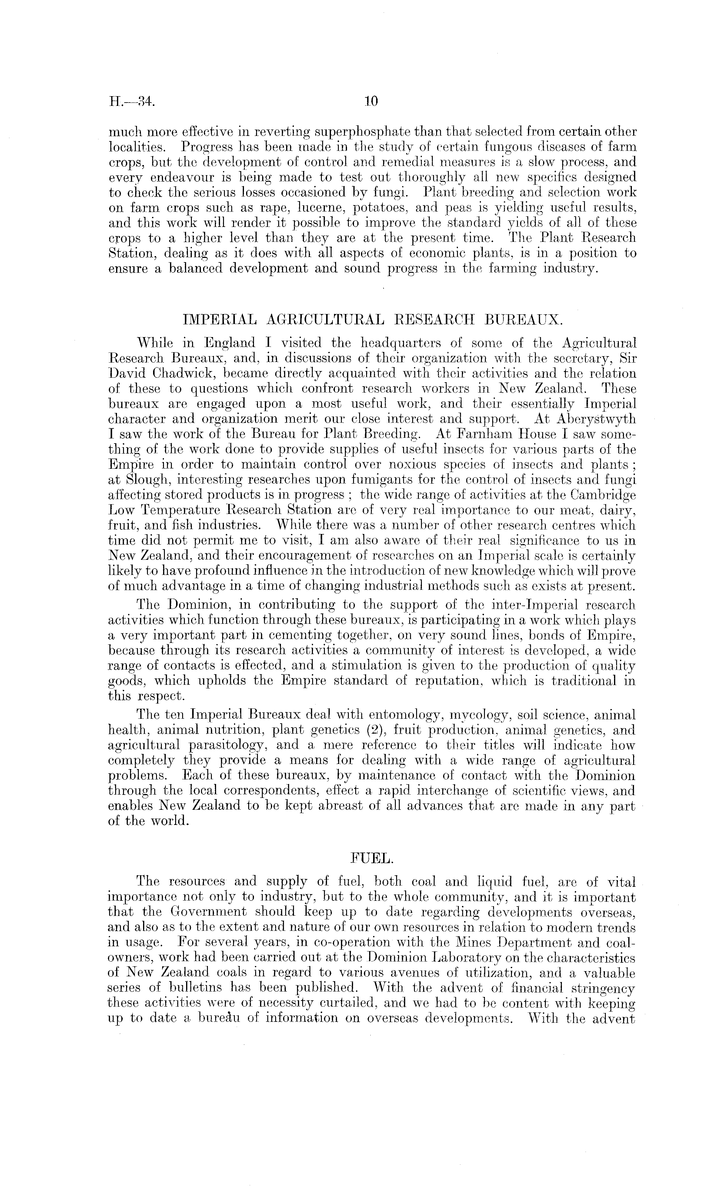 much more effective in reverting superphosphate than that selected from certain other localities. Progress has been made in the study of certain fungous diseases of farm crops, but the development of control and remedial measures is a slow process, and every endeavour is being made to test out thoroughly all new specifics designed to check the serious losses occasioned by fungi. Plant breeding and selection work on farm crops such as rape, lucerne, potatoes, and peas is yielding useful results, and this work will render it possible to improve the standard yields of all of these crops to a higher level than they are at the present time. The Plant Research Station, dealing as it does with all aspects of economic plants, is in a position to ensure a balanced development and sound progress in the farming industry. IMPERIAL AGRICULTURAL RESEARCH BUREAUX. While in England I visited the headquarters of some of the Agricultural Research Bureaux, and, in discussions of their organization with the secretary, Sir David Chadwick, became directly acquainted with their activities and the relation of these to questions which confront research workers in New Zealand. These bureaux are engaged upon a most useful work, and their essentially Imperial character and organization merit our close interest and support. At Aberystwyth I saw the work of the Bureau for Plant Breeding. At Farnham House I saw something of the work done to provide supplies of useful insects for various parts of the Empire in order to maintain control over noxious species of insects and plants ; at Slough, interesting researches upon fumigants for the control of insects and fungi affecting stored products is in progress ; the wide range of activities at the Cambridge Low Temperature Research Station are of very real importance to our meat, dairy, fruit, and fish industries. While there was a number of other research centres which time did not permit me to visit, I am also aware of their real significance to us in New Zealand, and their encouragement of researches on an Imperial scale is certainly likely to have profound influence in the introduction of new knowledge which will prove of much advantage in a time of changing industrial methods such as exists at present. The Dominion, in contributing to the support of the inter-Imperial research activities which function through these bureaux, is participating in a work which plays a very important part in cementing' together, on very sound lines, bonds of Empire, because through its research activities a community of interest is developed, a wide range of contacts is effected, and a stimulation is given to the production of quality goods, which upholds the Empire standard of reputation, which is traditional in this respect. The ten Imperial Bureaux deal with entomology, mycology, soil science, animal health, animal nutrition, plant genetics (2), fruit production, animal genetics, and agricxiltural parasitology, and a mere reference to their titles will indicate how completely they provide a means for dealing with a wide range of agricultural problems. Each of these bureaux, by maintenance of contact with the Dominion through the local correspondents, effect a rapid interchange of scientific views, and enables New Zealand to be kept abreast of all advances that are made in any part of the world. FUEL. The resources and supply of fuel, both coal and liquid fuel, are of vital importance not only to industry, bat to the whole community, and it is important that the Government should keep up to date regarding developments overseas, and also as to the extent and nature of our own resources in relation to modern trends in usage. For several years, in co-operation with the Mines Department and coalowners, work had been carried out at the Dominion Laboratory on the characteristics of New Zealand coals in regard to various avenues of utilization, and a valuable series of bulletins has been published. With, the advent of financial stringency these activities were of necessity curtailed, and we had to be content with keeping up to date a bureau of information on overseas developments. With the advent