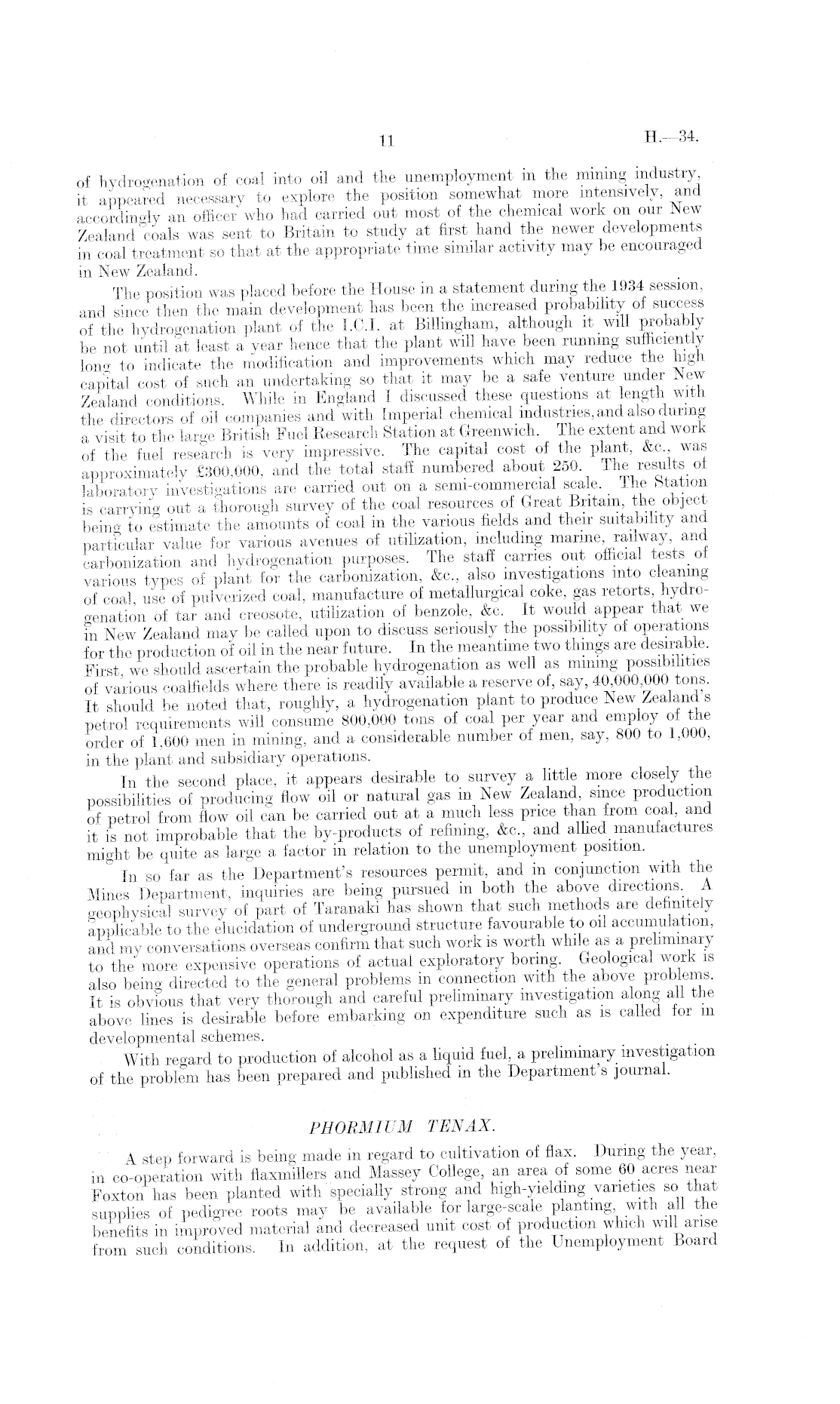 of hydrogenation of coal into oil and the unemployment in the mining industry it appeared necessary to explore the position somewhat more intensively, and accordingly an officer who had carried out most of the chemical work on our Mew Zealand coals was sent to Britain to study at first hand the newer developments in coal treatment so that- at the appropriate time similar activity may be encouraged in New Zealand. The position was placed before the House in a statement during the 1934 session, and since then the main development has been the increased probability of success of the hydrogenation plant of the 1.C.1, at Billingham, although it will probab y be not until at least a year hence that the plant will have been running sufficiently loner to indicate the modification and improvements which may reduce the high capital cost of such an undertaking so that it may be a safe venture under New Zealand conditions. While in England I discussed these questions at length with the directors of oil companies and. with Imperial chemical industries, and also during a visit to the large British Fuel Research Station at Greenwich. The extent and work of the fuel research is very impressive. The capital cost of the plant, &c. was approximately £300,000, and the total staff numbered about 250 The results of laboratory investigations are carried out on a semi-commercial scale, ihe btation is carrying out a thorough survey of the coal resources of Great Britain, the object being to estimate the amounts of coal in the various fields and their suitability and particular value for various avenues of utilization, including marine, railway and carbonization and hydrogenation purposes. The staff carries out official tests ol various types of plant for the carbonization, &c„ also investigations into cleaning of coal use of pulverized coal, manufacture of metallurgical coke, gas retorts hydrogenation of tar and creosote, utilization of benzole, &c. It would appear that we in New Zealand may be called upon to discuss seriously the possibility of operations for the production of oil in the near future. In the meantime two things are desirable. First we should ascertain the probable hydrogenation as well as mmmg possibilities of various coalfields where there is readily available a reserve of, say, 40 000,000 tons. It should be noted that, roughly, a hydrogenation plant to produce New Zealand s petrol requirements will consume 800,000 tons of coa per year and employ of the order of 1,600 men in mining, and a considerable number of men, say, 800 to 1,000, in the plant and subsidiary operations. In the second place, it appears desirable to survey a little more closely the possibilities of producing flow oil or natural gas in New Zealand, since production of petrol from flow oil can be carried out at a much less price than from coal, and it is not improbable that the by-products of refining, &c., and allied manufactures might be quite as large a factor in relation to the unemployment position. ' In so far as the Department's resources permit, and in conjunction with the Mines Department, inquiries are being pursued in both the above directions A geophysical survey of part of Taranaki has shown that such methods are definitely applicable to the elucidation of underground structure favourable to oil accumulation, and my conversations overseas confirm that such work is worth while as a preliminary to the more expensive operations of actual exploratory boring. Geological work is also being directed to the general problems m connection with the above problems. It is obvious that very thorough and careful preliminary investigation along all the above lines is desirable before embarking on expenditure such as is called tor m developmental schemes. With regard to production of alcohol as a liquid fuel, a preliminary investigation of the problem has been prepared and published in the Department s journal. PHORMIUM TEN AX. A step forward is being made in regard to cultivation of flax. During the year, in co-operation with flaxmillers and Massey College, an area of some 60 acres near Foxton has been planted with specially strong and high-yielding varieties so that supplies of pedigree roots may be available for large-scale planting with all the benefits in improved material and decreased unit cost of production which will arise from such conditions. In addition, at the request of the Unemployment Board