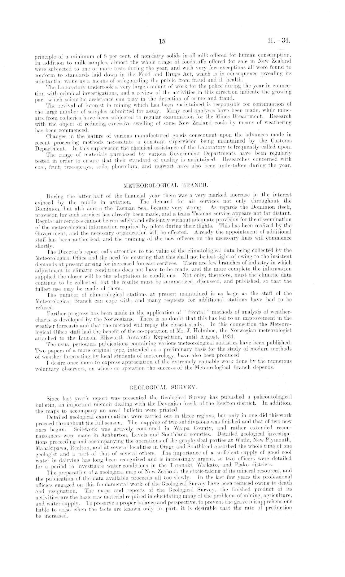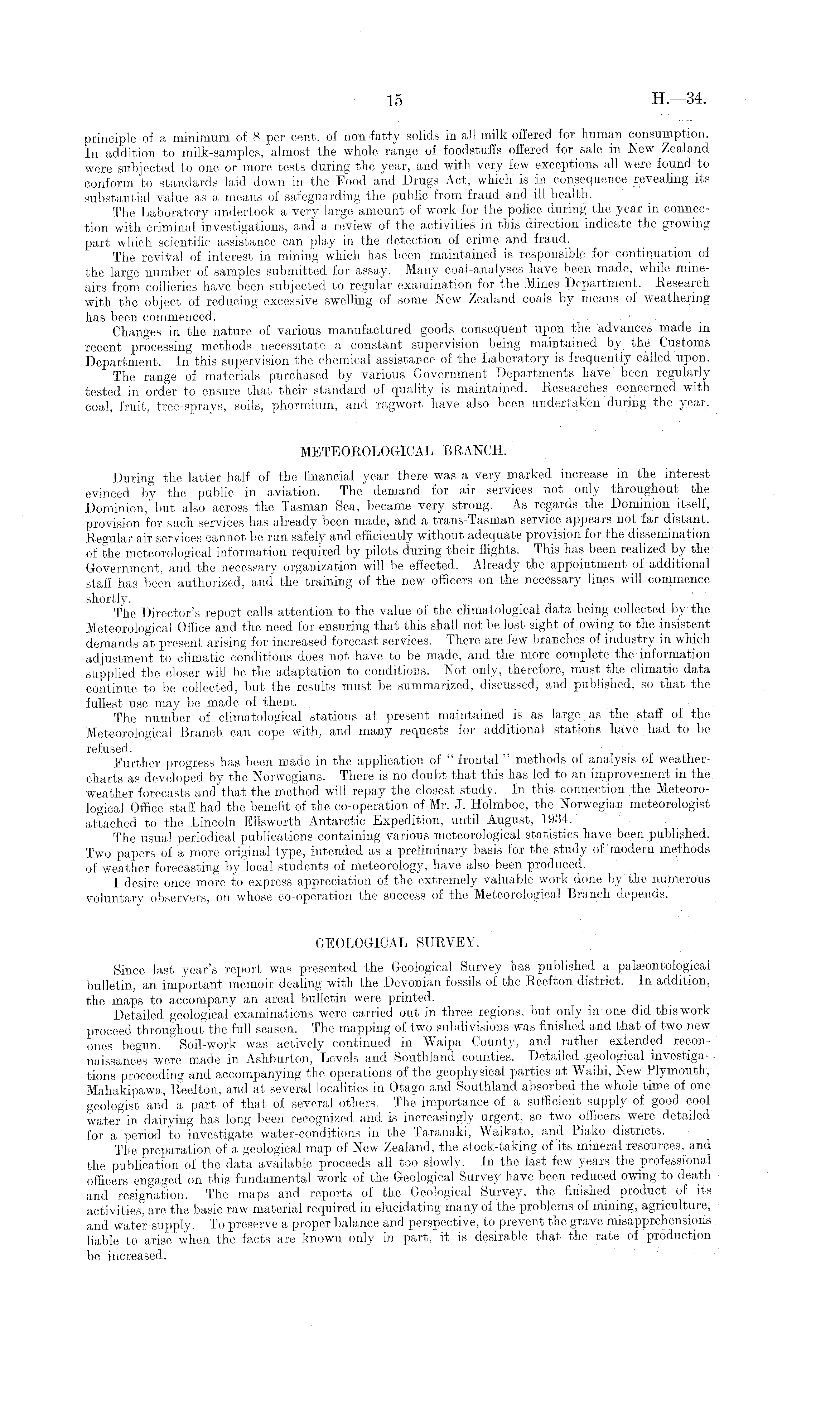 principle of a minimum of 8 per cent, of non-fatty solids in all milk offered for human consumption. In addition to milk-samples, almost the whole range of foodstuffs offered for sale in New Zealand were subjected to one or more tests during the year, and with very few exceptions all were found to conform to standards laid down in the Food and Drugs Act, which is in consequence revealing its substantial value as a means of safeguarding the public from fraud and ill health. The Laboratory undertook a very large amount of work for the police during the year in connection with criminal investigations, and a review of the activities in this direction indicate the growing part which scientific assistance can play in the detection of crime and fraud. The revival of interest in mining which has been maintained is responsible for continuation of the large number of samples submitted for assay. Many coal-analyses have been made, while mineairs from collieries have been subjected to regular examination for.the Mines Department. Research with the object of reducing excessive swelling of some New Zealand coals by means of weathering has been commenced. Changes in the nature of various manufactured goods consequent upon the advances made in recent processing methods necessitate a constant supervision being maintained by the Customs Department. In this supervision the chemical assistance of the Laboratory is frequently called upon. The range of materials purchased by various Government Departments have been regularly tested in order to ensure that their standard of quality is maintained. Researches concerned with coal, fruit, tree-sprays, soils, phormium, and ragwort have also been undertaken during the year. METEOROLOGICAL BRANCH. During the latter half of the financial year there was a very marked increase in the interest evinced by the public in aviation. The demand for air services not only throughout the Dominion, but also across the Tasman Sea, became very strong. As regards the Dominion itself, provision for such services has already been made, and a trans-Tasman service appears not far distant. Regular air services cannot be run safely and efficiently without adequate provision for the dissemination of the meteorological information required by pilots during their flights. This has been realized by the Government, and the necessary organization will be effected. Already the appointment of additional staff has been authorized, and the training of the new officers on the necessary lines will commence shortly. The Director's report calls attention to the value of the climatological data being collected by the Meteorological Office and the need for ensuring that this shall not be lost sight of owing to the insistent demands at present arising for increased forecast services. There are few branches of industry in which adjustment to climatic conditions does not have to be made, and the more complete the information supplied the closer will be the adaptation to conditions. Not only, therefore, must the climatic data continue to be collected, but the results must be summarized, discussed, and published, so that the fullest use may be made of them. The number of climatological stations at present maintained is as large as the staff of the Meteorological Branch can cope with, and many requests for additional stations have had to be refused. Further progress has been made in the application of frontal methods of analysis of weathercharts as developed by the Norwegians. There is no doubt that this has led to an improvement in the weather forecasts and that the method will repay the closest study. In this connection the Meteoiological Office staff had the benefit of the co-operation of Mr. J. Holmboe, the Norwegian meteorologist attached to the Lincoln Ellsworth Antarctic Expedition, until August, 1934. The usual periodical publications containing various meteorological statistics have been published. Two papers of a more original type, intended as a preliminary basis for the study of modern methods of weather forecasting by local students of meteorology, have also been produced. I desire once more to express appreciation of the extremely valuable work done by the numerous voluntary observers, on whose co-operation the success of the Meteorological Branch depends. GEOLOGICAL SURVEY. Since last year's report was presented the Geological Survey has published a palseontological bulletin, an important memoir dealing with the Devonian fossils of the Reefton district. In addition, the maps to accompany an areal bulletin were printed. Detailed geological examinations were carried out in three regions, but only in one did this work proceed throughout the full season. The mapping of two subdivisions was finished and that of two new ones begun. Soil-work was actively continued in Waipa County, and rather extended reconnaissances were made in Ashburton, Levels and Southland counties. Detailed geological investigations proceeding and accompanying the operations of the geophysical parties at Waihi, New Plymouth, Mahakipawa, Reefton, and at several localities in Otago and Southland absorbed the whole time of one geologist and a part of that of several others. The importance of a sufficient supply of good cool water in dairying has long been recognized and is increasingly urgent, so two officers were detailed for a period to investigate water-conditions in the Taranaki, Waikato, and Piako districts. The preparation of a geological map of New Zealand, the stock-taking of its mineral resources, and the publication of the data available proceeds all too slowly. In the last few years the professional officers engaged on this fundamental work of the Geological Survey have been reduced owing to death and resignation. The maps and reports of the Geological Survey, the finished product of its activities, are the basic raw material required in elucidating many of the problems of mining, agriculture, and water-supply. To preserve