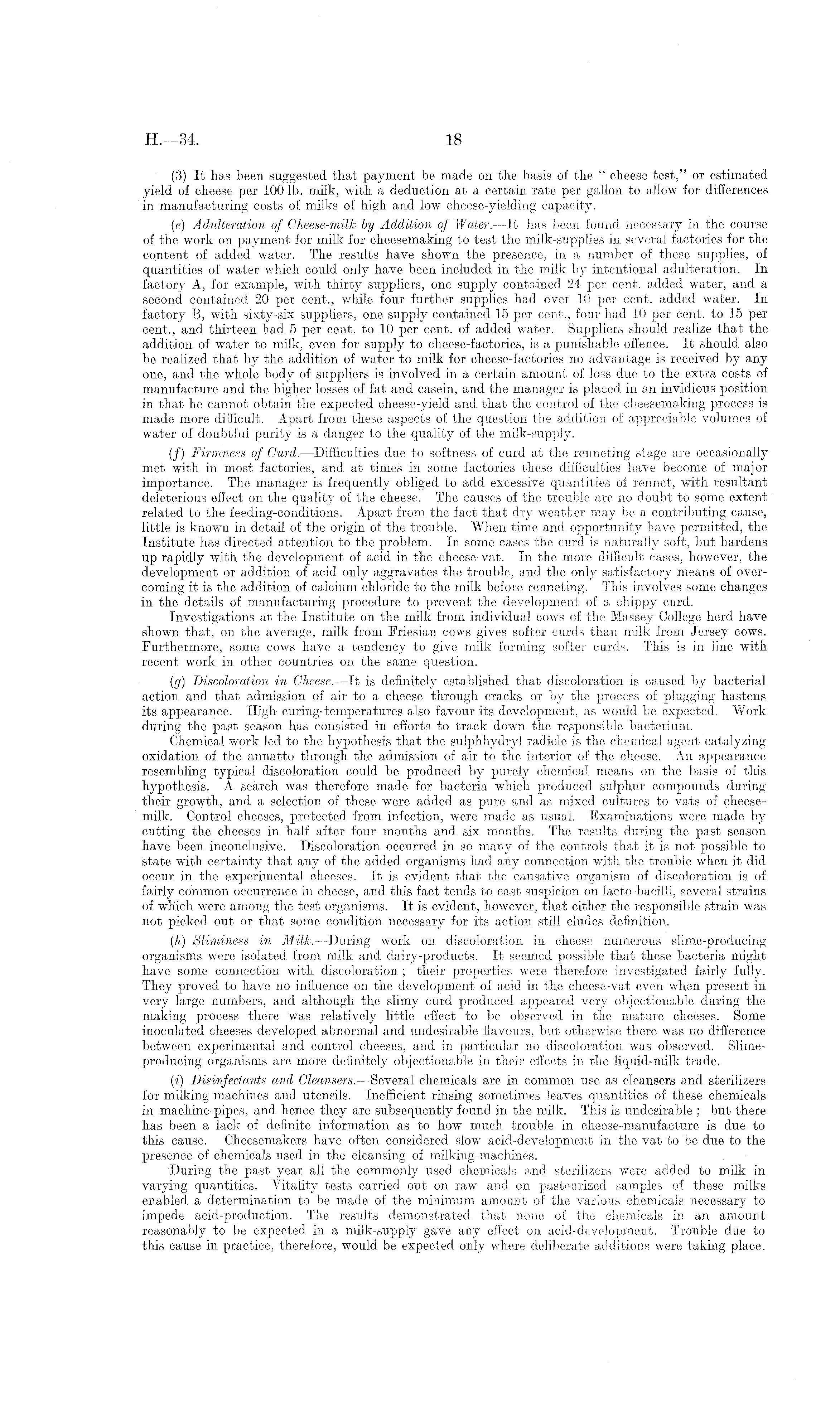 (3) It has been suggested that payment be made on the basis of the " cheese test," or estimated yield of cheese per 100 lb. milk, with a deduction at a certain rate per gallon to allow for differences in manufacturing costs of milks of high and low cheese-yielding capacity. (e) Adulteration of Cheese-milk by Addition of Water. —It has been found necessary in the course of the work on payment for milk for cheesemaking to test the milk-supplies in several factories for the content of added water. The results have shown the presence, in a number of these supplies, of quantities of water which could only have been included in the milk by intentional adulteration. In factory A, for example, with thirty suppliers, one supply contained 21- per cent, added water, and a second contained 20 per cent., while four further supplies had over 10 per cent, added water. In factory B, with sixty-six suppliers, one supply contained 15 per cent., four had 10 per cent, to 15 per cent., and thirteen had 5 per cent, to 10 per cent, of added water. Suppliers should realize that the addition of water to milk, even for supply to cheese-factories, is a punishable offence. It should also be realized that by the addition of water to milk for cheese-factories no advantage is received by any one, and the whole body of suppliers is involved in a certain amount of loss due to the extra costs of manufacture and the higher losses of fat and casein, and the manager is placed in an invidious position in that he cannot obtain the expected cheese-yield and that the control of the cheesemaking process is made more difficult. Apart from these aspects of the question the addition of appreciable volumes of water of doubtful purity is a danger to the quality of the milk-supply. (/) Firmness of Curd. —Difficulties due to softness of curd at the renneting stage are occasionally met with in most factories, and at times in some factories these difficulties have become of major importance. The manager is frequently obliged to add excessive quantities of rennet, with resultant deleterious effect on the quality of the cheese. The causes of the trouble are no doubt to some extent related to the feeding-conditions. Apart from the fact that dry weather may be a contributing cause, little is known in detail of the origin of the trouble. When time and opportunity have permitted, the Institute has directed attention to the problem. In some cases the curd is naturally soft, but hardens up rapidly with the development of acid in the cheese-vat. In the more difficult cases, however, the development or addition of acid only aggravates the trouble, and the only satisfactory means of overcoming it is the addition of calcium chloride to the milk before renneting. This involves some changes in the details of manufacturing procedure to prevent the development of a chippy curd. Investigations at the Institute on the milk from individual cows of the Massey College herd have shown that, on the average, milk from Friesian cows gives softer curds than milk from Jersey cows. Furthermore, some cows have a tendency to give milk forming softer curds. This is in line with recent work in other countries on the same question. (g) Discoloration in Cheese. —It is definitely established that discoloration is caused by bacterial action and that admission of air to a cheese through cracks or by the process of plugging hastens its appearance. High curing-temperatures also favour its development, as would be expected. Work during the past season has consisted in efforts to track down the responsible bacterium. Chemical work led to the hypothesis that the sulphhydryl radicle is the chemical agent catalyzing oxidation of the annatto through the admission of air to the interior of the cheese. An appearance resembling typical discoloration could be produced by purely chemical means on the basis of this hypothesis. A search was therefore made for bacteria which produced sulphur compounds during their growth, and a selection of these were added as pure and as mixed cultures to vats of cheesemilk. Control cheeses, protected from infection, were made as usual. Examinations were made by cutting the cheeses in half after four months and six months. The results during the past season have been inconclusive. Discoloration occurred in so many of the controls that it is not possible to state with certainty that any of the added organisms had any connection with the trouble when it did occur in the experimental cheeses. It is evident that the causative organism of discoloration is of fairly common occurrence in cheese, and this fact tends to cast suspicion on lacto-bacilli, several strains of which were among the test organisms. It is evident, however, that either the responsible strain was not picked out or that some condition necessary for its action still eludes definition. (h) Sliminess in Milk.—During work on discoloration in cheese numerous slime-producing organisms were isolated from milk and dairy-products. It seemed possible that these bacteria might have some connection with discoloration ; their properties were therefore investigated fairly fully. They proved to have no influence on the development of acid in the cheese-vat even when present in very large numbers, and although the slimy curd produced appeared very objectionable during the making process there was relatively little effect to be observed in the mature cheeses. Some inoculated cheeses developed abnormal and undesirable flavours, but otherwise there was no difference between experimental and control cheeses, and in particular no discoloration was observed. Slimeproducing organisms are more definitely objectionable in their effects in the liquid-milk trade. (i) Disinfectants and Cleansers.—Several chemicals are in common use as cleansers and sterilizers for milking machines and utensils. Inefficient rinsing sometimes leaves quantities of these chemicals in machine-pipes, and hence they are subsequently 