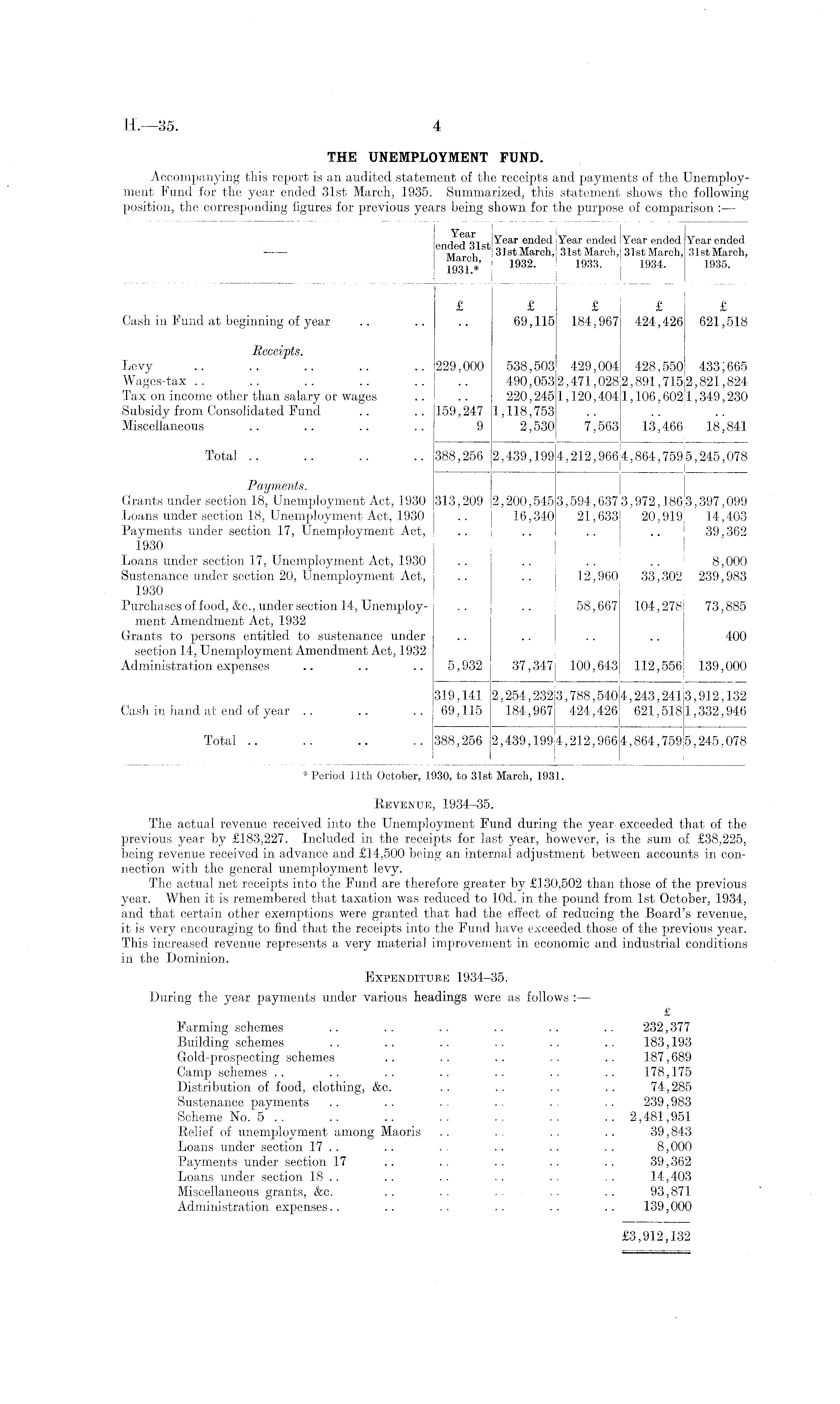 THE UNEMPLOYMENT FUND. Accompanying this report is an audited statement of the receipts and payments of the Unemployment Fund for the year ended 31st March, 1935. Summarized, this statement shows the following position, the corresponding figures for previous years being shown for the purpose of comparison : —
