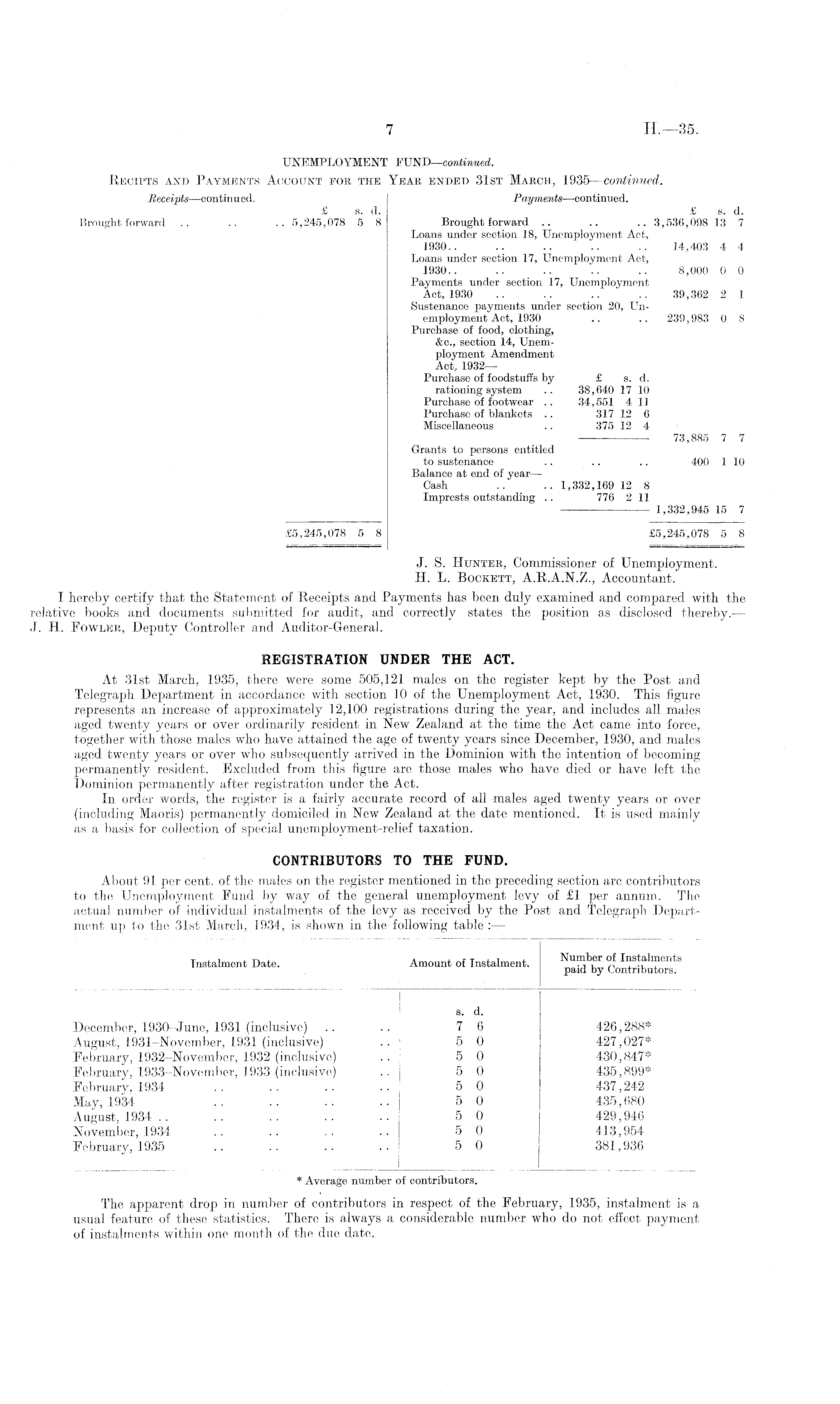 UNEMPLOYMENT FUND—continued. Recipts and Payments Account for the Year ended 31st March, 1.935 —continued. Receipts—continued. Payments—continued. £ s. d. £ s. d. Brought forward .. .. .. 5,245,078 5 8 Brought forward .. .. .. 3,536,098 13 7 Loans under section 18, Unemployment Act, 1930.. .. .. .. .. 14,403 4 4 Loans under section 17, Unemployment Act, 1930.. .. .. '.. .. 8,000 0 0 Payments under section 17, Unemployment Act, 1930 .. .. .. .. 39,362 2 1 Sustenance payments under section 20, Unemployment Act, 1930 .. .. 239,983 0 8 Purchase of food, clothing, &c., section 14, Unemployment Amendment Act, 1932— Purchase of foodstuffs by £ s. d. rationing system .. 38,640 17 10 Purchase of footwear .. 34,551 4 11 Purchase of blankets .. 317 12 6 Miscellaneous .. 375 12 4 73,885 7 7 Grants to persons entitled to sustenance .. .. .. 400 1 10 Balance at end of year — Cash .. .. 1,332,169 12 8 Imprests outstanding .. 776 2 11 1,332,945 15 7 £5,245,078 5 8 £5,245,078 5 8 J. S. Hunter, Commissioner of Unemployment. H. L. Bockett, A.R.A.N.Z., Accountant. I hereby certify that the Statement of Receipts and Payments has been duly examined and compared with the relative books and documents submitted for audit, and correctly states the position as disclosed thereby.— J. H. Fowler, Deputy Controller and Auditor-General. REGISTRATION UNDER THE ACT. At 31st March, 1935, there were some 505,121 males on the register kept by the Post and Telegraph Department in accordance with section 10 of the Unemployment Act, 1930. This figure represents an increase of approximately 12,100 registrations during the year, and includes all males aged twenty years or over ordinarily resident in New Zealand at the time the Act came into force, together with those males who have attained the age of twenty years since December, 1930, and males aged twenty years or over who subsequently arrived in the Dominion with the intention of becoming permanently resident. Excluded from this figure are those males who have died or have left the Dominion permanently after registration under the Act. In order words, the register is a fairly accurate record of all males aged twenty years or over (including Maoris) permanently domiciled in New Zealand at the date mentioned. It is used mainly as a basis for collection of special unemployment-relief taxation. CONTRIBUTORS TO THE FUND. About 91 per cent, of the males on the register mentioned in the preceding section are contributors to the Unemployment Fund by way of the general unemployment levy of £1 per annum. The actual number of individual instalments of the levy as received by the Post and Telegraph Department up to the 31st March, 1934, is shown in the following table : —