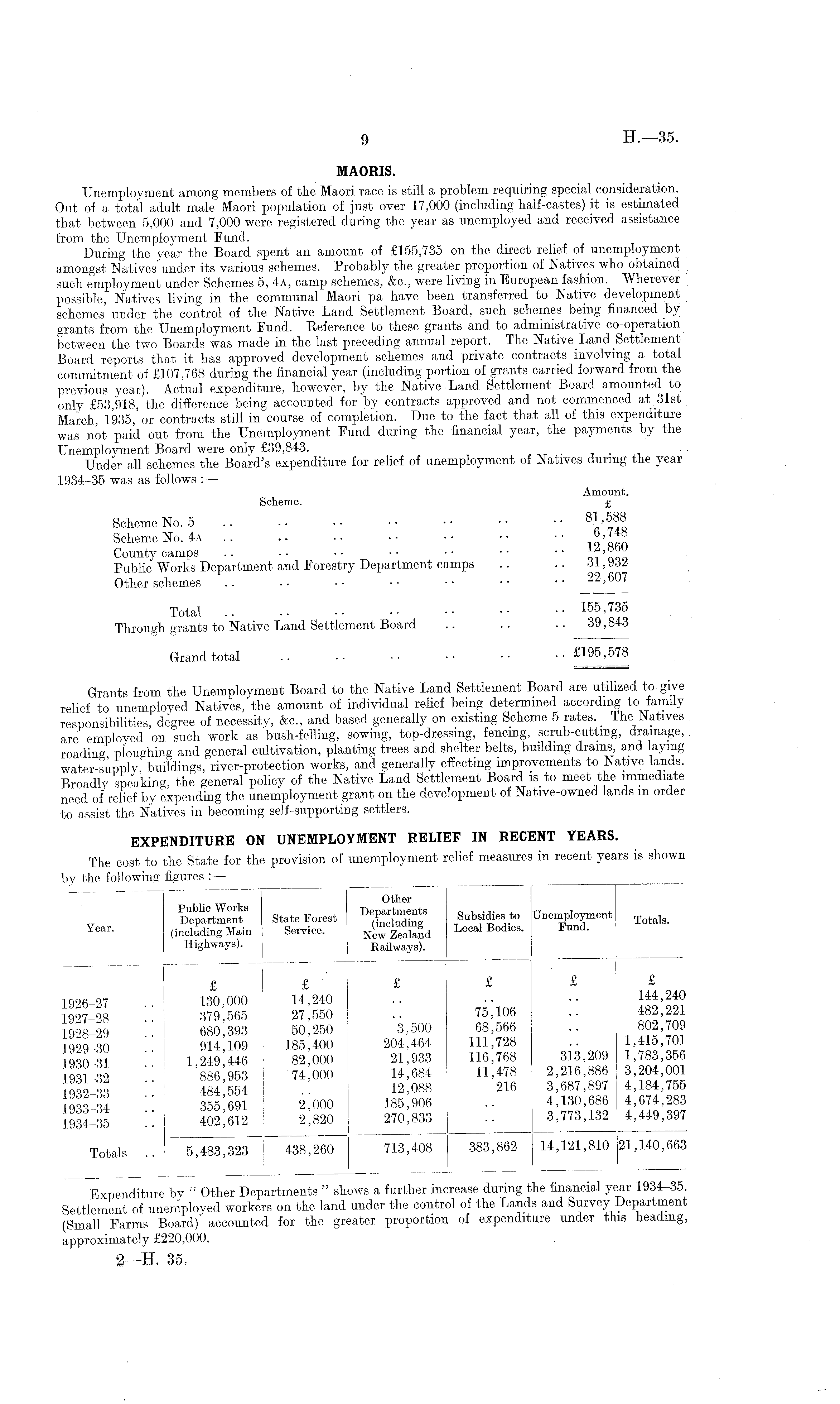 MAORIS. Unemployment among members of the Maori race is still a problem requiring special consideration. Out of a total adult male Maori population of just over 17,000 (including half-castes) it is estimated that between 5,000 and 7,000 were registered during the year as unemployed and received assistance from the Unemployment Fund. During the year the Board spent an amount of £155,735 on the direct relief of unemployment amongst Natives under its various schemes. Probably the greater proportion of Natives who obtained such employment under Schemes 5, 4a, camp schemes, &c., were living in European fashion. Wherever possible, Natives living in the communal Maori pa have been transferred to Native development schemes under the control of the Native Land Settlement Board, such schemes being financed by grants from the Unemployment Fund. Reference to these grants and to administrative co-operation between the two Boards was made in the last preceding annual report. The Native Land Settlement Board reports that it has approved development schemes and private contracts involving a total commitment of £107,768 during the financial year (including portion of grants carried forward from the previous year). Actual expenditure, however, by the Native .Land Settlement Board amounted to only £53,918, the difference being accounted for by contracts approved and not commenced at 31st March, 1935,' or contracts still in course of completion. Due to the fact that all of this expenditure was not paid out from the Unemployment Fund during the financial year, the payments by the Unemployment Board were only £39,843. _ Under all schemes the Board's expenditure for relief of unemployment of Natives during the year 1934-35 was as follows :—- Amount. Scheme. £ Scheme No. 5 .. .. •• •• •• •• •• Scheme No. 4a •• •• 6,7 8 County camps .. .. •• •• •• •• •• ° Public Works Department and Forestry Department camps .. .. 31,93Z Other schemes .. .. • ■ • - • • • • .. 22,607 Total 155,735 Through grants to Native Land Settlement Board .. .. •• 39,843 Grand total .. •• •• •• •• •• £195,578 Grants from the Unemployment Board to the Native Land. Settlement Board are utilized to give relief to unemployed Natives, the amount of individual relief being determined according to family responsibilities, degree of necessity, &c., and based generally on existing Scheme 5 rates. The Natives are employed on such work as bush-felling, sowing, top-dressing, fencing, scrub-cutting, drainage, roading, ploughing and general cultivation, planting trees and shelter belts, building drains, and laying water-supply, buildings, river-protection works, and generally effecting improvements to Native lands. Broadly speaking, the general policy of the Native Land Settlement Board is to meet the immediate need of relief by expending the unemployment grant on the development of Native-owned lands m order to assist the Natives in becoming self-supporting settlers. EXPENDITURE ON UNEMPLOYMENT RELIEF IN RECENT YEARS. The cost to the State for the provision of unemployment relief measures in recent years is shown by the following figures : —