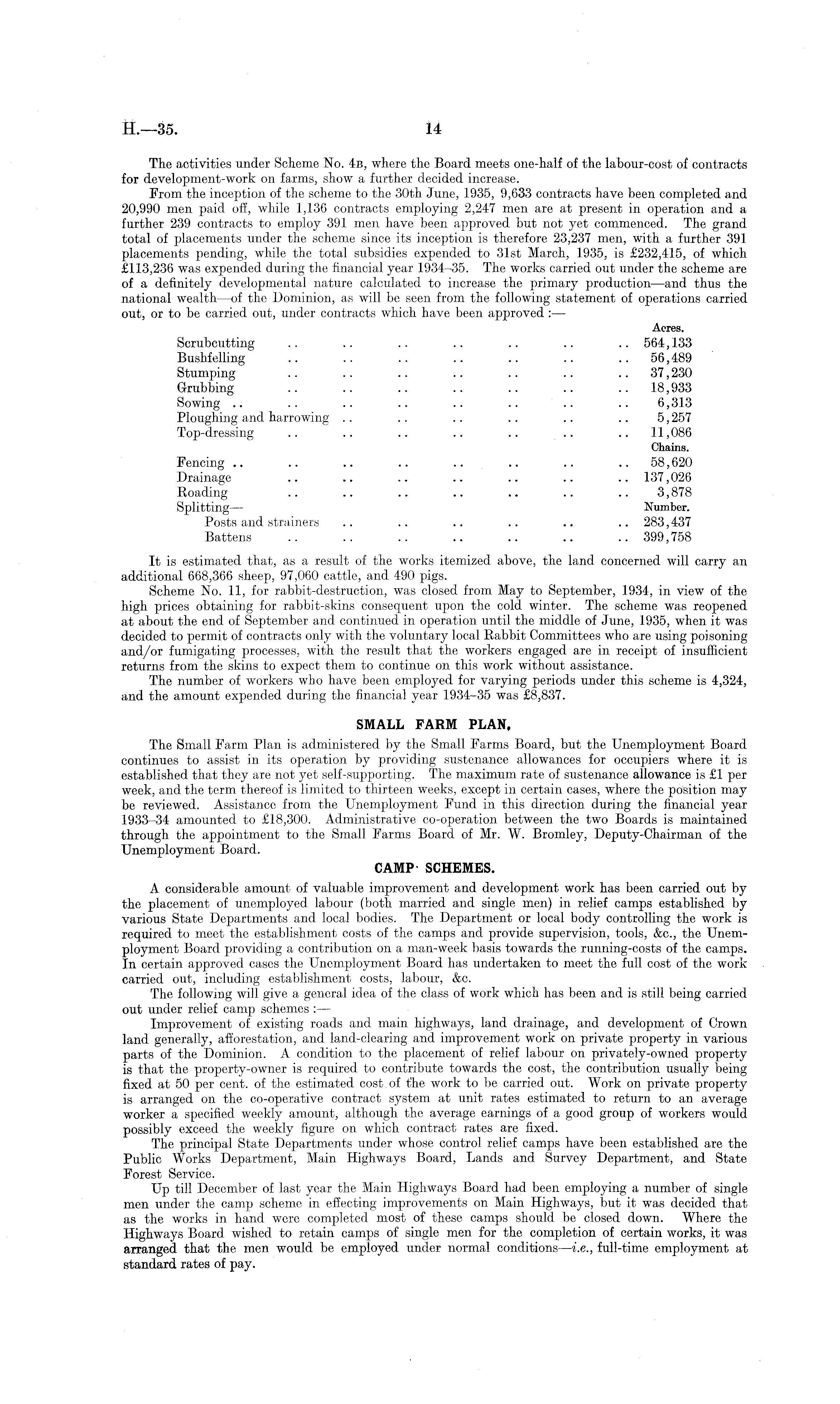 The activities under Scheme No. 4b, where the Board meets one-half of the labour-cost of contracts for development-work on farms, show a further decided increase. From the inception of the scheme to the 30th June, 1935, 9,633 contracts have been completed and 20,990 men paid off, while 1,136 contracts employing 2,247 men are at present in operation and a further 239 contracts to employ 391 men have been approved but not yet commenced. The grand total of placements under the scheme since its inception is therefore 23,237 men, with a further 391 placements pending, while the total subsidies expended to 31st March, 1935, is £232,415, of which £113,236 was expended during the financial year 1934-35. The works carried out under the scheme are of a definitely developmental nature calculated to increase the primary production—and thus the national wealth —of the Dominion, as will be seen from the following statement of operations carried out, or to be carried out, under contracts which have been approved : — Acres. Scrubcutting .. .. .. .. .. .. .. 564,133 Bushfelling .. .. .. .. .. .. .. 56,489 Stumping .. .. .. .. .. .. 37,230 G-rubbing .. .. .. .. .. .. 18,933 Sowing .. .. .. .. .. .. .. .. 6,313 Ploughing and harrowing .. .. .. .. ... .. 5,257 Top-dressing .. .. .. .. .. .. .. 11,086 Chains. Fencing .. .. .. .. .. .. .. 58,620 Drainage ... .. .. .. .. .. .. 137,026 Roading .. .. .. .. .. .. .. 3,878 Splitting— Number. Posts and strainers .. .. .. .. .. .. 283,437 Battens .. .. .. .. .. .. .. 399,758 It is estimated that, as a result of the works itemized above, the land concerned will carry an additional 668,366 sheep, 97,060 cattle, and 490 pigs. Scheme No. 11, for rabbit-destruction, was closed from May to September, 1934, in view of the high prices obtaining for rabbit-skins consequent upon the cold winter. The scheme was reopened at about the end of September and continued in operation until the middle of June, 1935, when it was decided to permit of contracts only with the voluntary local Rabbit Committees who are using poisoning and/or fumigating processes, with the result that the workers engaged are in receipt of insufficient returns from the skins to expect them to continue on this work without assistance. The number of workers who have been employed for varying periods under this scheme is 4,324, and the amount expended during the financial year 1934-35 was £8,837. SMALL FARM PLAN, The Small Farm Plan is administered by the Small Farms Board, but the Unemployment Board continues to assist in its operation by providing sustenance allowances for occupiers where it is established that they are not yet self-supporting. The maximum rate of sustenance allowance is £1 per week, and the term thereof is limited to thirteen weeks, except in certain cases, where the position may be reviewed. Assistance" from the Unemployment Fund in this direction during the financial year 1933-34 amounted to £18,300. Administrative co-operation between the two Boards is maintained through the appointment to the Small Farms Board of Mr. W. Bromley, Deputy-Chairman of the Unemployment Board. CAMP SCHEMES. A considerable amount of valuable improvement and development work has been carried out by the placement of unemployed labour (both married and single men) in relief camps established by various State Departments and local bodies. The Department or local body controlling the work is required to meet the establishment costs of the camps and provide supervision, tools, &c., the Unemployment Board providing a contribution on a man-week basis towards the running-costs of the camps. In certain approved cases the Unemployment Board has undertaken to meet the full cost of the work carried out, including establishment costs, labour, &c. The following will give a general idea of the class of work which has been and is still being carried out under relief camp schemes : — Improvement of existing roads and main highways, land drainage, and development of Crown land generally, afforestation, and land-clearing and improvement work on private property in various parts of the Dominion. A condition to the placement of relief labour on privately-owned property is that the property-owner is required to contribute towards the cost, the contribution usually being fixed at 50 per cent, of the estimated cost of the work to be carried out. Work on private property is arranged on the co-operative contract system at unit rates estimated to return to an average worker a specified weekly amount, although the average earnings of a good group of workers would possibly exceed the weekly figure on which contract rates are fixed. The principal State Departments under whose control relief camps have been established are the Public Works Department, Main Highways Board, Lands and Survey Department, and State Forest Service. Up till December of last year the Main Highways Board had been employing a number of single men under the camp scheme in effecting improvements on Main Highways, but it was decided that as the works in hand were completed most of these camps should be closed down. Where the Highways Board wished to retain camps of single men for the completion of certain works, it was arranged that the men would be employed under normal conditions —i.e., full-time employment at standard rates of pay.