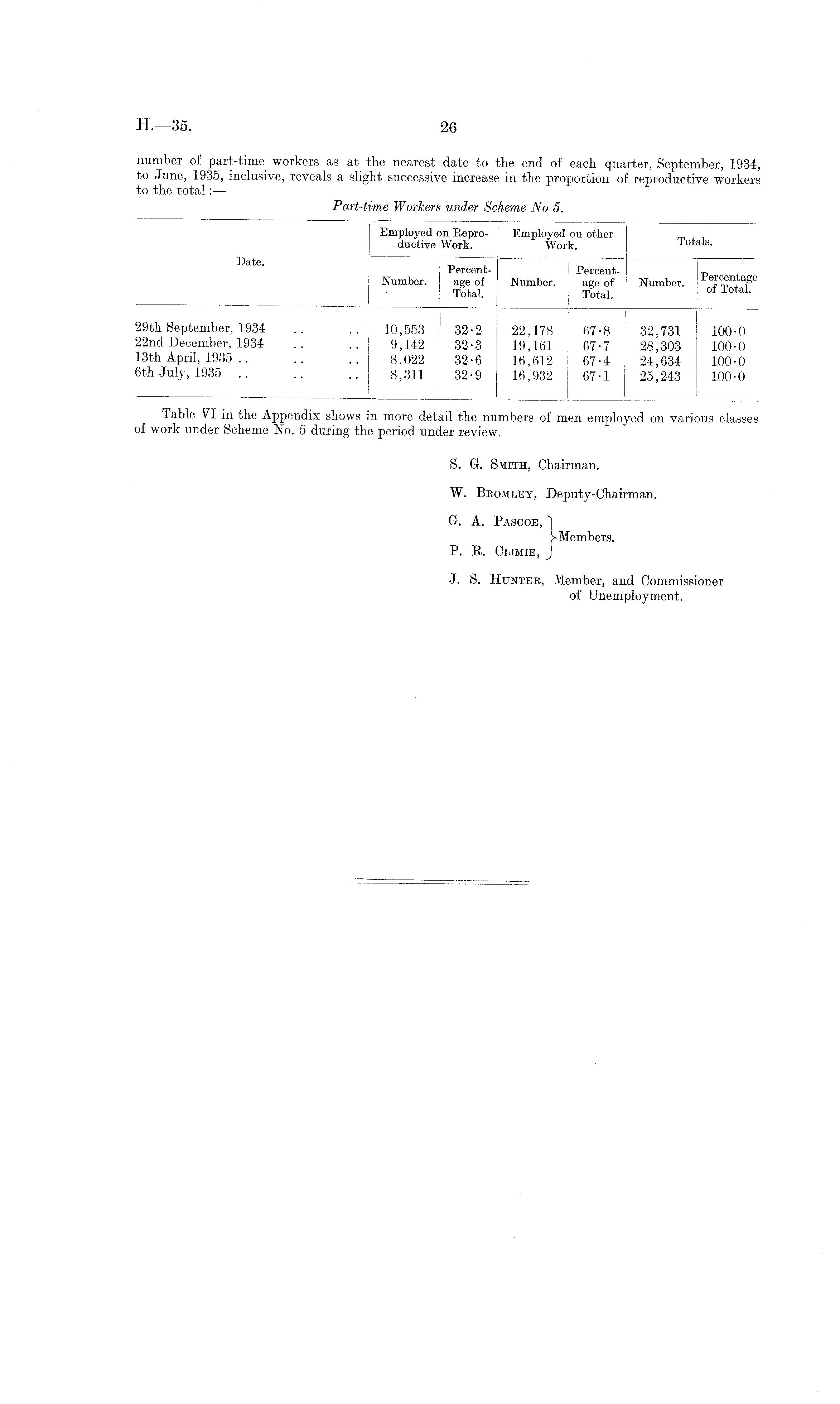 Table VI in the Appendix shows in more detail the numbers of men employed on various classes of work under Scheme No. 5 during the period under review. S. G. Smith, Chairman. W. Bromley, Deputy-Chairman. G. A. Pascoe, ") Members. P. R. Climie, J J. S. Hxjnter, Member, and Commissioner of Unemployment.
