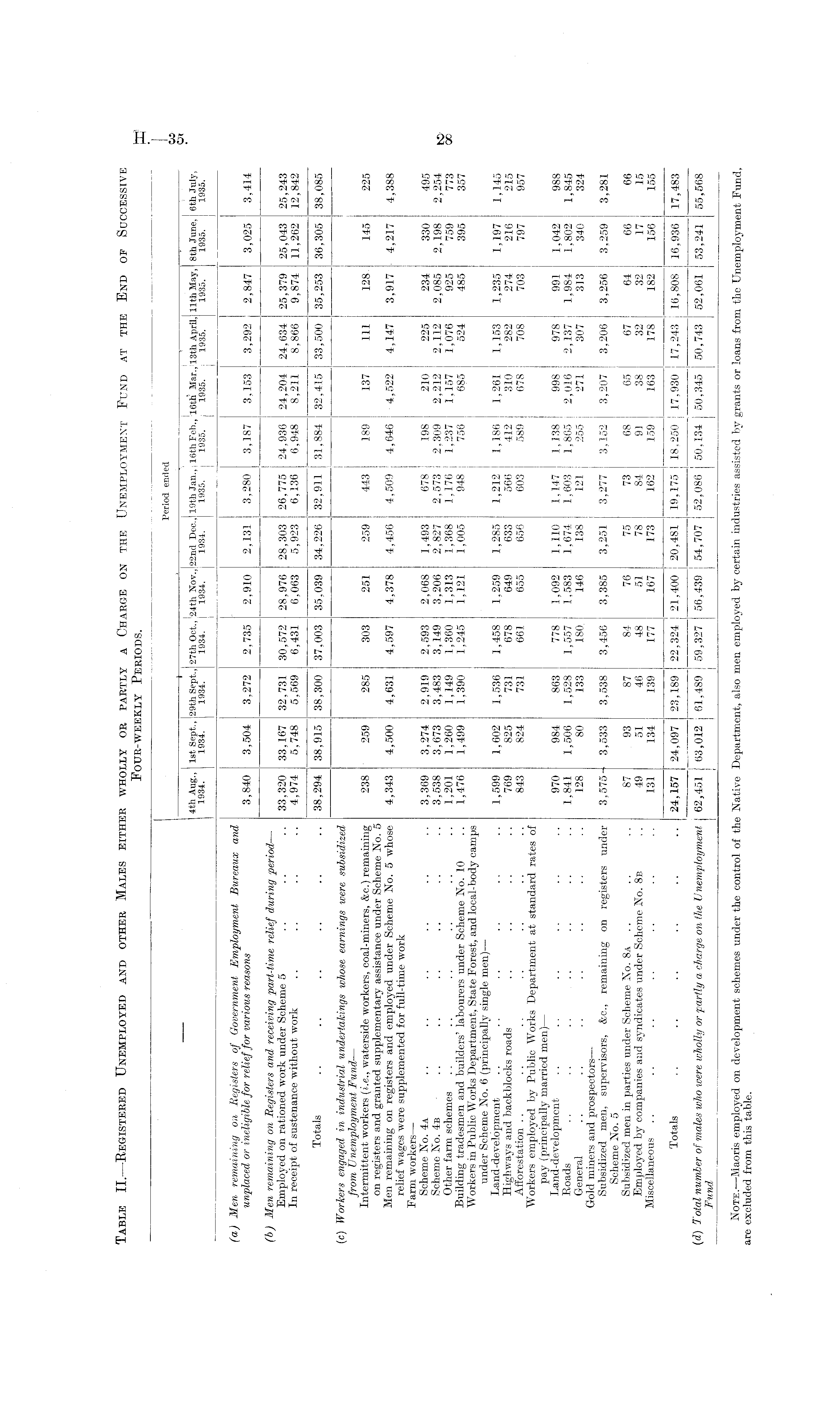 Period ended : 4th Aug., 1st Sept., 29th Sept., 27th Oct., I24tli Nov., 22nd Dec., 19th Jan., 16th Feb., 'l6th Mar., j 13th April, 11th May, 8th June, 6th July, 1934. 1934. 1934. 1934. I 1934. 1934. 1938. 1935. 1935. 1935. 1935. 1935. 1935. (a) Men remaining on -Registers of Government Employment Bureaux and unplaced or ineligible for relief for various reasons 3,840 3,504 3,272 2,735 2,910 2,131 3,280 3,187 3,153 3,292 2,847 3,025 3,414 (b) Men remaining on Registers and receiving part-time relief during period — Employed on rationed wort under Scheme 5 .. .. .. 33,320 33,167 32,731 30,572 28,976 28,303 26,775 24,936 24,204 24,634 25,379 25,043 25,243 In receipt of sustenance without work .. .. .. .. 4,974 5,748 5,569 6,431 6,063 5,923 6,136 6,948 8,211 8,866 9,874 11,262 12,842 Totals .. .. .. .. .. .. 38,294 38,915 38,300 37,003 35,039 34,226 32,911 31,884 32,415 33,500 35,253 36,305 38,085 (c) Workers engaged in industrial undertakings whose earnings were subsidized. from Unemployment Fund — Intermittent workers (i.e., waterside workers, coal-miners, &e.) remaining 238 259 285 303 251 259 443 189 137 111 128. 145 225 on registers and granted supplementary assistance under Scheme No. 5 Men remaining on registers and employed under Scheme No. 5 whose 4,343 4,500 4,631 4,597 4,378 4,456 4,509 4,646 4,522 4,147 3,917 4,217 4,388 relief wages were supplemented for full-time work Farm workers — Scheme No. 4a .. .. .. .. .. .. 3,369 3,274 2,919 2,593 2,068 1,493 678 198 210 225 234 330 495 Scheme No. 4b .. .. .. .. .. .. 3,538 3,673 3,483 3,149 3,206 2,827 2,573 2,309 2,212 2,112 2,085 2,198 2,254 Other farm schemes .. .. .. .. .. .. 1,201 1,260 1,149 1,360 1,313 1,368 1,176 1,237 1,157 1,076 925 759 773 Building tradesmen and builders'labourers under Scheme No. 10 .. 1,476 1,499 1,390 1,245 1,121 1,005 948 756 685 524 485 395 357 Workers in Public Works Department, State Forest, and local- body camps under Scheme No. 6 (principally single men) — Land-deyelopment .. .* .. .. .. .. 1,599 1,602 1,536 1,458 1,259 1,285 1,212 1,186 1,261 1,153 1,235 1,197 1,145 Highways and backblocks roads .. .. .. .. 769 825 731 678 649 633 566 412 310 282 274 216 215 Afforestation .. .. . . .. .. .. .. 843 824 731 661 655 656 603 589 678 708 703 797 957 Workers employed by Public Works Department at standard rates of pay (principally married men) — Land-development .. .. .. .. .. .. 970 984 863 778 1,092 1,110 1,147 1,138 998 978 991 1,042 988 Roads .. .. .. .. .. .. .. 1,841 1,506 1,528 1,557 1.583 1,674 1,603 1,865 2,016 2,137 1,984 1,802 1,845 General .. .. .. .. .. .. .. 128 80 133 180. 146 138 121 255 271 307 313 340 324 Gold miners and prospectors — Subsidized men, supervisors, &c., remaining on registers under 3,575- 3,533 3,538 3,456 3,385 3,251 3,277 3,152 3,207 3,206 3,256 3,259 3,281 Scheme No. 5 Subsidized men in parties under Scheme No. 8a .. .. 87 93 87 84 76 75 73 68 65 67 64 66 66 Employed by companies and svndicates under Scheme No. 8b .. 49 51 46 48 51 78 84 91 38 32 32 17 15 Miscellaneous .. .. " .. .. .. . . . . 131 134 139 177 167 173 162 159 163 178 182 156 155 Totals .. .. .. .. .. .. 24,157 24,097 23,189 22,324 21,400 20,481 19,175 18,250 17,930 17,243 16,808 16,936 17,483 (d) Total number of males who were wholly or partly a charge on the Unemployment I 62,451 63,012 61,489 59,327 56,439 54,707 52,086 50,134 50,345 50,743 52,061 53,241 55,568 Fund ] Note. —Maoris employed on development schemes under the control of the Native Department, also men employed by certain industries assisted by grants or loans from the Unemployment Fund, are excluded from this table.