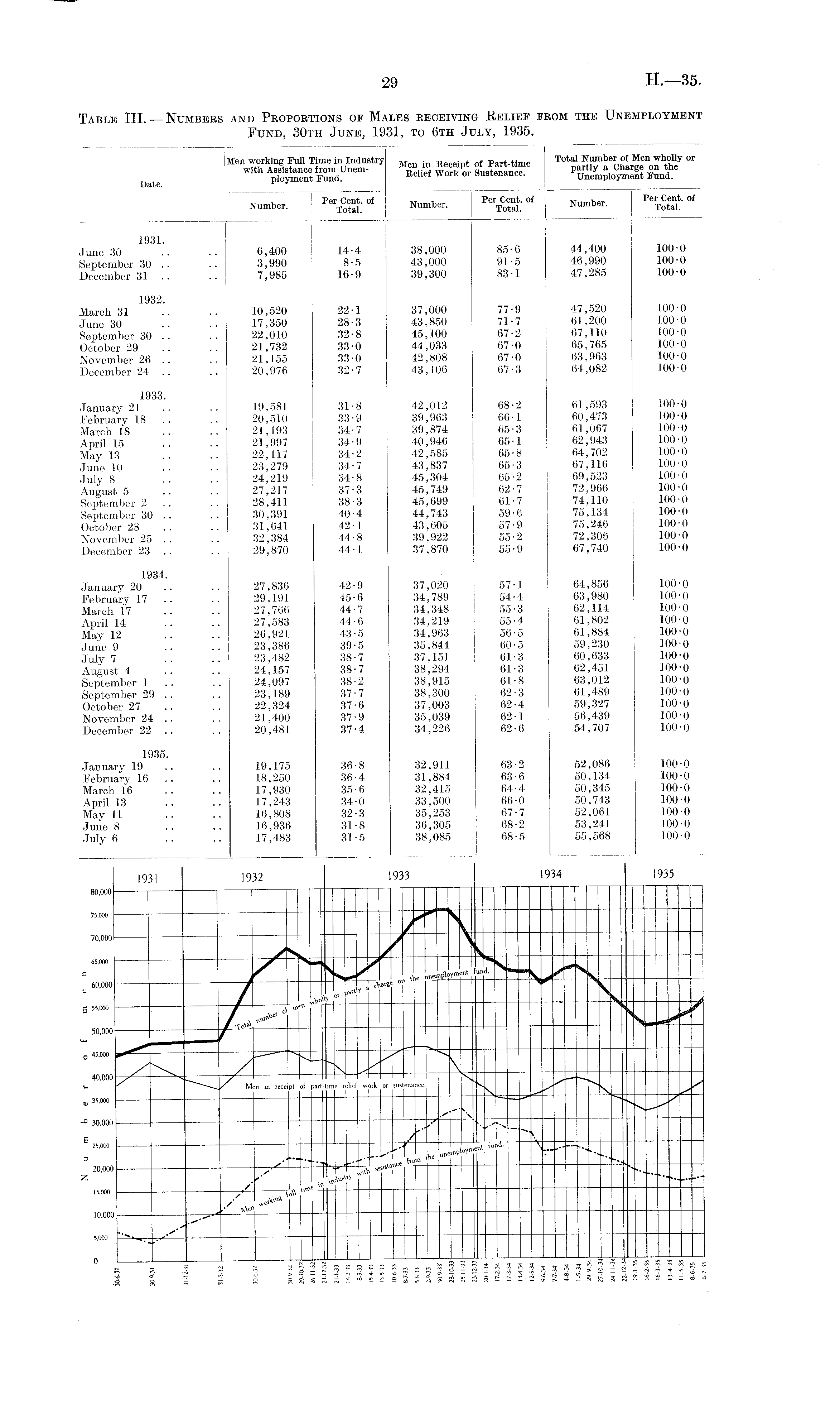 Table III.—Numbers and Proportions of Males receiving Relief from the Unemployment Fund, 30th June, 1931, to 6th July, 1935.