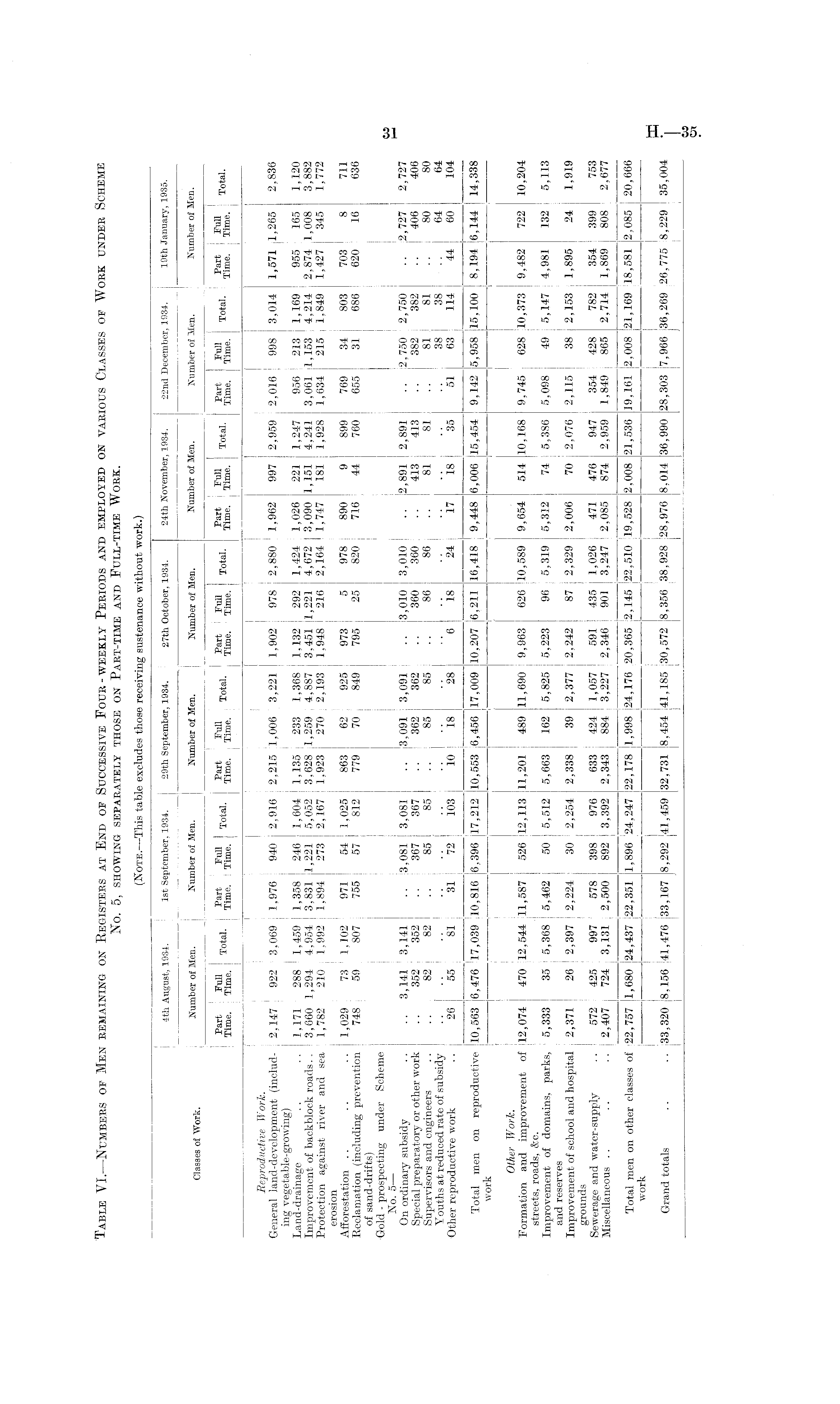 Table VI.—Numbers of Men remaining on Registers at End of Successive Four-weekly Periods and employed on various Classes of Work under Scheme No. 5, showing separately those on Part-time and Full-time Work.