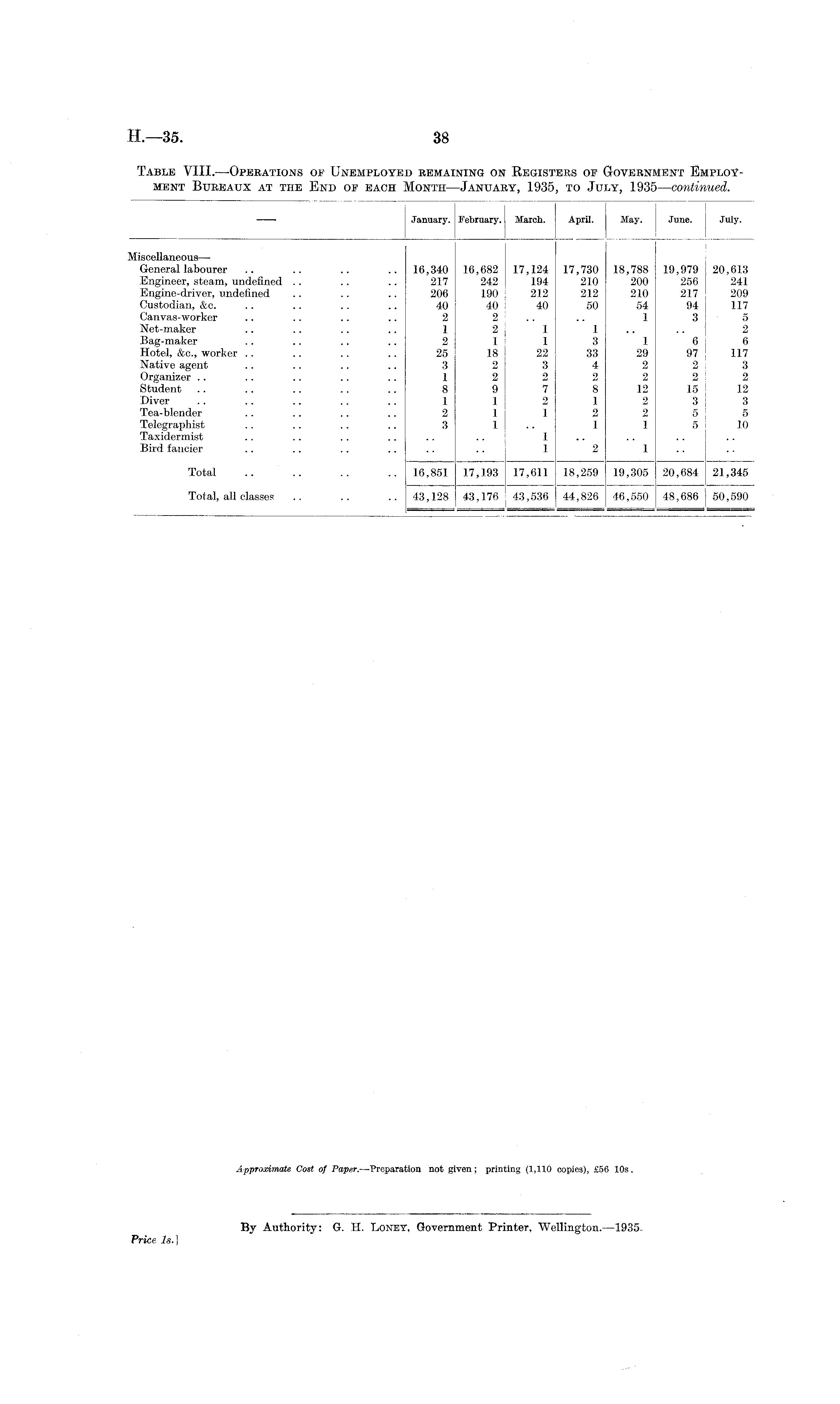 Table VIII.—Operations of Unemployed remaining on Registers of Government Employment Bureaux at the End of each Month —January, 1935, to July, 1935 —continued.