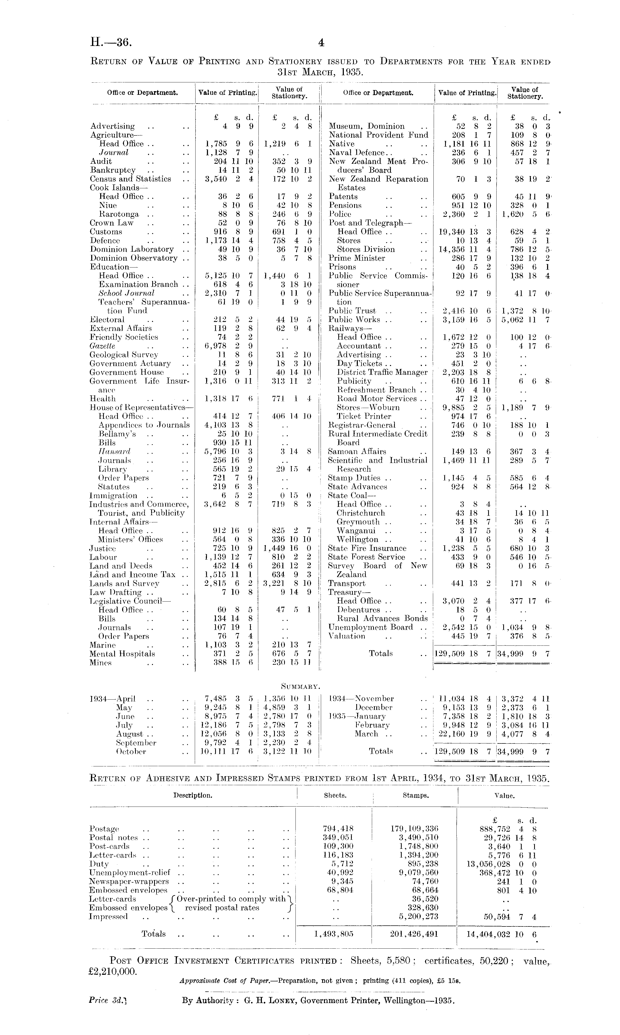 Return of Adhesive and Impressed Stamps printed from 1st April, 1934, to 31st March, 1935.
