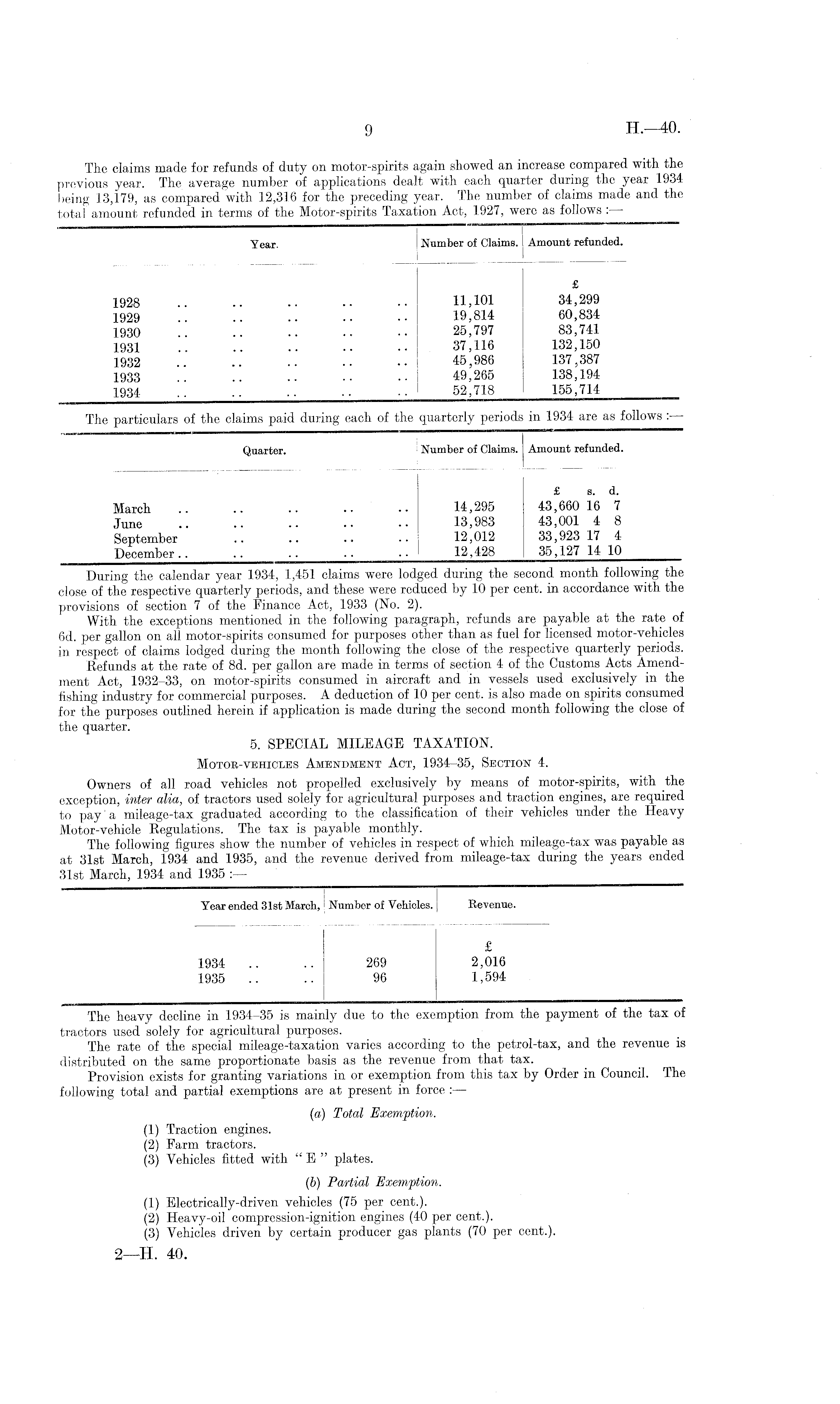 During the calendar year 1934, 1,451 claims were lodged during the second month following the close of the respective quarterly periods, and these were reduced by 10 per cent, in accordance with the provisions of section 7 of the Finance Act, 1933 (No. 2). With the exceptions mentioned in the following paragraph, refunds are payable at the rate of 6d. per gallon on all motor-spirits consumed for purposes other than as fuel for licensed motor-vehicles in respect of claims lodged during the month following the close of the respective quarterly periods. Refunds at the rate of Bd. per gallon are made in terms of section 4 of the Customs Acts Amendment Act, 1932-33, on motor-spirits consumed in aircraft and in vessels used exclusively in the fishing industry for commercial purposes. A deduction of 10 per cent, is also made on spirits consumed for the purposes outlined herein if application is made during the second month following the close of the quarter. 5. SPECIAL MILEAGE TAXATION. Motor-vehicles Amendment Act, 1934-35, Section 4. Owners of all road vehicles not propelled exclusively by means of motor-spirits, with the exception, inter alia, of tractors used solely for agricultural purposes and traction engines, are required to pay'a mileage-tax graduated according to the classification of their vehicles under the Heavy Motor-vehicle Regulations. The tax is payable monthly. The following figures show the number of vehicles in respect of which mileage-tax was payable as at 31st March, 1934 and 1935, and the revenue derived from mileage-tax during the years ended 31st March, 1934 and 1935 : —