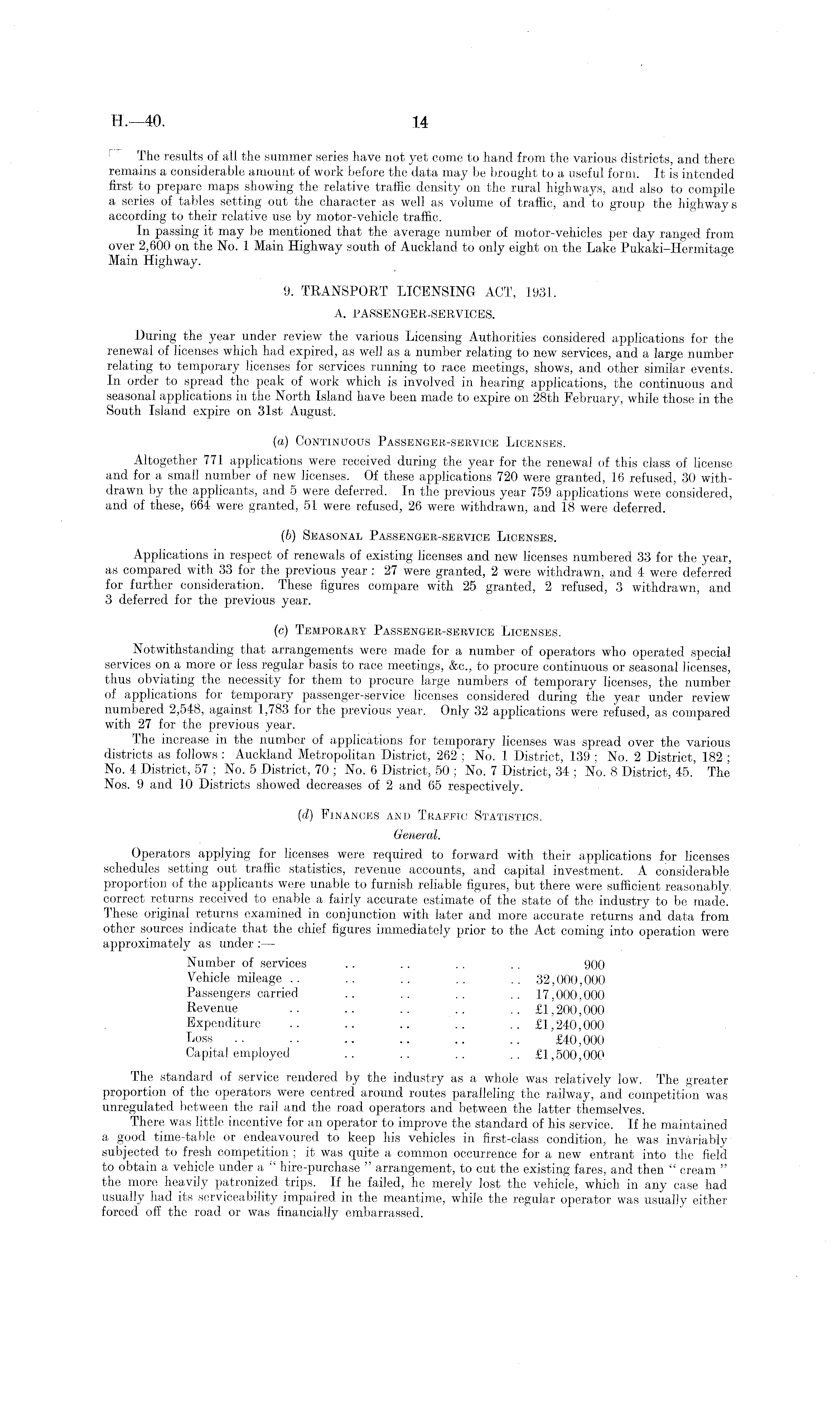 The results of all the summer series have not yet come to hand from the various districts, and there remains a considerable amount of work before the data may be brought to a useful form. It is intended first to prepare maps showing the relative traffic density on the rural highways, and also to compile a series of tables setting out the character as well as volume of traffic, and to group the highway s according to their relative use by mo tor-vehicle traffic. In passing it may be mentioned that the average number of motor-vehicles per day ranged from over 2,600 on the No. 1 Main Highway south of Auckland to only eight on the Lake Pukaki-Hermitage Main Highway. 9. TRANSPORT LICENSING ACT, 1931. A. PASSENGER-SERVICES. During the year under review the various Licensing Authorities considered applications for the renewal of licenses which had expired, as well as a number relating to new services, and a large number relating to temporary licenses for services running to race meetings, shows, and other similar events. In order to spread the peak of work which is involved in hearing applications, the continuous and seasonal applications in the North Island have been made to expire on 28th February, while those in the South Island expire on 31st August. (a) Continuous Passenger-service Licenses. Altogether 771 applications were received during the year for the renewal of this class of license and for a small number of new licenses. Of these applications 720 were granted, 16 refused, 30 withdrawn by the applicants, and 5 were deferred. In the previous year 759 applications were considered, and of these, 664 were granted, 51 were refused, 26 were withdrawn, and 18 were deferred. (b) Seasonal Passenger-service Licenses. Applications in respect of renewals of existing licenses and new licenses numbered 33 for the year, as compared with 33 for the previous year : 27 were granted, 2 were withdrawn, and 4 were deferred for further consideration. These figures compare with 25 granted, 2 refused, 3 withdrawn, and 3 deferred for the previous year. (c) Temporary Passenger-sebvice Licenses. Notwithstanding that arrangements were made for a number of operators who operated special services on a more or less regular basis to race meetings, &c., to procure continuous or seasonal licenses, thus obviating the necessity for them to procure large numbers of temporary licenses, the number of applications for temporary passenger-service licenses considered during the year under review numbered 2,548, against 1,783 for the previous year. Only 32 applications were refused, as compared with 27 for the previous year. The increase in the number of applications for temporary licenses was spread over the various districts as follows : Auckland Metropolitan District, 262 ; No. 1 District, 139 ; No. 2 District, 182 ; No. 4 District, 57 ; No. 5 District, 70 ; No. 6 District, 50 ; No. 7 District, 34 ; No. 8 District, 45. The Nos. 9 and 10 Districts showed decreases of 2 and 65 respectively. (d) Finances and Traffic Statistics. General. Operators applying for licenses were required to forward with their applications for licenses schedules setting out traffic statistics, revenue accounts, and capital investment. A considerable proportion of the applicants were unable to furnish reliable figures, but there were sufficient reasonably, correct returns received to enable a fairly accurate estimate of the state of the industry to be made. These original returns examined in conjunction with later and more accurate returns and data from other sources indicate that the chief figures immediately prior to the Act coming into operation were approximately as under :— Number of services .. . . . . . . 900 Vehicle mileage .. .. .. .. ..32,000,000 Passengers carried .. .. .. .. 17,000,000 Revenue .. .. .. .. .. £1,200,000 Expenditure .. .. .. .. .. £1,240,000 Loss .. .. .. .. .. .. £40,000 Capital employed .. .. .. .. £1,500,000 The standard of service rendered by the industry as a whole was relatively low. The greater proportion of the operators were centred around routes paralleling the railway, and competition was unregulated between the rail and the road operators and between the latter themselves. There was little incentive for an operator to improve the standard of his service. If he maintained a good time-table or endeavoured to keep his vehicles in first-class condition, he was invariably subjected to fresh competition ; it was quite a common occurrence for a new entrant into the field to obtain a vehicle under a " hire-purchase " arrangement, to cut the existing fares, and then " cream " the more heavily patronized trips. If he failed, he merely lost the vehicle, which in any case had usually had its serviceability impaired in the meantime, while the regular operator was usually either forced ofl the road or was financially embarrassed.
