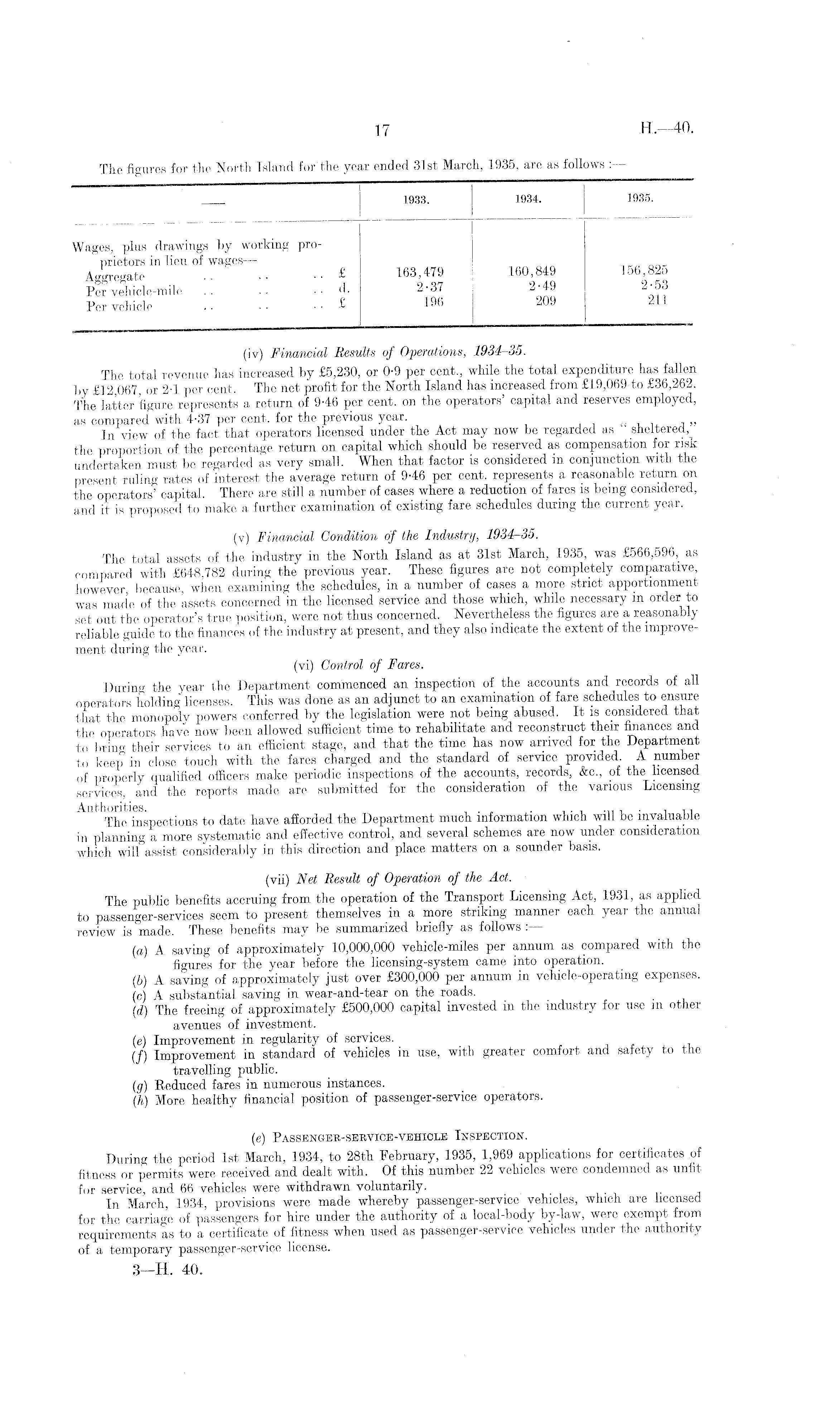 (iv) Financial Results of Operations, 1934-35. The total revenue has increased by £5,230, or 0-9 per cent., while the total expenditure has fallen by £] 2,067, or 2-1 per cent. The net profit for the North Island has increased from £19,069 to £36,262. The latter figure represents a return of 9'46 per cent, on the operators capital and reserves employed, as compared with 4-37 per cent, for the previous year. In view of the fact that operators licensed under the Act may now be regarded as sheltered the proportion of the percentage return on capital which should be reserved as compensation for risk undertaken must be regarded as very small. When that factor is considered in conjunction with the present ruling rates of interest the average return of 9-46 per cent, represents a reasonable return on the operators' capital. There are still a number of cases where a reduction of fares is being considered, and it is proposed to make a further examination of existing fare schedules during the current year. (v) Financial Condition of the Industry, 1934-3-5. The total assets of the industry in the North Island as at 31st March, .1935, was £566,596, as compared with £648,782 during the previous year. These figures are not completely comparative, however, because, when examining the schedules, in a number of cases a more strict apportionment was made of the assets concerned in the licensed service and those which, while necessary m order to set out the operator's true position, were not thus concerned. Nevertheless the figures are a reasonably reliable guide to the finances of the industry at present, and they also indicate the extent of the improvement during the year. (vi) Control of Fares. During the year the Department commenced an inspection of the accounts and records of all operators holding licenses. This was done as an adjunct to an examination of fare schedules to ensure that the monopoly powers conferred by the legislation were not being abused. It is considered that the operators have now been allowed sufficient time to rehabilitate and reconstruct their finances and to bring their services to an efficient stage, and that the time has now arrived for the Department to keep in close touch with the fares charged and the standard of service provided. A number of properly qualified officers make periodic inspections of the accounts, records, &c., of the licensed services, and the reports made are submitted for the consideration of the various Licensing The inspections to date have afforded the Department much information which will be invaluable in planning a more systematic and effective control, and several schemes are now under consideration which will assist considerably in this direction and place matters on a sounder basis. (vii) Net Result of Operation of the Act. The public benefits accruing from the operation of the Transport Licensing Act, 1931, as applied to passenger-services seem to present themselves in a more striking manner each year the annual review is made. These benefits may be summarized briefly as follows . (а) A saving of approximately 10,000,000 vehicle-miles per annum as compared with the figures for the year before the licensing-system came into operation. (б) A saving of approximately just over £300,000 per annum in vehicle-operating expenses. (c) A substantial saving in wear-and-tear on the roads. (d) The freeing of approximately £500,000 capital invested in the industry for use m other avenues of investment. (e) Improvement in regularity of services. (/) Improvement in standard of vehicles in use, with greater comfort and safety to the travelling public. (g) Reduced fares in numerous instances. (h) More healthy financial position of passenger-service operators. (e) Passenger-service-vbhicle Inspection. During the period Ist March, 1934, to 28th February, 1935, 1,969 applications for certificates of fitness or permits were received and dealt with. Of this number 22 vehicles were condemned as unfit for service, and 66 vehicles were withdrawn voluntarily. In March, 1934, provisions were made whereby passenger-service vehicles, which are licensed for the carriage of passengers for hire under the authority of a local-body by-law, were exempt from requirements as to a certificate of fitness when used as passenger-service vehicles under the authority of a temporary passenger-service license.