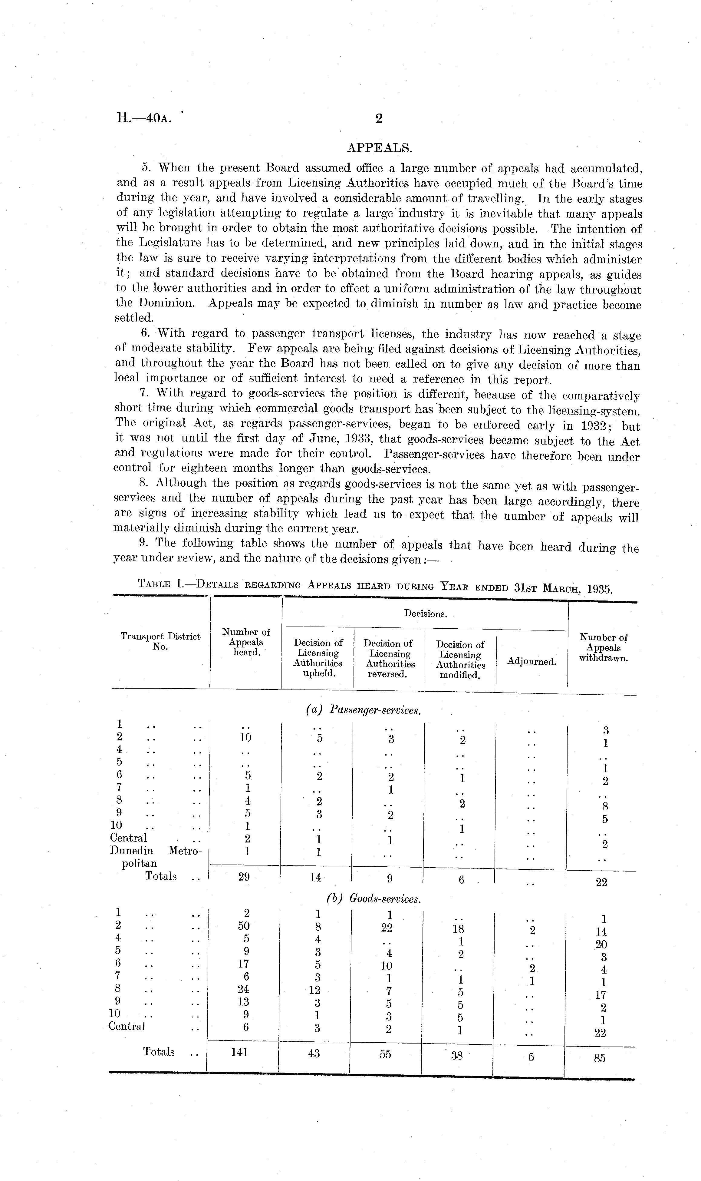 APPEALS. 5. When the present Board assumed office a large number of appeals had accumulated, and as a result appeals from Licensing Authorities have occupied much of the Board's time during the year, and have involved a considerable amount of travelling. In the early stages of any legislation attempting to regulate a large industry it is inevitable that many appeals will be brought in order to obtain the most authoritative decisions possible. The intention of the Legislature has to be determined, and new principles laid down, and in the initial stages the law is sure to receive varying interpretations from the different bodies which administer it; and standard decisions have to be obtained from the Board hearing appeals, as guides to the lower authorities and in order to effect a uniform administration of the law throughout the Dominion. Appeals may be expected to diminish in number as law and practice become settled. 6. With regard to passenger transport licenses, the industry has now reached a stage of moderate stability. Pew appeals are being filed against decisions of Licensing Authorities, and throughout the year the Board has not been called on to give any decision of more than local importance or of sufficient interest to need a reference in this report. 7. With regard to goods-services the position is different, because of the comparatively short time during which commercial goods transport has been subject to the licensing-system. The original Act, as regards passenger-services, began to be enforced early in 1932; but it was not until the first day of June, 1933, that goods-services became subject to the Act and regulations were made for their control. Passenger-services have therefore been under control for eighteen months longer than goods-services. 8. Although the position as regards goods-services is not the same yet as with passengerservices and the number of appeals during the past year has been large accordingly, there are signs of increasing stability which lead us to expect that the number of appeals will materially diminish during the current year. 9. The following table shows the number of appeals that have been heard during the year under review, and the nature of the decisions given:—