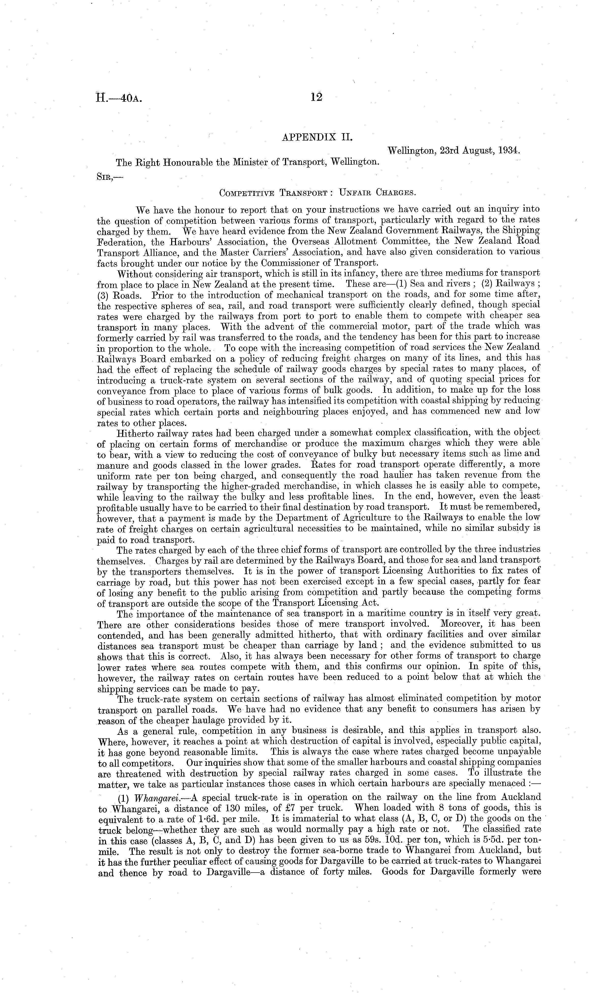 APPENDIX 11. Wellington, 23rd August, 1934. The Right Honourable the Minister of Transport, Wellington. Sir, — Competitive Transport : Unfair Charges. We have the honour to report that on your instructions we have carried out an inquiry into the question of competition between various forms of transport, particularly with regard to the rates charged by them. We have heard evidence from the New Zealand Government Railways, the Shipping Federation, the Harbours' Association, the Overseas Allotment Committee, the New Zealand Road Transport Alliance, and the Master Carriers' Association, and have also given consideration to various facts brought under our notice by the Commissioner of Transport. Without considering air transport, which is still in its infancy, there are three mediums for transport from place to place in New Zealand at the present time. These are —(1) Sea and rivers ; (2) Railways ; (3) Roads. Prior to the introduction of mechanical transport on the roads, and for some time after, the respective spheres of sea, rail, and road transport were sufficiently clearly defined, though special rates were charged by the railways from port to port to enable them to compete with cheaper sea transport in many places. With the advent of the commercial motor, part of the trade which was formerly carried by rail was transferred to the roads, and the tendency has been for this part to increase in proportion to the whole. To cope with the increasing competition of road services the New Zealand Railways Board embarked on a policy of reducing freight .charges on many of its lines, and this has had the effect of replacing the schedule of railway goods charges by special rates to many places, of introducing a truck-rate system on several sections of the railway, and of quoting special prices for conveyance from place to place of various forms of bulk goods. In addition, to make up for the loss of business to road operators, the railway has intensified its competition with coastal shipping by reducing special rates which certain ports and neighbouring places enjoyed, and has commenced new and low rates to other places. Hitherto railway rates had been charged under a somewhat complex classification, with the object of placing on certain forms of merchandise or produce the maximum charges which they were able to bear, with a view to reducing the cost of conveyance of bulky but necessary items such as lime and manure and goods classed in the lower grades. Rates for road transport operate difierently, a more uniform rate per ton being charged, and consequently the road haulier has taken revenue from the railway by transporting the higher-graded merchandise, in which classes he is easily able to compete, while leaving to the railway the bulky and less profitable lines. In the end, however, even the least profitable usually have to be carried to their final destination by road transport. It must be remembered, however, that a payment is made by the Department of Agriculture to the Railways to enable the low rate of freight charges on certain agricultural necessities to be maintained, while no similar subsidy is paid to road transport. The rates charged by each of the three chief forms of transport are controlled by the three industries themselves. Charges by rail are determined by the Railways Board, and those for sea and land transport by the transporters themselves. It is in the power of transport Licensing Authorities to fix rates of carriage by road, but this power has not been exercised except in a few special cases, partly for fear of losing any benefit to the public arising from competition and partly because the competing forms of transport are outside the scope of the Transport Licensing Act. The importance of the maintenance of sea transport in a maritime country is in itself very great. There are other considerations besides those of mere transport involved. Moreover, it has been contended, and has been generally admitted hitherto, that with ordinary facilities and over similar distances sea transport must be cheaper than carriage by land ; and the evidence submitted to us shows that this is correct. Also, it has always been necessary for other forms of transport to charge lower rates where sea routes compete with them, and this confirms our opinion. In spite of this, however, the railway rates on certain routes have been reduced to a point below that at which the shipping services can be made to pay. The truck-rate system on certain sections of railway has almost eliminated competition by motor transport on parallel roads. We have had no evidence that any benefit to consumers has arisen by reason of the cheaper haulage provided by it. As a general rule, competition in any business is desirable, and this applies in transport also. Where, however, it reaches a point at which destruction of capital is involved, especially public capital, it has gone beyond reasonable limits. This is always the case where rates charged become unpayable to all competitors. Our inquiries show that some of the smaller harbours and coastal shipping companies are threatened with destruction by special railway rates charged in some cases. To illustrate the matter, we take as particular instances those cases in which certain harbours are specially menaced : — (1) Whangarei. —A special truck-rate is in operation on the railway on the line from Auckland to Whangarei, a distance of 130 miles, of £7 per truck. When loaded with 8 tons of goods, this is equivalent to a rate of l-6d. per mile. It is immaterial to what class (A, B, C, or D) the goods on the truck belong —whether they are such as would normally pay a high rate or not. The classified rate in this case (classes A, B, C, and D) has been given to us as 595. lOd. per ton, which is 5-sd. per tonmile. The result is not only to destroy the former sea-borne trade to Whangarei from Auckland, but it has the further peculiar effect of causing goods for Dargaville