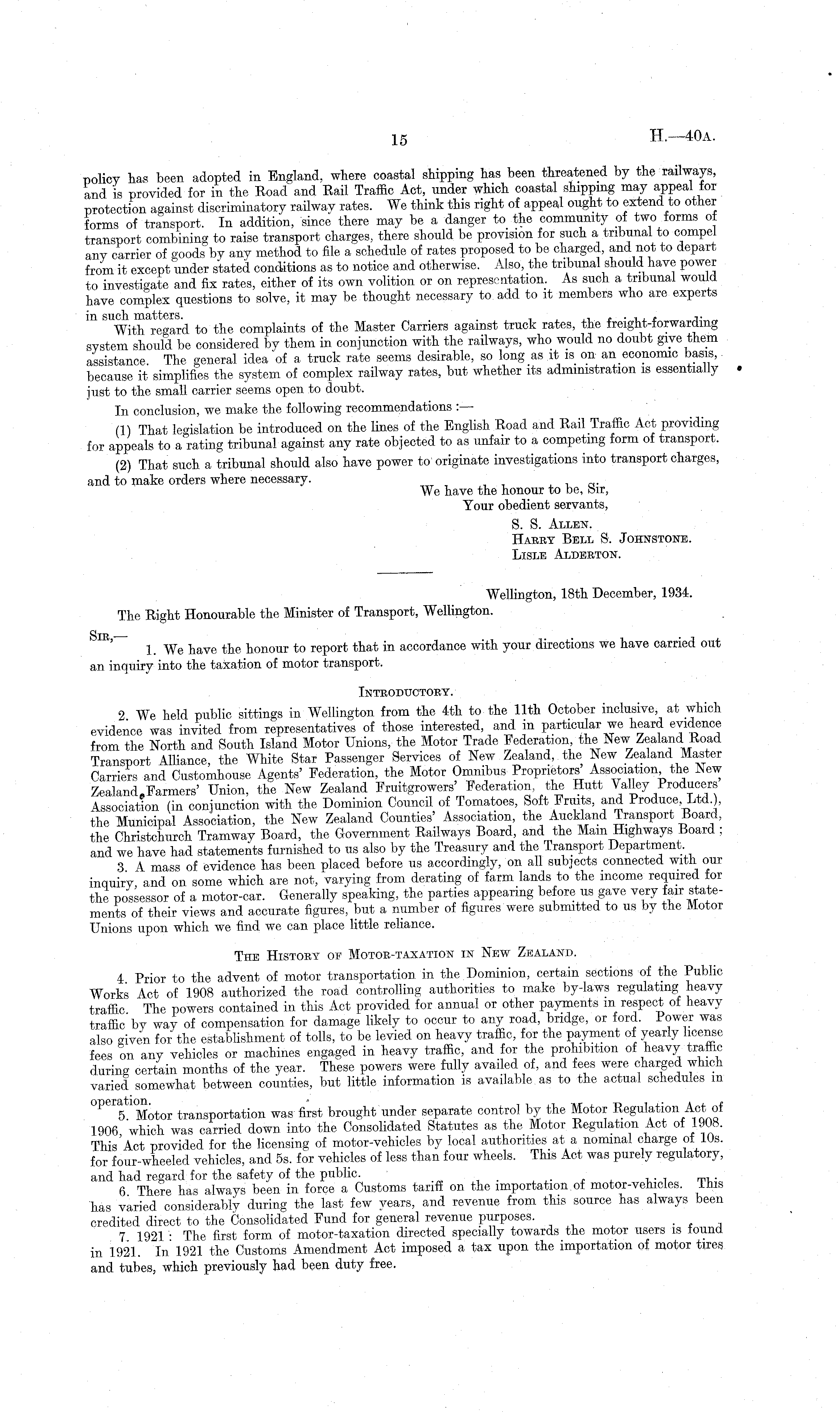 Wellington, 18th December, 1934. The Right Honourable the Minister of Transport, Wellington. 1. We have the honour to report that in accordance with your directions we have carried out an inquirv into the taxation of motor transport. Introductory. 2. We held public sittings in Wellington from the 4th to the 11th October inclusive, at which evidence was invited from representatives of those interested, and m particular we heard evidence from the North and South Island Motor Unions, the Motor Trade Federation the New Zealand Road Transport Alliance, the White Star Passenger Services of New Zealand, the New Zealand Master Carriers and Customhouse Agents' Federation, the Motor Omnibus Proprietors Association the New Zealand, Farmers' Union, the New Zealand Fruitgrowers' Federation the Hutt Valley Producers Association (in conjunction with the Dominion Council of Tomatoes, Soft Fruits, and Produce, .), the Municipal Association, the New Zealand Counties' Association, the Auckland Transport Board, the Christchurch Tramway Board, the Government Railways Board, and the Main Highways Board ; and we have had statements furnished to us also by the Treasury and the Transport Department 3. A mass of evidence has been placed before us accordingly, on all subjects connected with our inquiry, and on some which are not, varying from derating of farm lands to the income required for the possessor of a motor-car. Generally speaking, the parties appearing before us gave very fair statements of their views and accurate figures, but a number of figures were submitted to us by the Motor Unions upon which we find we can place little reliance. The History of Motor-taxation in New Zealand. 4 Prior to the advent of motor transportation in the Dominion, certain sections of the Public Works Act of 1908 authorized the road controlling authorities to make by-laws regulating heavy traffic The powers contained in this Act provided for annual or other payments m respect of heavy traffic by way of compensation for damage likely to occur to any road, bridge, or ford. Power was also given for the establishment of tolls, to be levied on heavy traffic, for the payment of yearly license fees on any vehicles or machines engaged in heavy traffic, and for the prohibition of heavy traffic during certain months of the year. These powers were fully availed of, and fees were charged which varied somewhat between counties, but little information is available as to the actual Schedules m ° P 5. Motor transportation was first brought under separate control by the Motor Regulation Act of 1906 which was carried down into the Consolidated Statutes as the Motor Regulation Act of 1908. This Act provided for the licensing of motor-vehicles by local at a nominal charge ot 10s. for four-wheeled vehicles, and ss. for vehicles of less than four wheels. This Act was purely regulatory, and had regard for the safety of the public. 6 There has always been in force a Customs tariff on the importation of motor-vehicles. This has varied considerably during the last few years, and revenue from this source has always been credited direct to the Consolidated Fund for general revenue purposes. 7. 1921 : The first form of motor-taxation directed specially towards the motor users is lound in 1921. In 1921 the Customs Amendment Act imposed a tax upon the importation of motor tires and tubes, which previously had been duty free.