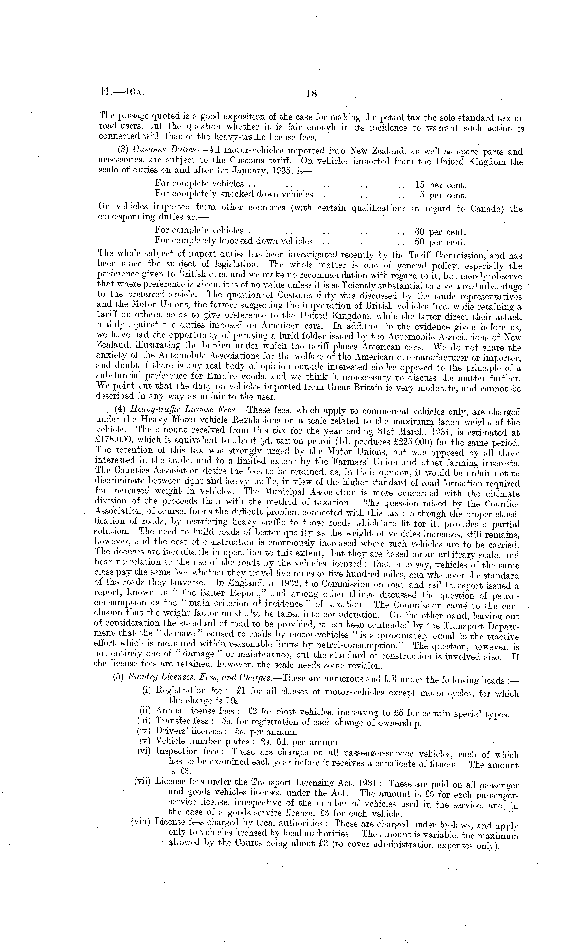 Tlie passage quoted is a good exposition of the case for making the petrol-tax the sole standard tax on road-users, but the question whether it is fair enough in its incidence to warrant such action is connected with that of the heavy-traffic license fees. (3) Customs Duties.—All motor-vehicles imported into New Zealand, as well as spare parts and accessories, are subject to the Customs tariff. On vehicles imported from the United Kingdom the scale of duties on and after Ist January, 1935, is— For complete vehicles .. .. .. .. .. 15 per cent. For completely knocked down vehicles .. .. 5 per cent. On vehicles imported from other countries (with certain qualifications in regard to Canada) the corresponding duties are — For complete vehicles .. .. .. .. .. 60 per cent. For completely knocked down vehicles . . .. . . 50 per cent. The whole subject, of import duties has been investigated recently by the Tariff Commission, and has been since the subject of legislation. The whole matter is one of general policy, especially the preference given to British cars, and we make no recommendation with regard to it, but merely observe that where preference is given, it is of no value unless it is sufficiently substantial to give a real advantage to the preferred article. The question of Customs duty was discussed by the trade representatives and the Motor Unions, the former suggesting the importation of British vehicles free, while retaining a tariff on others, so as to give preference to the United Kingdom, while the latter direct their attack mainly against the duties imposed on American cars. In addition to the evidence given before us, we have had the opportunity of perusing a lurid folder issued by the Automobile Associations of New Zealand, illustrating the burden under which the tariff places American cars. We do not share the anxiety of the Automobile Associations for the welfare of the American car-manufacturer or importer, and doubt if there is any real body of opinion outside interested circles opposed to the principle of a substantial preference for Empire goods, and we think it unnecessary to discuss the matter further. We point out that the duty on vehicles imported from Great Britain is very moderate, and cannot be described in any way as unfair to the user. ('U Heavy-traffic License Fees. These fees, which apply to commercial vehicles only, are charged under the Heavy Motor-vehicle Regulations on a scale related to the maximum laden weight of the vehicle. The amount received from this tax for the year ending 31st March, 1934, is estimated at £178,000, which is equivalent to about fd. tax on petrol (Id. produces £225,000) for the same period. The retention of this tax was strongly urged by the Motor Unions, but was opposed by all those interested in the trade, and to a limited extent by the Farmers' Union and other farming interests. The Counties Association desire the fees to be retained, as, in their opinion, it would be unfair not to discriminate between light and heavy traffic, in view of the higher standard of road formation required for increased weight in vehicles. The Municipal Association is more concerned with the ultimate division of the proceeds than with the method of taxation. The question raised by the Counties Association, of course, forms the difficult problem connected with this tax ; although the proper classification of roads, by restricting heavy traffic to those roads which are fit for it, provides a partial solution. The need to build roads of better quality as the weight of vehicles increases, still remains, however, and the cost of construction is enormously increased where such vehicles are to be carried. The licenses are inequitable in operation to this extent, that they are based on' an arbitrary scale, and bear no relation to the use of the roads by the vehicles licensed ; that is to say, vehicles of the same class pay the same fees whether they travel five miles or five hundred miles, and'whatever the standard of the roads they traverse. In England, in 1932, the Commission on road and rail transport issued a report, known as " The Salter Report," and among other things discussed the question of petrolconsumption as the main criterion of incidence "of taxation. The Commission came to the conclusion that the weight factor must also be taken into consideration. On the other hand, leaving out of consideration the standard of road to be provided, it has been contended by the Transport Department that the " damage " caused to roads by motor-vehicles " is approximately equal to the tractive effort which is measured within reasonable limits by petrol-consumption." The question, however, is not entirely one of " damage " or maintenance, but the standard of construction is involved also. ' If the license fees are retained, however, the scale needs some revision. (5) Sundry Licenses, Fees, and Charges.—These are numerous and fall under the following heads (i) Registration fee : £1 for all classes of motor-vehicles except motor-cycles, for which the charge is 10s. (ii) Annual license fees . £2 for most vehicles, increasing to £5 for certain special types. (iii) Transfer fees : ss. for registration of each change of ownership. (iv) Drivers' licenses : ss. per annum. (v) Vehicle number plates : 2s. 6d. per annum. (vi) Inspection fees : These are charges on all passenger-service vehicles, each of which has to be examined each year before it receives a certificate of fitness. The amount is £3. (vii) License fees under the Transport Licensing Act, 1931 : These are paid on all passenger and goods vehicles licensed under the Act. The amount is £5 for each passengerservice license, irrespective of the number of vehicles used in the service, and* in the case of a goods-service license, £3 for each vehicle. (viii) License fees charged by local authorities : These are charged under by-laws, and apply only to vehicles licensed by local authorities. The amount is var