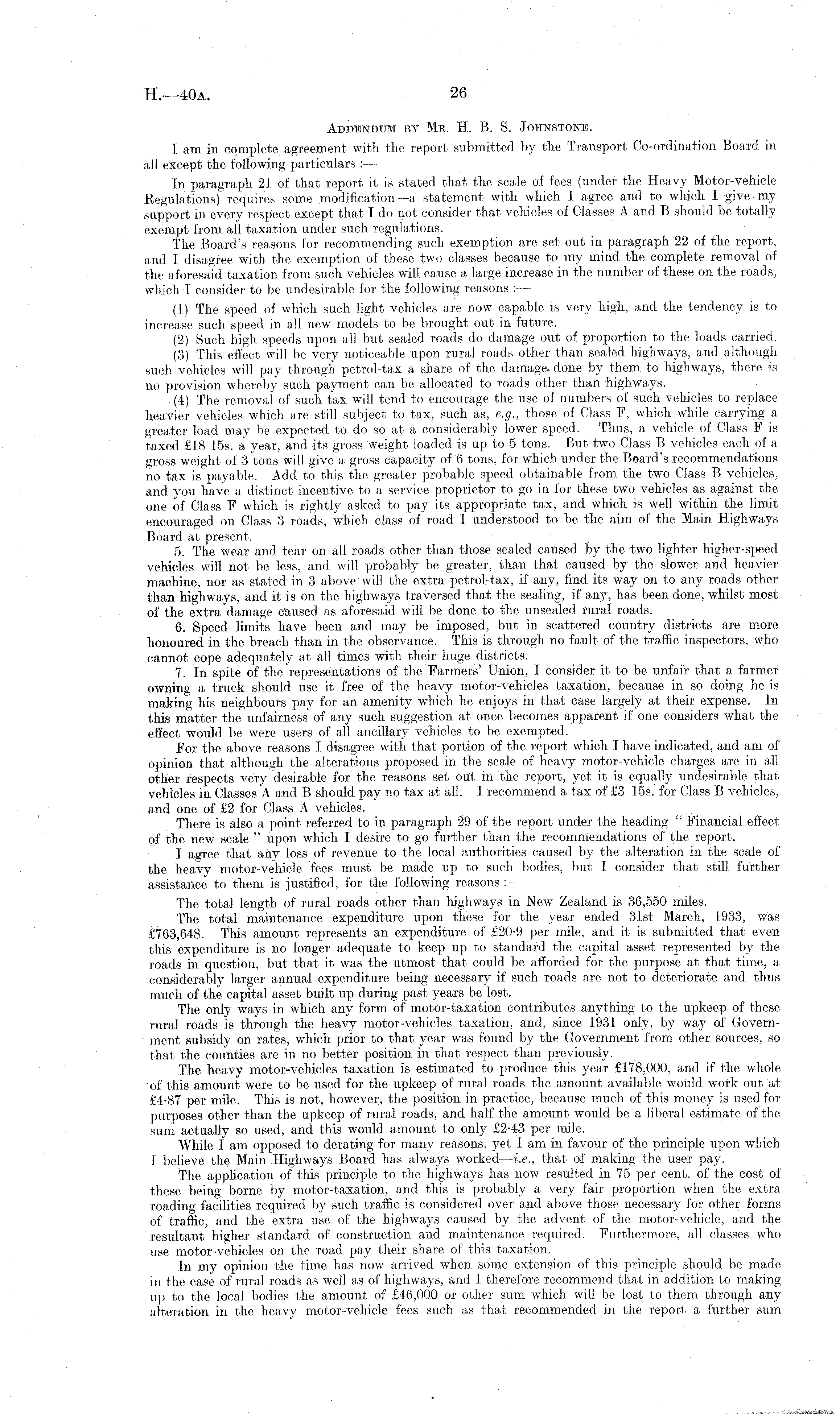 Addendum by Mr. H. B. S. Johnstone. Ī am in complete agreement with the report submitted by the Transport Co-ordination Board in all except the following particulars : — In paragraph 21 of that report it is stated that the scale of fees (under the Heavy Motor-vehicle Regulations) requires some modification —a statement with which I agree and to which 1 give my support in every respect except that I do not consider that vehicles of Classes A and B should be totally exempt from all taxation under such regulations. The Board's reasons for recommending such exemption are set out in paragraph 22 of the report, and I disagree with the exemption of these two classes because to my mind the complete removal of the aforesaid taxation from such vehicles will cause a large increase in the, number of these on the roads, which I consider to be undesirable for the following reasons : — (1) The speed of which such light vehicles are now capable is very high, and the tendency is to increase such speed in all new models to be brought out in future. (2) Such high speeds upon all but sealed roads do damage out of proportion to the loads carried. (3) This effect will be very noticeable upon rural roads other than sealed highways, and although such vehicles will pay through petrol-tax a share of the damage, done by them to highways, there is no provision whereby such payment can be allocated to roads other than highways. (4) The removal of such tax will tend to encourage the use of numbers of such vehicles to replace heavier vehicles which are still subject to tax, such as, e.g., those of Class F, which while carrying a greater load may be expected to do so at a considerably lower speed. Thus, a vehicle of Class Fis taxed £18 15s. a year, and its gross weight loaded is up to 5 tons. But two Class B vehicles each of a gross weight of 3 tons will give a gross capacity of 6 tons, for which under the Board's recommendations no tax is payable. Add to this the greater probable speed obtainable from the two Class B vehicles, and you have a distinct incentive to a service proprietor to go in for these two vehicles as against the one of Class F which is rightly asked to pay its appropriate tax, and which is well within the limit encouraged on Class 3 roads, which class of road I understood to be the aim of the Main Highways Board at present. 5. The wear and tear on all roads other than those sealed caused by the two lighter higher-speed vehicles will not be less, and will probably be greater, than that caused by the slower and heavier machine, nor as stated in 3 above will the extra petrol-tax, if any, find its way on to any roads other than highways, and it is on the highways traversed that the sealing, if any, has been done, whilst most of the extra damage Caused as aforesaid will be done to the unsealed rural roads. 6. Speed limits have been and may be imposed, but in scattered country districts are more honoured in the breach than in the observance. This is through no fault of the traffic inspectors, who cannot cope adequately at all times with their huge districts. 7. In spite of the representations of the Farmers' Union, I consider it to be unfair that a farmer owning a truck should use it free of the heavy motor-vehicles taxation, because in so doing he is making his neighbours pay for an amenity which he enjoys in that case largely at their expense. In this matter the unfairness of any such suggestion at once becomes apparent if one considers what the effect would be were users of all ancillary vehicles to be exempted. For the above reasons 1 disagree with that portion of the report which 1 have indicated, and am of opinion that although the alterations proposed in the scale of heavy motor-vehicle charges are in all other respects very desirable for the reasons set out in the report, yet it is equally undesirable that vehicles in Classes A and B should pay no tax at all. I recommend a tax of £3 15s. for Class B vehicles, and one of £2 for Class A vehicles. There is also a point referred to in paragraph 29 of the report under the heading " Financial effect of the new scale " upon which I desire to go further than the recommendations of the report. I agree that any loss of revenue to the local authorities caused by the alteration in the scale of the heavy motor-vehicle fees must be made up to such bodies, but I consider that still further assistance to them is justified, for the following reasons : — The total length of rural roads other than highways in New Zealand is 36,550 miles. The total maintenance expenditure upon these for the year ended 31st March, 1.933, was £763,648. This amount represents an expenditure of £20-9 per mile, and it is submitted that even this expenditure is no longer adequate to keep up to standard the capital asset represented by the roads in question, but that it was the utmost that could be afforded for the purpose at that time, a considerably larger annual expenditure being necessary if such roads are not to deteriorate and. thus much of the capital asset built up during past years be lost. The only ways in which any form of motor-taxation contributes anything to the upkeep of these rural roads is through the heavy motor-vehicles taxation, and, since 1931 only, by way of Government subsidy on rates, which prior to that year was found by the Government from other sources, so that the counties are in no better position in that respect than previously. The heavy motor-vehicles taxation is estimated to produce this year £178,000, and if the whole of this amount were to be used for the upkeep of rural roads the amount available would, work out at £4-87 per mile. This is not, however, the position in practice, because much of this money is used for purposes other than the upkeep of rural roads, and half the amount would be a liberal estimate of the sum actually so used, and this would amount to only £2-43 per mile. While 1 am opposed to derating for many reasons, yet I am