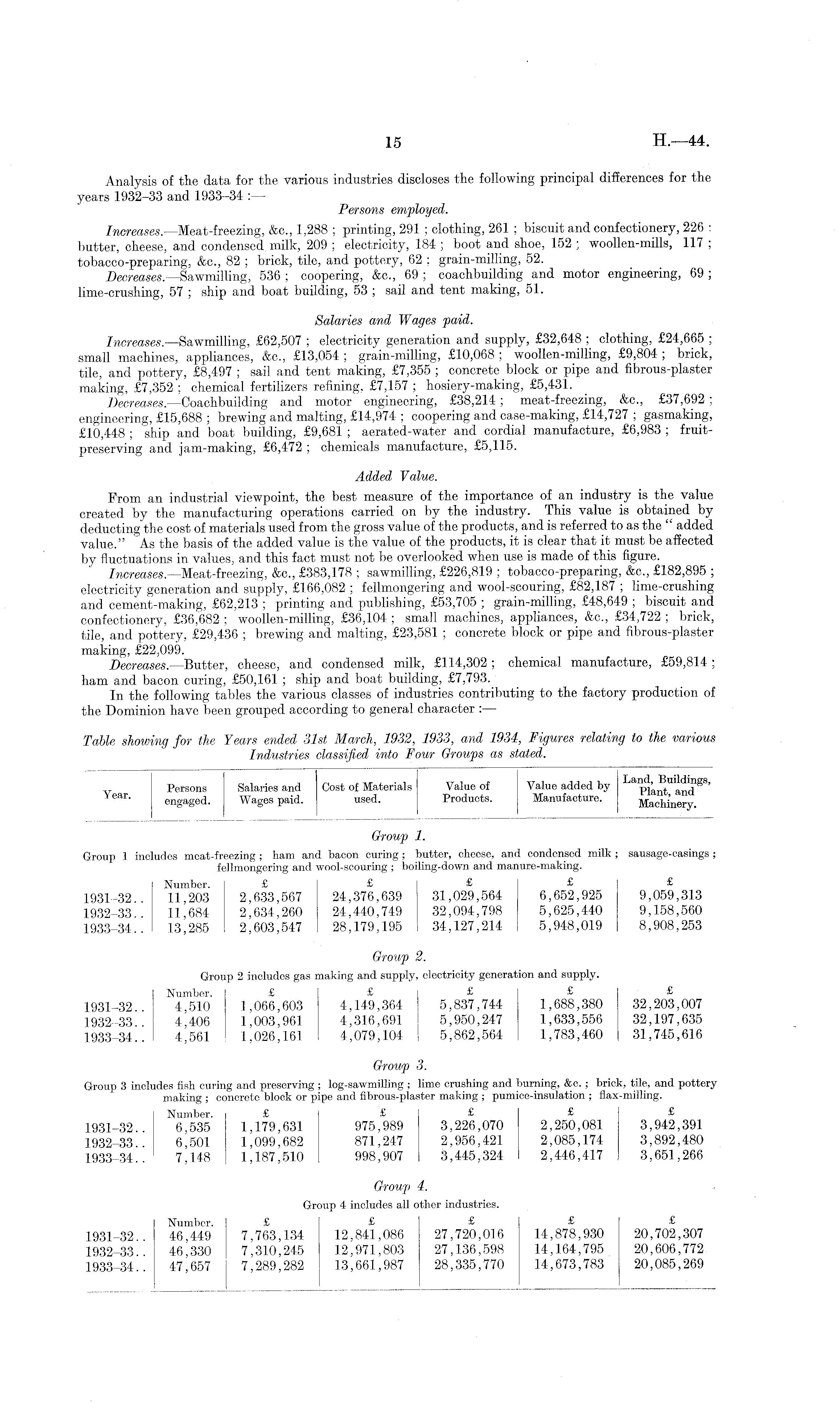„ Persons Salaries and Cost of Materials Value of Value added by engaged. Wages paid. used. Products. Manufacture. Machinery. Group 1. Group 1 includes meat-freezing ; ham and bacon curing ; butter, cheese, and condensed milk ; sausage-casings ; fellmongering and wool-scouring ; boiling-down and manure-making. Number. £ £ £ £ £ 1931-32.. 11,203 2,633,567 24,376,639 31,029,564 6,652,925 9,059,313 1932-33.. 11,684 2,634,260 24,440,749 32,094,798 5,625,440 9,158,560 1933-34.. 13,285 2,603,547 28,179,195 34,127,214 5,948,019 8,908,253 Group 2. Group 2 includes gas making and supply, electricity generation and supply. Number. £ £ £ £ £ 1931-32.. 4,510 1,066,603 4,149,364 5,837,744 1,688,380 32,203,007 1932-33.. 4,406 1,003,961 4,316,691 5,950,247 1,633,556 32,197,635 1933-34.. 4,561 1,026,161 4,079,104 5,862,564 1,783,460 31,745,616 Growp 3. Group 3 includes fish curing and preserving ; log-sawmilling ; lime crushing and burning, &c. ; brick, tile, and pottery making ; concrete block or pipe and fibrous-plaster making ; pumice-insulation ; flax-milling. Number. £ £ £ £ £ 1931-32.. 6,535 1,179,631 975,989 3,226,070 2,250,081 3,942,391 1932-33.. 6,501 1,099,682 871,247 2,956,421 2,085,174 3,892,480 1933-34.. 7,148 1,187,510 998,907 3,445,324 2,446,417 3,651,266 Group 4. Group 4 includes all other industries. Number. £ £ £ £ £ 1931-32.. 46,449 7,763,134 12,841,086 27,720,016 14,878,930 20,702,307 1932-33.. 46,330 7,310,245 12,971,803 27,136,598 14,164,795 20,606,772 1933-34.. 47,657 7,289,282 13,661,987 28,335,770 14,673,783 20,085,269