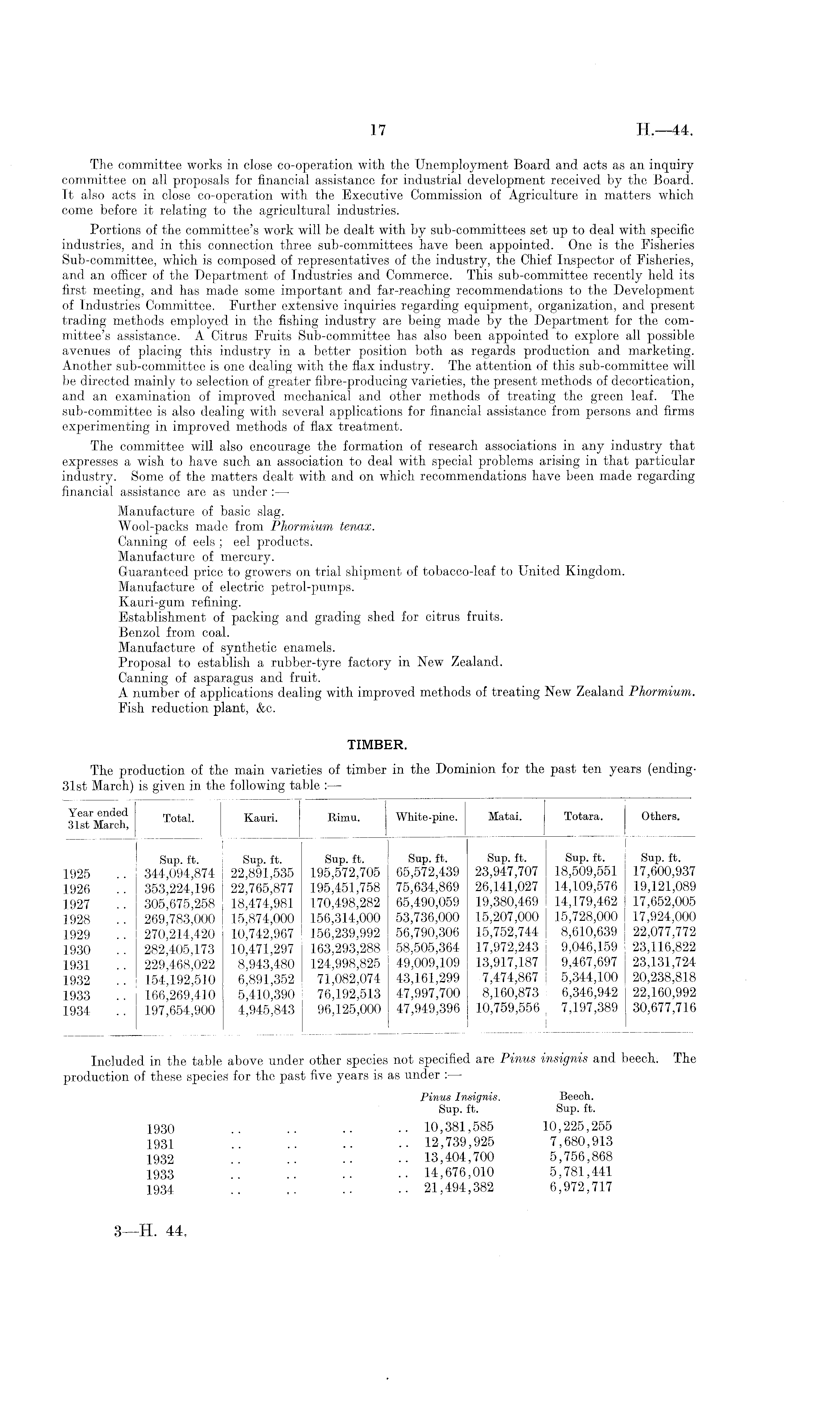 The committee works in close co-operation with the Unemployment Board and acts as an inquiry committee on all proposals for financial assistance for industrial development received by the Board. It also acts in close co-operation with the Executive Commission of Agriculture in matters which come before it relating to the agricultural industries. Portions of the committee's work will be dealt with by sub-committees set up to deal with specific industries, and in this connection three sub-committees have been appointed. One is the Fisheries Sub-committee, which is composed of representatives of the industry, the Chief Inspector of Fisheries, and an officer of the Department of Industries and Commerce. This sub-committee recently held its first meeting, and has made some important and far-reaching recommendations to the Development of Industries Committee. Further extensive inquiries regarding equipment, organization, and present trading methods employed in the fishing industry are being made by the Department for the committee's assistance. A Citrus Fruits Sub-committee has also been appointed to explore all possible avenues of placing this industry in a better position both as regards production and marketing. Another sub-committee is one dealing with the flax industry. The attention of this sub-committee will be directed mainly to selection of greater fibre-producing varieties, the present methods of decortication, and an examination of improved mechanical and other methods of treating the green leaf. The sub-committee is also dealing with several applications for financial assistance from persons and firms experimenting in improved methods of flax treatment. The committee will also encourage the formation of research associations in any industry that expresses a wish to have such an association to deal with special problems arising in that particular industry. Some of the matters dealt with and on which recommendations have been made regarding financial assistance are as under :— Manufacture of basic slag. Wool-packs made from Phormium tenax. Canning of eels ; eel products. Manufacture of mercury. Guaranteed price to growers on trial shipment of tobacco-leaf to United Kingdom. Manufacture of electric petrol-pumps. Ivauri-gum refining. Establishment of packing and grading shed for citrus fruits. Benzol from coal. Manufacture of synthetic enamels. Proposal to establish a rubber-tyre factory in New Zealand. Canning of asparagus and fruit. A number of applications dealing with improved methods of treating New Zealand Phormium. Fish reduction plant, &c. TIMBER. The production of the main varieties of timber in the Dominion for the past ten years (ending31st March) is given in the following table : —