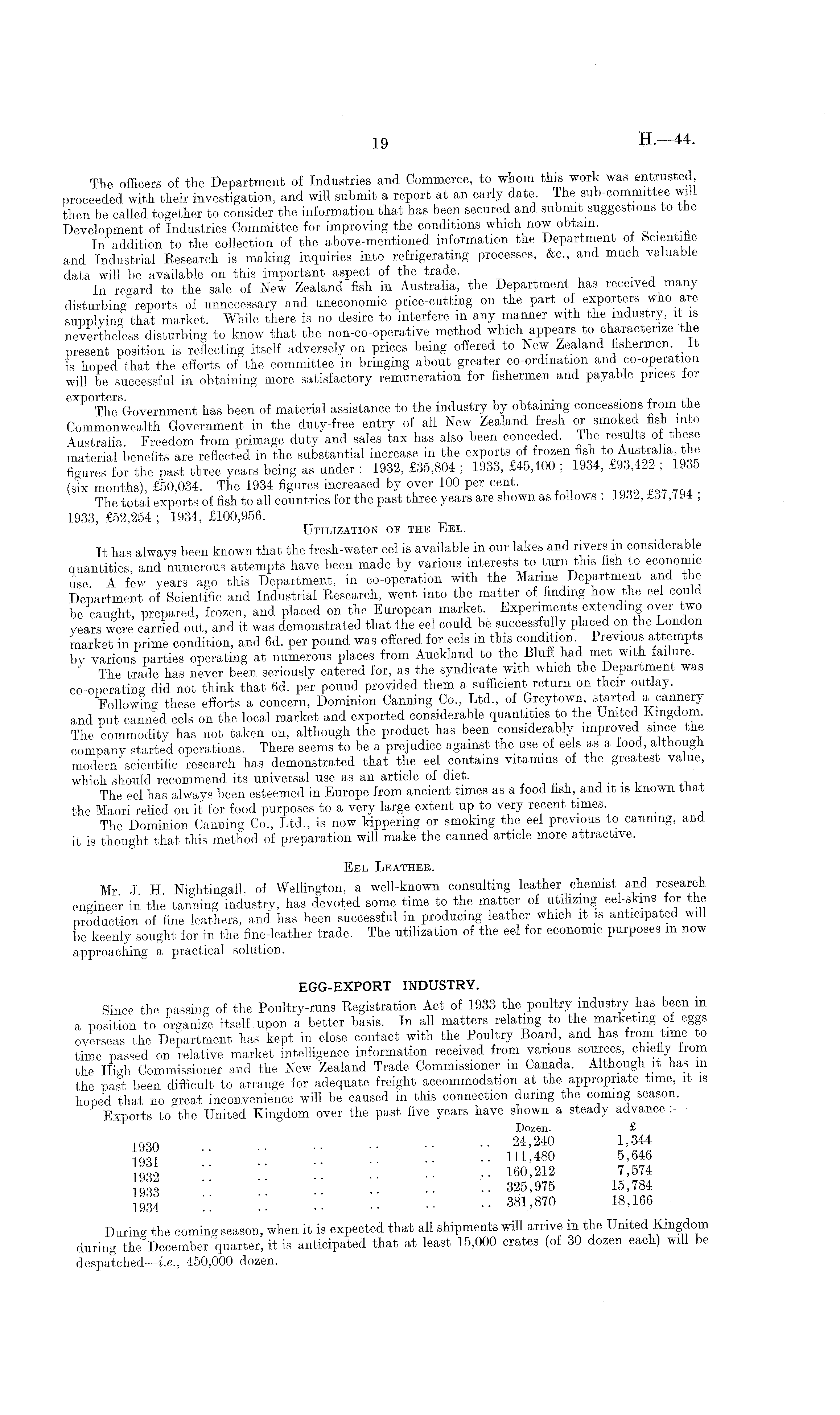 The officers of the Department of Industries and Commerce, to whom this work was entrusted, proceeded with their investigation, and will submit a report at an early date The sub-committee will then be called together to consider the information that has been secured and submit suggestions to the Development of Industries Committee for improving the conditions which now obtain. In addition to the collection of the above-mentioned information the Department of Scientific and Industrial Research is making inquiries into refrigerating processes, &c., and much valuable data will be available on this important aspect of the trade. In regard to the sale of New Zealand fish in Australia, the Department has received many disturbing reports of unnecessary and uneconomic price-cutting on the part of exporters who are supplying that market. While there is no desire to interfere in any manner with the industry, it is nevertheless disturbing to know that the non-co-operative method which appears to characterize the present position is reflecting itself adversely on prices being offered to New Zealand fishermen It is hoped that the efforts of the committee in bringing about greater co-ordination and^ co-operation will be successful in obtaining more satisfactory remuneration for fishermen and payable prices for P The Government has been of material assistance to the industry by obtaining concessions from the Commonwealth Government in the duty-free entry of all New Zealand fresh or smoked fish into Australia. Freedom from primage duty and sales tax has also been conceded. The results of these material benefits are reflected in the substantial increase m the exports.o: frozen Australia the figures for the past three years being as under : 1932, £35,804 ; 1933, £45,400 , 1934, £93,422 , (six months), £50,034. The 1934 figures increased by over 100 per cent. _ The total exports of fish to all countries for the past three years are shown as follows . 1932, £37,794 , 1933, £52,254 ; 1934, £100,956. Utilization of the Eel. It has always been known that the fresh-water eel is available in our lakes and rivers in considerable quantities, and numerous attempts have been made by various interests to turn this fish to economic use. A few years ago this Department, in co-operation with the Marine Department and the Department of Scientific and Industrial Research, went into the matter of finding how the eel cou d be caught, prepared, frozen, and placed on the European market. Experiments extending over two years were carried out, and it was demonstrated that the eel could be successfully placed on the London market in prime condition, and 6d. per pound was offered for eels in this condition Previous attempts by various parties operating at numerous places from Auckland to the Bluff had met with failuie. The trade has never been seriously catered for, as the syndicate with which the Department was co-operating did not think that 6d. per pound provided them a sufficient return on their outlay. Following these efforts a concern, Dominion Canning Co., Ltd., of Greytown, started a cannery and put canned eels on the local market and exported considerable quantities to the United Kingdom. The commodity has not taken on, although the product has been considerably improved since the company started operations. There seems to be a prejudice against the use of eels as a food, although modern scientific research has demonstrated that the eel contains vitamins of the greatest value, which should recommend its universal use as an article of diet. The eel has always been esteemed in Europe from ancient times as a food fish, and it is known that the Maori relied on it for food purposes to a very large extent up to very recent times. The Dominion Canning Co., Ltd., is now kippering or smoking the eel previous to canning, and it is thought that this method of preparation will make the canned article more attractive. Eel Leather. Mr. J. H. Nightino-all, of Wellington, a well-known consulting leather chemist and research engineer in the tanning industry, has devoted some time to the matter of utilizing eel-skins for the production of fine leathers, and has been successful in producing leather which it is anticipated will be keenly sought for in the fine-leather trade. The utilization of the eel for economic purposes m now approaching a practical solution. EGG-EXPORT INDUSTRY. Since the passing of the Poultry-runs Registration Act of 1933 the poultry industry has been in a position to organize itself upon a better basis. In all matters relating to the marketing o. eggs overseas the Department has kept in close contact with the Poultry Board, and has from time to time passed on relative market intelligence information received from various sources, chiefly from the Hi oh Commissioner and the New Zealand Trade Commissioner m Canada. Although it has m the past been difficult to arrange for adequate freight accommodation at the appropriate time, it is hoped that no great inconvenience will be caused in this connection during the coming season. Exports to the United Kingdom over the past five years have shown a steady advance Dozen. £ IOQA 24 ' 240 iqqV " .. 111.480 5,646 qo 9 " " " .. .. 160,212 7,574 Iqoo .. ..325,975 15,784 J934 ;; " 381,870 18,166 During the coming season, when it is expected that all shipments will arrive in the United Kingdom during the December quarter, it is anticipated that at least 15,000 crates (of 30 dozen each) will be despatched —i.e., 450,000 dozen.
