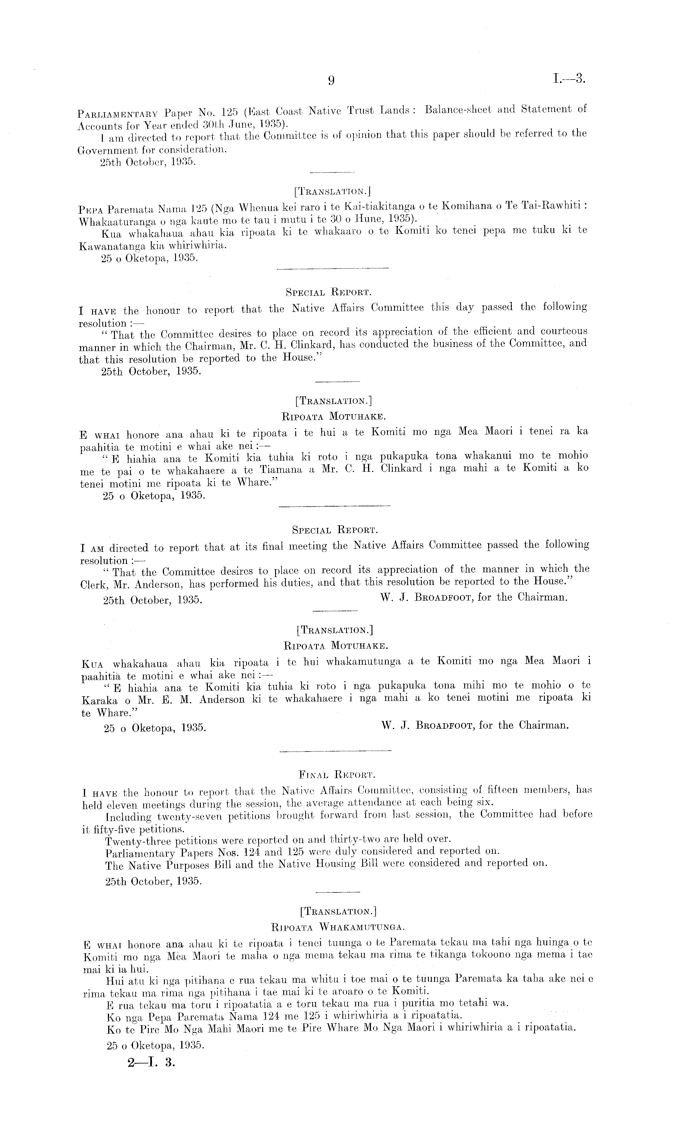 [Translation.] Ripoata Motuhake. Kua whakahaua ahau kia ripoata i te hui whakamutunga a te Komiti mo nga Mea Maori i paahitiā te motini e whai ake nei : — " E hiahia ana te Komiti kia tuliia ki roto i nga pukapuka tona mihi mo te mohio o te Karaka o Mr. E. M. Anderson kite whakahaere i nga mahi a ko tenei motini me ripoata ki te Whare." 25 o Oketopa, 1935. W. J. Broadeoot, for the Chairman.