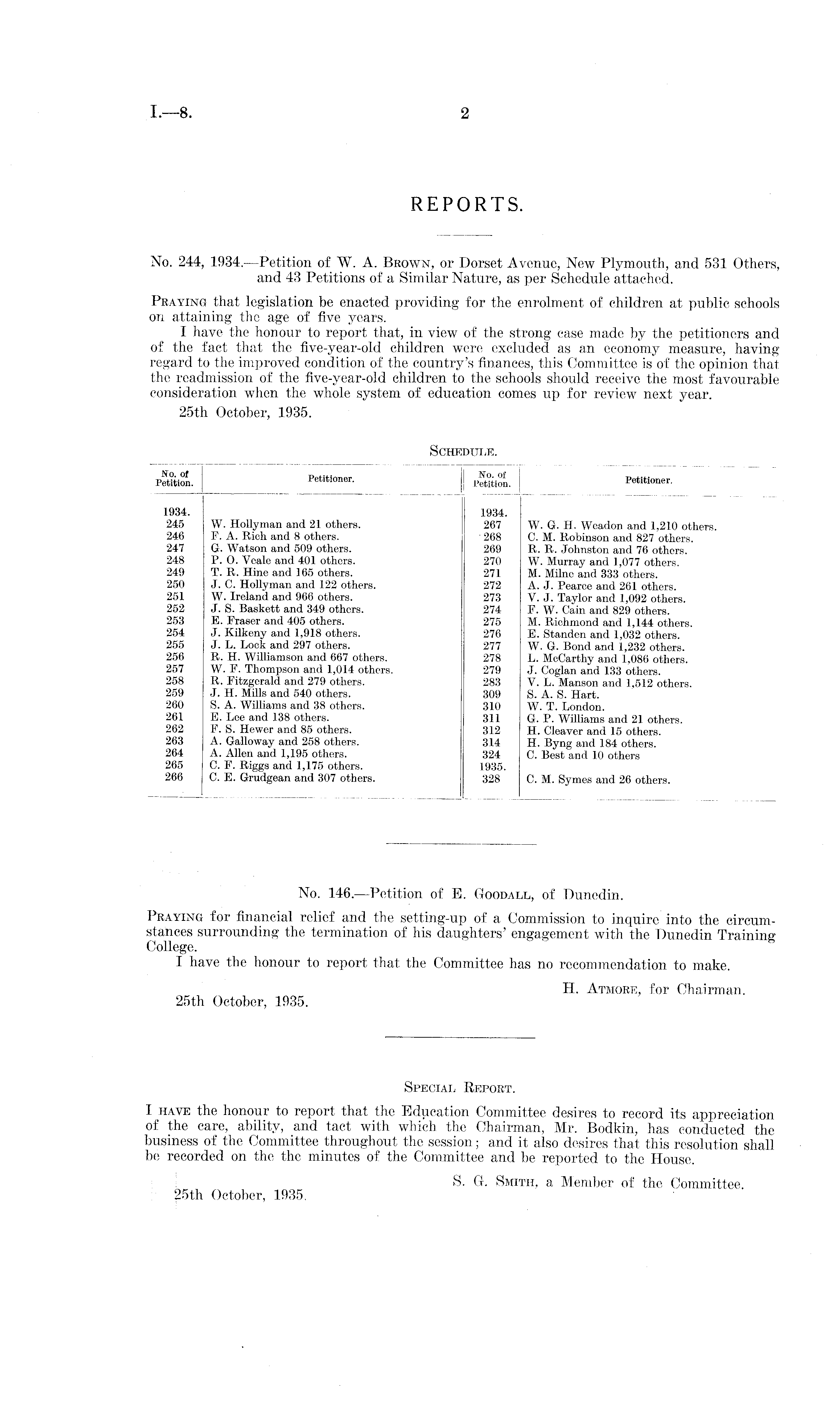 Special Report. I have the honour to report that the Education Committee desires to record its appreciation of the care, ability, and tact with which the Chairman, Mr. Bodkin, has conducted the business of the Committee throughout the session; and it also desires that this resolution shall be recorded on the the minutes of the Committee and be reported to the House. S. G. Smith, a Member of the Committee. 25th October, 1935.