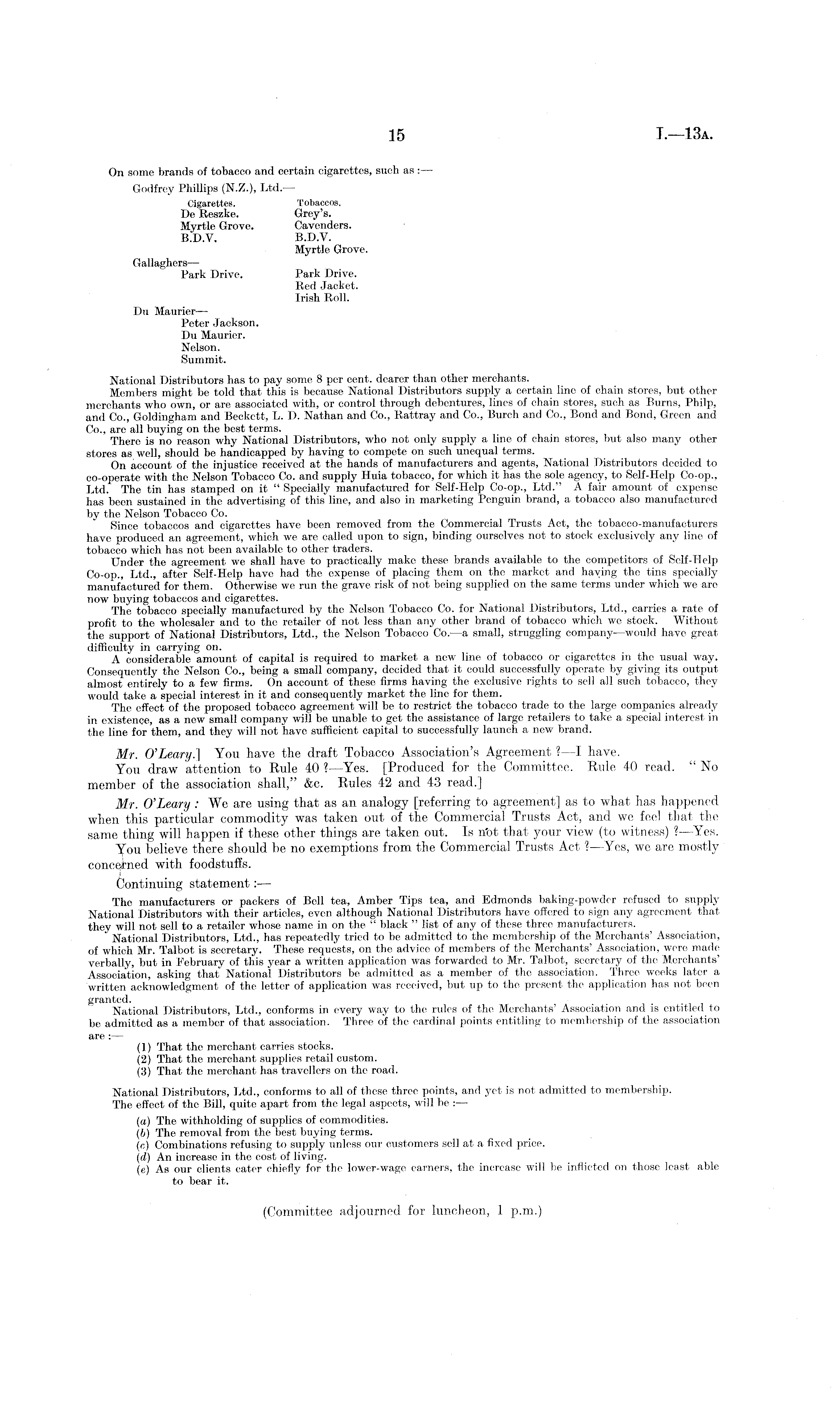 On some brands of tobacco and certain cigarettes, such as : — Godfrey Phillips (N.Z.), Ltd. — Cigarettes. Tobaccos. De Reszke. Grey's. Myrtle Grove. Cavenders. B.D.V. B.D.V. Myrtle Grove. Gallaghers — Park Drive. Park Drive. Red Jacket. Irish Roll. Du Maurier — Peter Jackson. Du Maurier. Nelson. Summit. National Distributors has to pay some 8 per cent, dearer than other merchants. Members might be told that this is because National Distributors supply a certain line of chain stores, but other merchants who own, or are associated with, or control through debentures, lines of chain stores, such as Burns, Philp, and Co., Goldingham and Beckett, L. D. Nathan and Co., Rattray and Co., Burch and Co., Bond and Bond, Green and Co., are all buying on the best terms. There is no reason why National Distributors, who not only supply a line of chain stores, but also many other stores as well, should be handicapped by having to compete on such unequal terms. On account of the injustice received at the hands of manufacturers and agents, National Distributors decided to co-operate with the Nelson Tobacco Co. and supply Huia tobacco, for which it has the sole agency, to Self-Help Co-op., Ltd. The tin has stamped on it " Specially manufactured for Self-Help Co-op., Ltd.'S A fair amount of expense has been sustained in the advertising of this line, and also in marketing Penguin brand, a tobacco also manufactured by the Nelson Tobacco Co. Since tobaccos and cigarettes have been removed from the Commercial Trusts Act, the tobacco-manufacturers have produced an agreement, which we are called upon to sign, binding ourselves not to stock exclusively any line of tobacco which has not been available to other traders. Under the agreement we shall have to practically make these brands available to the competitors of Self-Help Co-op., Ltd., after Self-Help have had the expense of placing them on the market and having the tins specially manufactured for them. Otherwise we run the grave risk of not being supplied on the same terms under which we are now buying tobaccos and cigarettes. The tobacco specially manufactured by the Nelson Tobacco Co. for National Distributors, Ltd., carries a rate of profit to the wholesaler and to the retailer of not less than any other brand of tobacco which we stock. Without the support of National Distributors, Ltd., the Nelson Tobacco Co. —a small, struggling company —would have great difficulty in carrying on. A considerable amount of capital is required to market a new line of tobacco or cigarettes in the usual way. Consequently the Nelson Co., being a small company, decided that it could successfully operate by giving its output almost entirely to a few firms. On account of these firms having the exclusive rights to sell all such tobacco, they would take a special interest in it and consequently market the line for them. The effect of the proposed tobacco agreement will be to restrict the tobacco trade to the large companies already in existence, as a new small company will be unable to get the assistance of large retailers to take a special interest in the line for them, and they will not have sufficient capital to successfully launch a new brand. Mr. O'Leary.'] You have the draft Tobacco Association's Agreement ?—I have. You draw attention to Rule 40 ? —Yes. [Produced for the Committee. Rule 40 read. "No member of the association shall," &c. Rules 42 and 43 read.] Mr. O'Leary : We are using that as an analogy [referring to agreement] as to what has happened when this particular commodity was taken out of the Commercial Trusts Act, and we feel that the same thing will happen if these other things are taken out. Is n'ot that your view (to witness) ?—Yes. You believe there should be no exemptions from the Commercial Trusts Act ? —Yes, we are mostly concerned with foodstuffs. 1 Continuing statement :• — The manufacturers or packers of Bell tea, Amber Tips tea, and Edmonds baking-powder refused to supplyNational Distributors with their articles, even although National Distributors have offered to sign any agreement that they will not sell to a retailer whose name in on the " black " list of any of these three manufacturers. National Distributors, Ltd., has repeatedly tried to be admitted to .the membership of the Merchants' Association, of which Mr. Talbot is secretary. These requests, on the advice of members of the Merchants' Association, were made verbally, but in February of this year a written application was forwarded to Mr. Talbot, secretary of the Merchants' Association, asking that National Distributors be admitted as a member of the association. Three weeks later a written acknowledgment of the letter of application was received, but up to the present the application has not been granted. . National Distributors, Ltd., conforms in every way to the rules of the Merchants' Association and is entitled to be admitted as a member of that association. Three of the cardinal points entitling to membership of the association are : — (1) That the merchant carries stocks. (2) That the merchant supplies retail custom. (3) That the merchant has travellers on the road. National Distributors, Ltd., conforms to all of these three points, and yet is not admitted to membership. The effect of the Bill, quite apart from the legal aspects, will be : — (а) The withholding of supplies of commodities. (б) The removal from the best buying terms. (c) Combinations refusing to supply unless our customers sell at a fixed price. (d) An increase in the cost of living. (e) As our clients cater chiefly for the lower-wage earners, the increase will he inflicted on those least able to bear it. (Committee adjourned for luncheon, 1 p.m.)