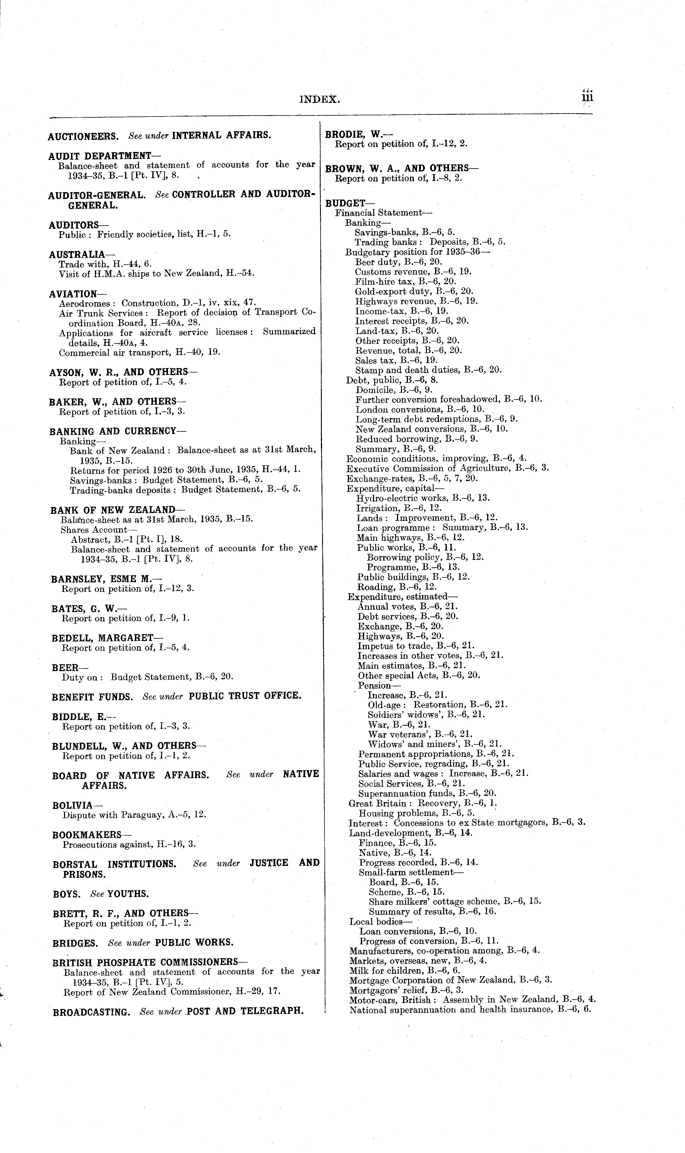 BRODIE, W,— Report on petition of, 1.-12, 2. BROWN, W. A., AND OTHERS — Report on petition of, 1.-8, 2. BUDGET— Financial Statement — Banking— Savings-banks, 8.-6, 5. Trading banks : Deposits, 8.-6, 5. Budgetary position for 1935-36 — Beer duty, 8.-6, 20. Customs revenue, 8.-6, 19. Film-hire tax, 8.-6, 20. Gold-export duty, 8.-6, 20. Highways revenue, 8.-6, 19. Income-tax, 8.—6, 19. Interest receipts, 8.-8, 20. Land-tax, 8.-6, 20. Other receipts, 8.-6, 20. Revenue, total, 8.-6, 20. Sales tax, 8.-6, 19. Stamp and death duties, 8.-6, 20. Debt, public, 8.-6, 8. Domicile, 8.-6, 9. Further conversion foreshadowed, 8.-6, 10. London conversions, 8.-6, 10. Long-term debt redemptions, 8.-6, 9. New Zealand conversions, 8.-6, 10. Reduced borrowing, 8.-6, 9. Summary, 8.-6, 9. Economic conditions, improving, 8.-6, 4. Executive Commission of Agriculture, 8.-6, 3. Exchange-rates, 8.-6, 5, 7, 20. Expenditure, capital— Hydro-electric works, 8.-G, 13. Irrigation, 8.-6, 12. Lands : Improvement, 8.-6, 12. Loan programme : Summary, 8.-6, 13. Main highways, 8.-6, 12. Public works, 8.-6, 11. Borrowing policy, 8.-6, 12. Programme, 8.-6, 13. Public buildings, 8.-6, 12. Roading, 8.-6, 12. Expenditure, estimated — Annual votes, 8.-6, 21. Debt services, 8.-6, 20. Exchange, 8.-6, 20. Highways, 8.-6, 20. Impetus to trade, 8.-6, 21. Increases in other votes, 8.-6, 21. Main estimates, 8.-6, 21. Other special Acts, 8.-6, 20. Pension — Increase, 8.-6, 21. Old-age : Restoration, 8.-6, 21. Soldiers' widows', 8.-6, 21. War, 8.-6, 21. War veterans', 8.-6, 21. Widows' and miners', 8.-6, 21. Permanent appropriations, 8.-6, 21. Public Service, regrading, 8.-6, 21. '• Salaries and wages : Increase, 8.-6, 21. Social Services, 8.-6, 21. Superannuation funds, 8.-6, 20. Great Britain : Recovery, 8.-6, 1. Housing problems, 8.-6, 5. Interest: Concessions to ex State mortgagors, 8.-6, 3. Land-development, 8.-6, 14. Finance, 8.-6, 15. Native, 8.-6, 14. > Progress recorded, 8.-6, 14. Small-farm settlement — Board, 8.-6, 15. Scheme, 8.-6, 15. Share milkers' cottage scheme, 8.-6, 15. Summary of results, 8.-6, 16. Local bodies — Loan conversions, 8.-6, 10. Progress of conversion, 8.-6, 11. Manufacturers, co-operation among, 8.-6, 4. Markets, overseas, new, 8.-6, 4. r Milk for children, 8.-6, 6. Mortgage Corporation of New Zealand, 8.-6, 3. Mortgagors' relief, 8.-6, 3. Motor-cars, British : Assembly in New Zealand, 8.-6, 4. National superannuation and health insurance, 8.-6, 6.