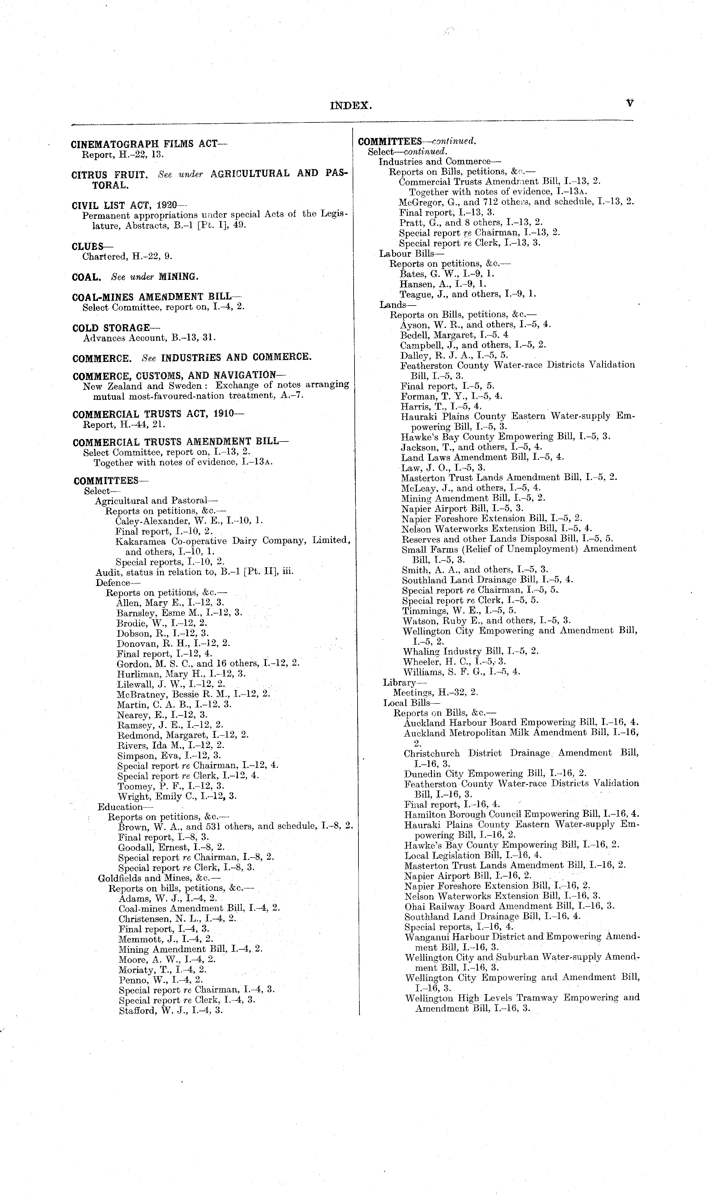 CINEMATOGRAPH FILMS ACT— Report, H.-22, 13. CITRUS FRUIT. See under AGRICULTURAL AND PASTORAL CIVIL LIST ACT 1920 Permanent appropriations under special Acts of the Legislature, Abstracts, 8.-l [Pt. I], 49. CLUBS Chartered, H.-22, 9. COAL. See under MINING. COAL-MINES AMENDMENT BILLSelect Committee, report on, 1.-4, 2. COLD STORAGE— Advances Account, 8.—13, 31. COMMERCE. See INDUSTRIES AND COMMERCE. COMMERCE, CUSTOMS, AND NAVIGATION— . New Zealand and Sweden : Exchange of notes arranging mutual most-favoured-nation treatment, A.-7. COMMERCIAL TRUSTS ACT, 1910— Report, H.—44, 21. COMMERCIAL TRUSTS AMENDMENT BILL— o 7n , _ T io ;> Select Committee, report on 1.-13, 2 Together with notes of evidence, 1.—13 a. COMMITTEES Select Agricultural and Pastoral— Reports on petitions, &c.— Caley-Alexander. W. E., 1.-10, 1. Final report, 1.-10, 2. Kakaramea Co-operative Dairy Company, Limited, and others, 1.-10, 1. Special reports, 1.-10, 2. Audit, status in relation to, 8.-l [Pt. ll], iii. Defence Reports on petitions, &c. — Allen, Mary E„ 1.-12, 3. Barnsley, Esine M., 1.-12, 3. Brodie, W„ 1.-12, 2. Dobson, R.', 1,— 12, 3. Donovan, R. H., 1.-12, 2. Final report, 1.-12, 4. Gordon. M. S. C., and 16 others, 1.-12, 2. Hurliman. Mary H„ 1.-12, 3. Lilewall, J. W„ 1.-12, 2. Mcßratney, Bessie R. M„ 1.-12, 2. Martin, C. A. B„ 1.-12, 3. Nearey, E., 1.-12, 3. Ramsey, J. E., 1.-12, 2. Redmond, Margaret, 1.-12, 2. Rivers, Ida M., 1.-12, 2.2 Simpson, Eva, 1.-12, 3. Special report re Chairman, 1.-12, 4. Special report re Clerk, 1.-12, 4. Toomey, P. F., 1.—12, 3. Wright, Emily C., 1.—12, 3. Education— " Reports on petitions, &c.— Brown, W. A., and 531 others, and schedule, 1.-8, 2. Final report, 1.-8, 3. Goodall, Ernest, 1.-8, 2. Special report re Chairman, 1.-8, 2. Special report re Clerk, 1.-8, 3. Goldfields and Mines, &c.— Reports on bills, petitions, &c.— Adams, W. J.. 1.-4. 2. Coal-mines Amendment Bill, L-4, 2. Christensen, N. L., 1.-4, 2. Final report, 1,-4, 3. Memmott, J., 1.-4, 2. Mining Amendment Bill, 1.—4, 2. Moore A. W., 1.-4, 2. Moriaty, T., Ī.-4, 2. Penno, W., 1.-4, 2. Special report re Chairman, 1.—4, 3. Special report re Clerk, 1.-4, 3. Stafford, W. J., 1.-4, 3.