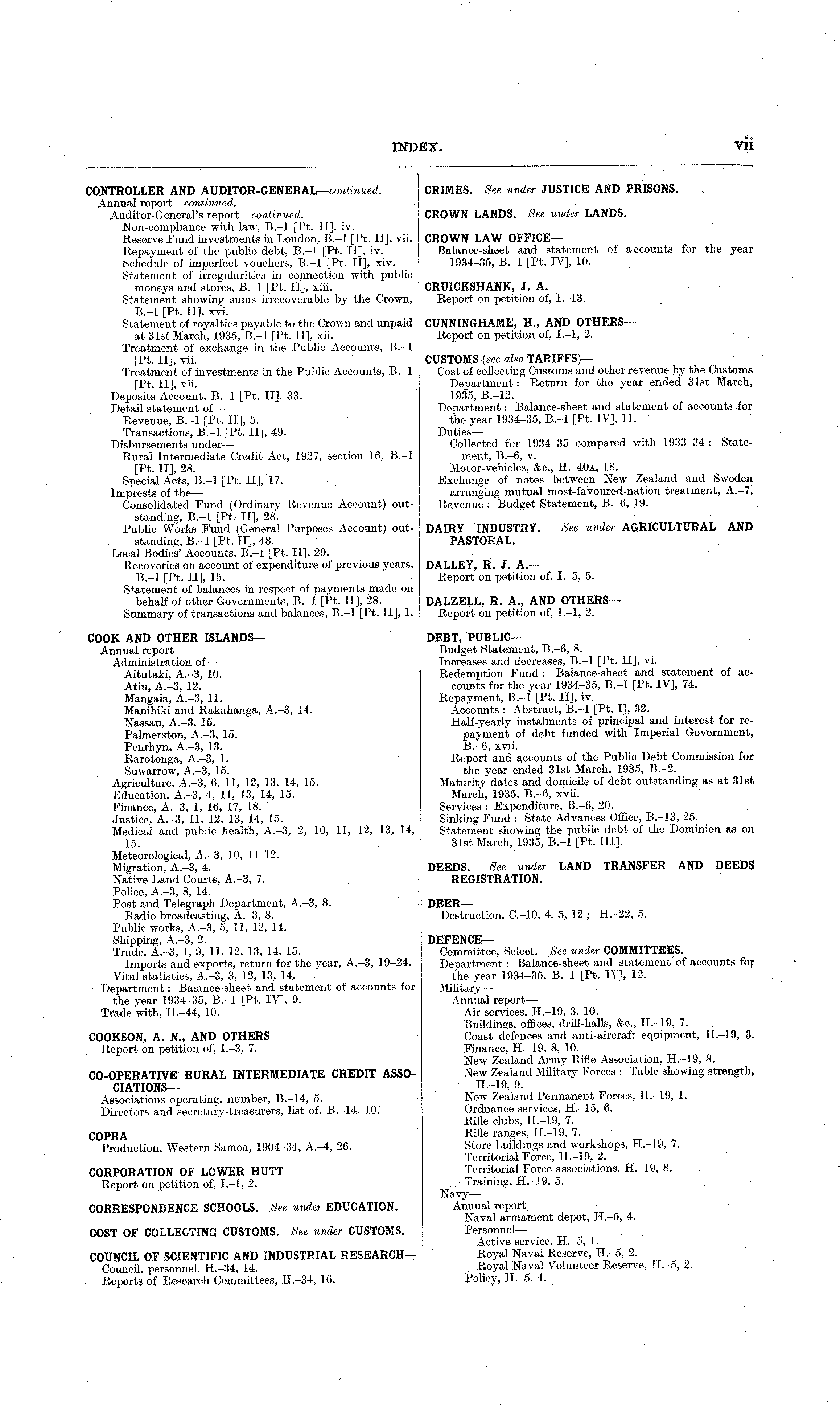 CONTROLLER AND AUDITOR-GENERAL—continued. Annual report—continued. Auditor-General's report—continued. Non-compliance with law, 8.-l [Pt. ll], iv. Reserve Fund investments in London, 8.-l [Pt. ll], vii. Repayment of the public debt, B.—l [Pt. ll], iv. Schedule of imperfect vouchers, 8.-l [Pt. ll], xiv. Statement of irregularities in connection with public moneys and stores, 8.-l [Pt. ll], xiii. Statement showing sums irrecoverable by the Crown, 8.-l [Pt. ll], xvi. Statement of royalties payable to the Crown and unpaid at 31st March, 1935, 8.-l [Pt. ll], xii. Treatment of exchange in the Public Accounts, 8.-l [Pt. ll], vii. ~ Treatment of investments in the Public Accounts, 8.-l [Pt. ll], vii. Deposits Account, 8.-l [Pt. ll], 33. Detail statement of— Revenue, 8.-l [Pt. ll], 5. Transactions, 8.-l [Pt. ll], 49. Disbursements under — Rural Intermediate Credit Act, 1927, section 16, 8.-l [Pt. ll], 28. Special Acts, 8.-l [Pt. ll], 17. Imprests of the— Consolidated Fund (Ordinary Revenue Account) outstanding, 8.-l [Pt. ll], 28. Public Works Fund (General Purposes Account) outstanding, 8.-l [Pt. ll], 48. Local Bodies' Accounts, 8.-l [Pt. ll], 29. Recoveries on account of expenditure of previous years, 8.-l [Pt. ll], 15. Statement of balances in respect of payments made on behalf of other Governments, 8.-l [Pt. ll], 28. Summary of transactions and balances, 8.-l [Pt. ll], 1. COOK AND OTHER ISLANDS— Annual report — Administration of— Aitutaki, A.-3, 10. Atiu, A.-3, 12. Mangaia, A.-3, 11. Manihiki and Rakahanga, A.-3, 14. Nassau, A.-3, 15. Palmerston, A.-3, 15. Penrhyn, A.-3, 13. Rarotonga, A.-3, 1. Suwarrow, A.-3, 15. Agriculture, A.-3, 6, 11, 12, 13, 14, 15. Education, A.—3, 4, 11, 13, 14, 15. Finance, A.-3, 1, 16, 17, 18. Justice, A.-3, 11. 12, 13, 14, 15. Medical and public health, A.-3, 2, 10, 11, 12, 13, 14, 15. Meteorological, A.-3, 10, 11 12. Migration, A.-3, 4. Native Land Courts, A.-3, 7. Police, A.-3, 8, 14. Post and Telegraph Department, A.-3, 8. Radio broadcasting, A.-3, 8. Public works, A.-3, 5, 11, 12, 14. Shipping, A.-3, 2. Trade, A.-3, 1, 9, 11, 12, 13, 14, 15. Imports and exports, return for the year, A.-3, 19-24. Vital statistics, A.-3, 3, 12, 13, 14. Department: Balance-sheet and statement of accounts for the year 1934-35, 8.-l [Pt. IV], 9. Trade with, H.-44, 10. COOKSON, A. N„ AND OTHERS— Report on petition of, 1.-3, 7. CO-OPERATIVE RURAL INTERMEDIATE CREDIT ASSOCIATIONS Associations operating, number, 8.-14, 5. Directors and secretary-treasurers, list of, 8.-14, 10. COPRA Production, Western Samoa, 1904-34, A.-4, 26. CORPORATION OF LOWER HUTT— Report on petition of, 1.-l, 2. CORRESPONDENCE SCHOOLS. See under EDUCATION. COST OF COLLECTING CUSTOMS. See under CUSTOMS. COUNCIL OF SCIENTIFIC AND INDUSTRIAL RESEARCH— Council, personnel, H.-34, 14. Reports of Research Committees, H.-34, 16,