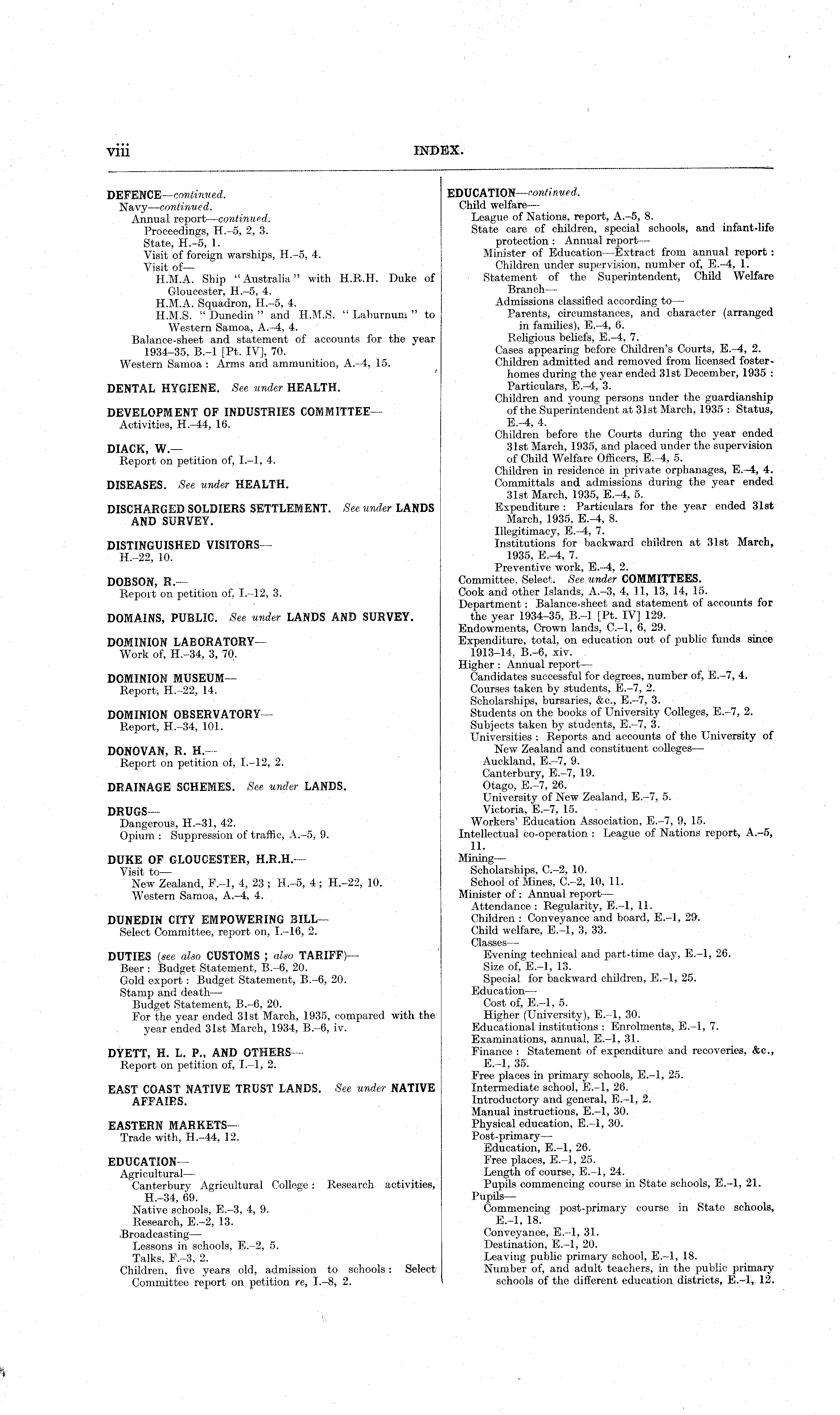 DEFENCE—continued. Navy—continued. Annual report—continued. Proceedings, H.-5, 2, 3. State, H.-5, 1. Visit of foreign warships, H.-5, 4. Visit of H.M.A. Ship "Australia" with H.R.H. Duke of Gloucester, H.-5, 4. H.M.A. Squadron, H.-5, 4. H.M.S. " Dunedin " and H.M.S. " Laburnum " to Western Samoa, A.-4, 4. Balance-sheet and statement of accounts for the year 1934-35, 8.-l [Pt. IV], 70. * Western Samoa : Arms and ammunition, A.-4, 15. DENTAL HYGIENE. See under HEALTH. DEVELOPMENT OF INDUSTRIES COMMITTEE— Activities, H.-44, 16. DIACK W. Report on petition of, 1.-l, 4. DISEASES. See under HEALTH. DISCHARGED SOLDIERS SETTLEMENT. See under LANDS AND SURVEY. DISTINGUISHED VISITORS — H.-22, 10. DOBSON, R. — Report on petition of, 1.-12, 3. DOMAINS, PUBLIC. See under LANDS AND SURVEY. DOMINION LABORATORY — Work of, H.-34, 3, 70. DOMINION MUSEUM — Report; H.-22, 14. DOMINION OBSERVATORY— Report, H.-34, 101. DONOVAN, R. H. — Report on petition of, 1,— 12, 2. DRAINAGE SCHEMES. See under LANDS. DRUGS — Dangerous, H.-31, 42. Opium : Suppression of traffic, A.-5, 9. DUKE OF GLOUCESTER, H.R.H.— Visit to — New Zealand, F.-l, 4, 23 ; H.-5, 4; H.-22, 10. Western Samoa, A.-4, 4. DUNEDIN CITY EMPOWERING BILL— Select Committee, report on, 1.—16, 2. DUTIES (see also CUSTOMS ; also TARIFF)— Beer : Budget Statement, 8.-6, 20. Gold export : Budget Statement, 8.-6, 20. Stamp and death — Budget Statement, 8.-6, 20. For the year ended 31st March, 1935, compared with the year ended 31st March, 1934, 8.-6, iv. DYETT, H. L. P., AND OTHERS — Report on petition of, 1.-l, 2. EAST COAST NATIVE TRUST LANDS. See under NATIVE AFFAIRS. EASTERN MARKETS — Trade with, H.-44, 12. EDUCATION— Agricultural— Canterbury Agricultural College : Research activities, H.-34, 69. ' Native schools, E.-3, 4, 9. Research, E.-2, 13. -Broadcasting— Lessons in schools, E.-2, 5. Talks, F.-3, 2. Children, five years old, admission to schools : Select Committee report on petition re, 1.-8, 2.