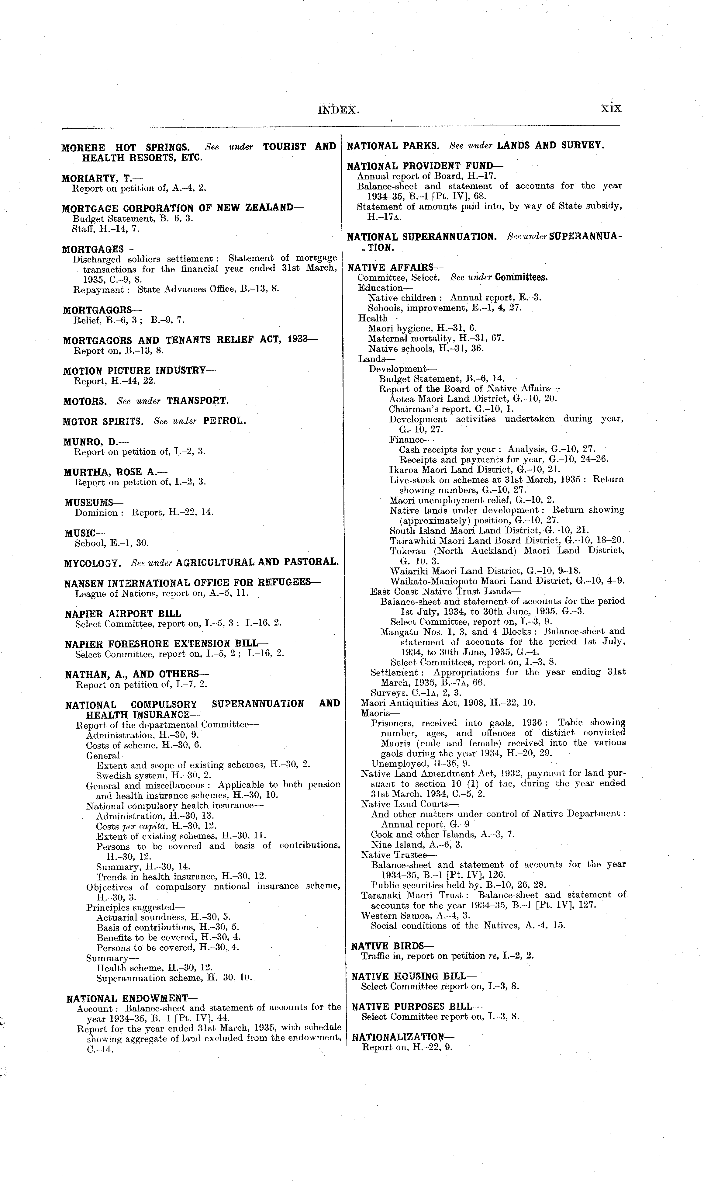 MORERE HOT SPRINGS. See under TOURIST AND HEALTH RESORTS, ETC. MORIARTY, T. Report on petition of A -4, 2 MORTGAGE CORPORATION OF NEW ZEALAND— Budget Statement, 8.-6, 3. Staff, H.-14, 7. MORTGAGES— Discharged soldiers settlement : Statement of mortgage transactions for the financial year ended 31st March, 1935 C.-9, 8. Repayment: State Advances Office, 8.-13, 8. MORTGAGORS Relief, 8.-6, 3 ; 8.-9, 7. MORTGAGORS AND TENANTS RELIEF ACT, 1933— Report on, 8.-13, 8. MOTION PICTURE INDUSTRY— Report, H.-44, 22. MOTORS. See under TRANSPORT. MOTOR SPIRITS. See unier PETROL. MUNRO, D.— Report on petition of, 1.-2, 3. MURTHA, ROSE A. Report on petition of, 1.—2, 3. MUSEUMS Dominion : Report, H.-22, 14. MUSIC School, E.-l, 30. MYCOLOGY. See under AGRICULTURAL AND PASTORAL. NANSEN INTERNATIONAL OFFICE FOR REFUGEES — League of Nations, report on, A.-5, 11. NAPIER AIRPORT BILL — Select Committee, report on, 1.-5, 3 ; 1.-16, 2. NAPIER FORESHORE EXTENSION BILL — Select Committee, report on, 1.-5, 2 ; Ī.-16, 2. NATHAN A., AND OTHERS — Report on petition of, 1.-7, 2. NATIONAL COMPULSORY SUPERANNUATION AND HEALTH INSURANCE— Report of the departmental Committee — Administration, H.-30, 9. Costs of scheme. H.-30, 6. General Extent and scope of existing schemes, H.-30, 2. Swedish system, H.-30, 2. General and miscellaneous : Applicable to both pension and health insurance schemes, H.—3o, 10. National compulsory health insurance— Administration, H.-30, 13. Costs per capita, H.-30, 12. Extent of existing schemes, H.-30, 11. Persons to be covered and basis of contributions, H.-30, 12. Summary, H.-30, 14. Trends in health insurance, H.-30, 12. Objectives of compulsory national insurance scheme, H —30. 3. ' Principles suggested— Actuarial soundness, H.—3o, 5. Basis of contributions, H.-30, 5. Benefits to be covered, H.-30, 4. Persons to be covered, H.-30, 4. Summary Health scheme, H.-30, 12. Superannuation scheme, H.-30, 10. NATIONAL ENDOWMENT Account : Balance-sheet and statement of accounts for the year 1934-35, 8.-l [Pt. IV], 44. Report for the year ended 31st March, 1935, with schedule showing aggregate of land excluded from the endowment, C.-14. ° '