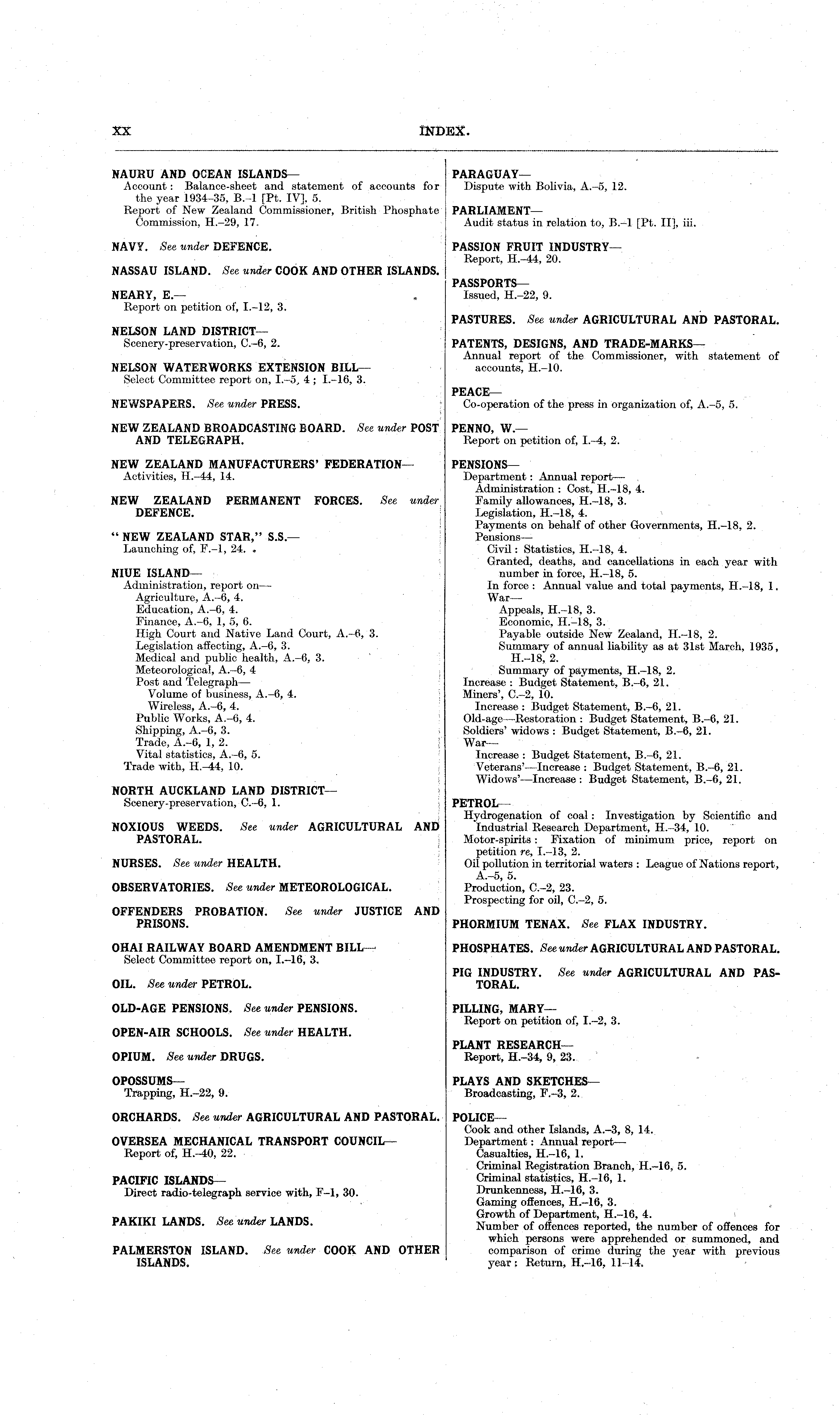 PARAGUAY — Dispute with Bolivia, A.-5, 12. PARLIAMENT — Audit status in relation to, B. l [Pt. ll], iii. PASSION FRUIT INDUSTRY— Report, H.-44, 20. PASSPORTS — Issued, H.-22, 9. PASTURES. See under AGRICULTURAL AND PASTORAL. PATENTS, DESIGNS, AND TRADE-MARKS— Annual report of the Commissioner, with statement of accounts, H.-10. PEACE-Co-operation of the press in organization of, A.-5, 5. PENNO, W.— Report on petition of, 1.-4, 2. PENSIONS— Department: Annual report— Administration : Cost, H.-18, 4. Family allowances, H. 18, 3. Legislation, H.-l 8, 4. Payments on behalf of other Governments, H.-18, 2. PensionsCivil: Statistics, H.-18, 4. Granted, deaths, and cancellations in each year with number in force, H.-18, 5. In force : Annual value and total payments, H.-18, 1. War — Appeals, H.-18, 3. Economic, H.-18, 3. Payable outside New Zealand, H.-18, 2. Summary of annual liability as at 31st March, 1935, H.-18, 2. Summary of payments, H.-18, 2. Increase : Budget Statement, 8.-6, 21. Miners', C.—2, 10. Increase : Budget Statement, 8.-6, 21. Old-age—Restoration : Budget Statement, 8.-6, 21. Soldiers' widows : Budget Statement. 8.—6, 21. WarIncrease : Budget Statement, 8.-6, 21. Veterans'—lncrease : Budget Statement, 8.-6, 21. Widows'—Increase : Budget Statement, 8.-6, 21. PETROL — Hydrogenation of coal: Investigation by Scientific and Industrial Research Department, H.-34, 10. Motor-spirits: Fixation of minimum price, report on petition re, 1.—13, 2. Oil pollution in territorial waters : League of Nations report, A—s 5. Production, C.-2, 23. Prospecting for oil, C.-2, 5. PHORMIUM TENAX. See, FLAX INDUSTRY. PHOSPHATES. See under AGRICULTURAL AND PASTORAL. PIG INDUSTRY. See under AGRICULTURAL AND PASTORAL. PILLING, MARY— Report on petition of, 1.-2, 3. PLANT RESEARCHReport, H.-34, 9, 23. PLAYS AND SKETCHES— Broadcasting, F.-3, 2. POLICE— Cook and other Islands, A.-3, 8, 14. Department: Annual reportsCasualties, H.-16, 1. Criminal Registration Branch, H.—l6, 5. Criminal statistics, H.-16, 1. Drunkenness, H.—l6, 3. Gaming offences, H.—l6, 3. Growth of Department, H.-16, 4. Number of offences reported, the number of offences for which persons were apprehended or summoned, and comparison of crime during the year with previous year: Return, H.-16, 11-14,