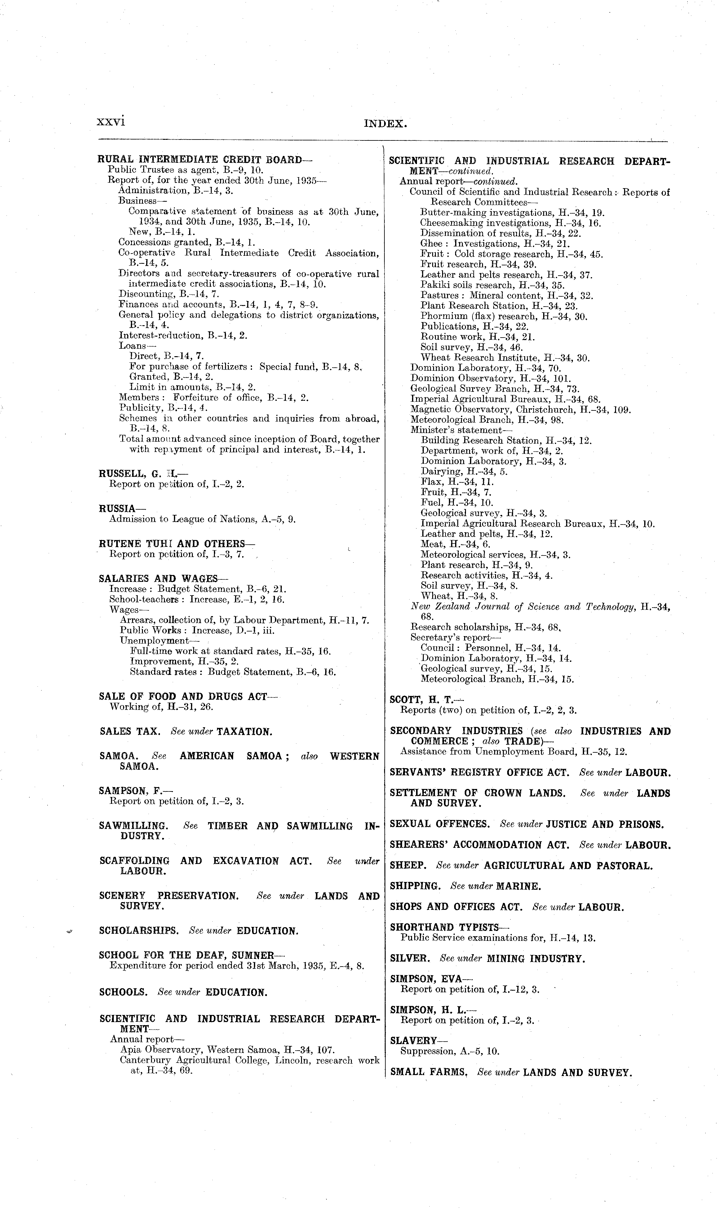 RURAL INTERMEDIATE CREDIT BOARD— Public Trustee as agent, 8.-9, 10. Report of, for the year ended 30th June, 1935— Administration, 8.-14, 3. Business—Comparative statement of business as at 30th June, 1934, and 30th June, 1935, 8.-14, 10. New, 8.-14, 1. Concessions granted, 8.-14, 1. Co-operative Rural Intermediate Credit Association, 8.-14, 5. Directors and secretary-treasurers of co-operative rural intermediate credit associations, 8.-14, 10. Discounting, 8.-14, 7. Finances and accounts, 8.-14, 1, 4, 7, 8-9. General policy and delegations to district organizations, 8.-14, 4. Interest-reduction, 8.-14, 2. Loans— Direct, 8.-14, 7. For purchase of fertilizers : Special fund, 8.-14, 8. Granted, 8.-14, 2. Limit in amounts, 8.-14, 2. Members : Forfeiture of office, 8.-14, 2. Publicity, 8.-14, 4. Schemes in other countries and inquiries from abroad, 8.-14, 8. Total amount advanced since inception of Board, together with repvyment of principal and interest, 8.-14, 1. RUSSELL, G. ll.— Report on petition of, 1.-2, 2. RUSSIA- . , . T . . Admission to League of Nations, A.-5, 9. RUTENE TUHĪ AND OTHERS— Report on petition of, 1.-3, 7. SALARIES AND WAGES— Increase : Budget Statement, 8.-6, 21. School-teachers : Increase, E.-l, 2, 16. Wages Arrears, collection of, by Labour Department, H.-11, 7. Public Works : Increase, D.-l, iii. Unemployment— Full-time work at standard rates, H.-35, 16. Improvement, 11. 35, 2. Standard rates : Budget Statement, 8.-6, 16. SALE OF FOOD AND DRUGS ACT— Working of, H.-31, 26. SALES TAX. See under TAXATION. SAMOA. See AMERICAN SAMOA; also WESTERN SAMOA SAMPSON, F— Report on petition of, 1.-2, 3. SAWMILLING. See TIMBER AND SAWMILLING INDCSTRY. SCAFFOLDING AND EXCAVATION ACT. See under LABOUR. SCENERY PRESERVATION. See under LANDS AND SURVEY. SCHOLARSHIPS. See under EDUCATION. SCHOOL FOR THE DEAF, SUMNER— Expenditure for period ended 31st March, 1935, E,-4, 8. SCHOOLS. See under EDUCATION. SCIENTIFIC AND INDUSTRIAL RESEARCH DEPARTMENT— Annual report— Apia Observatory, Western Samoa, H.-34, 107. Canterbury Agricultural College, Lincoln, research work at, H.-34, 69.